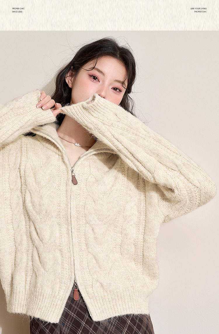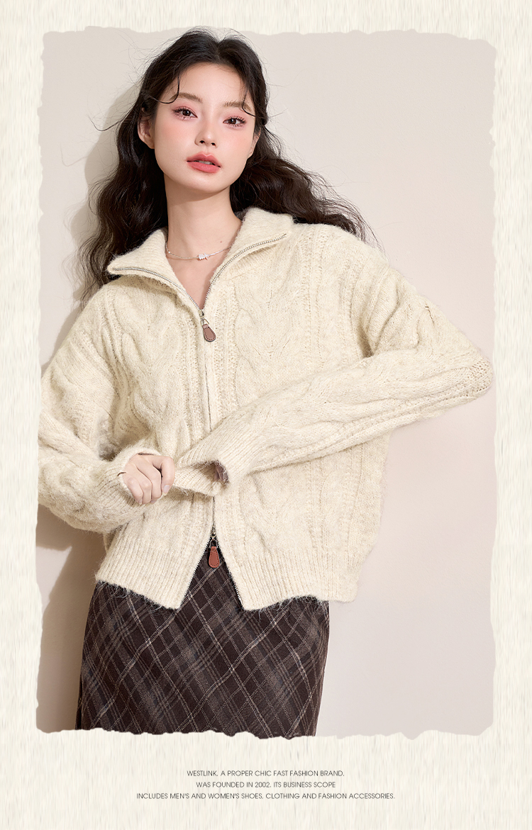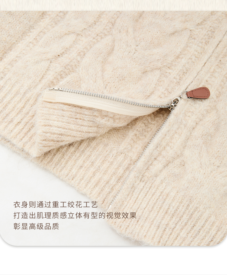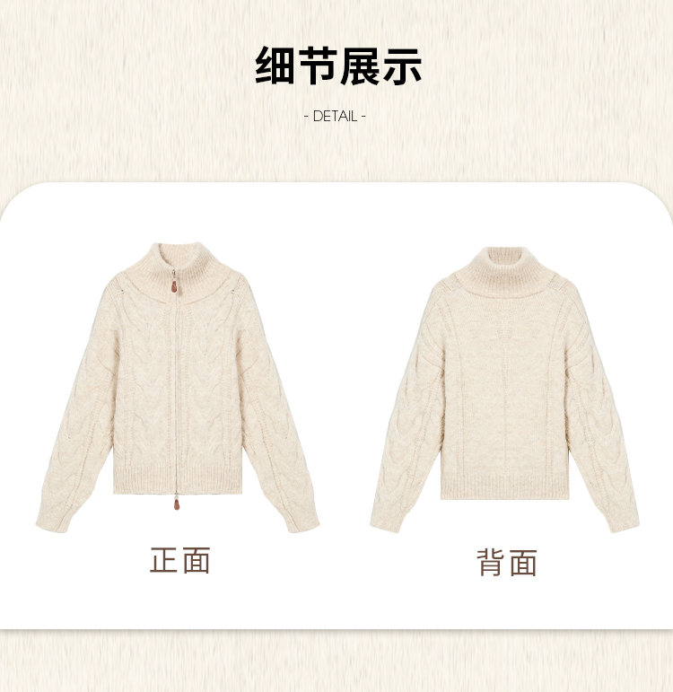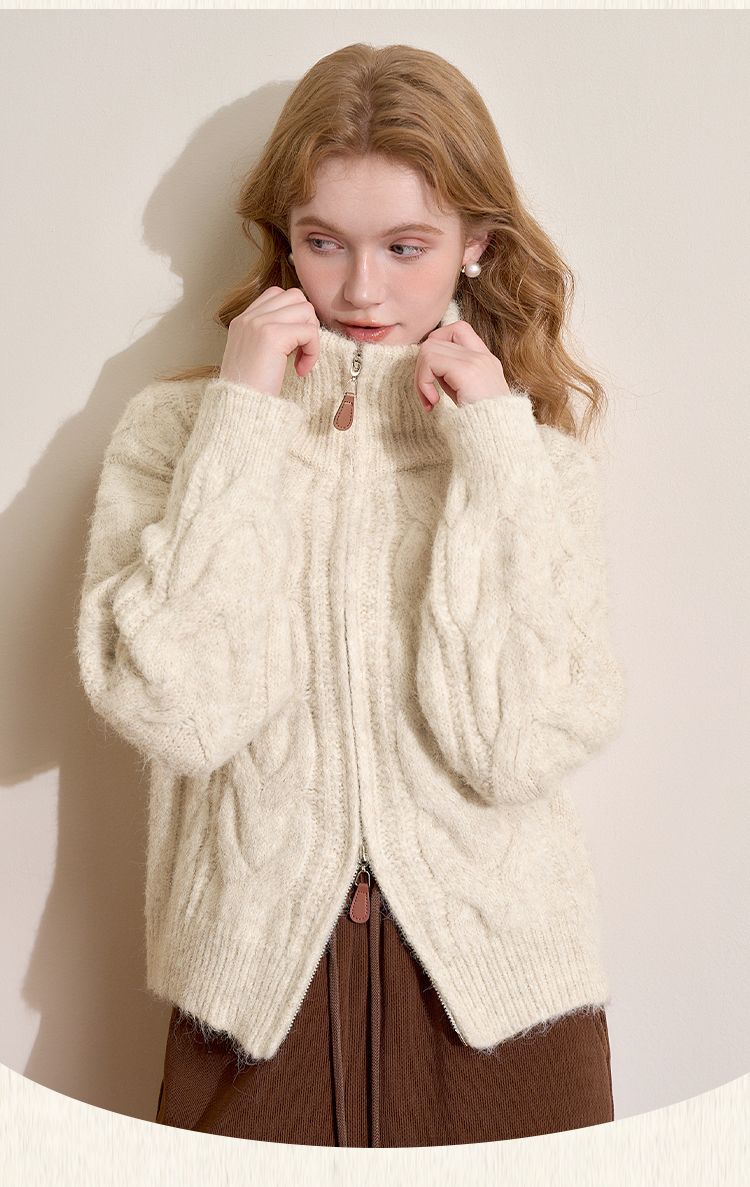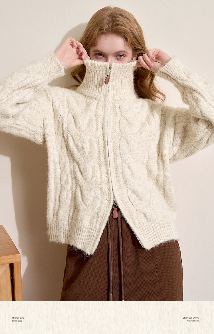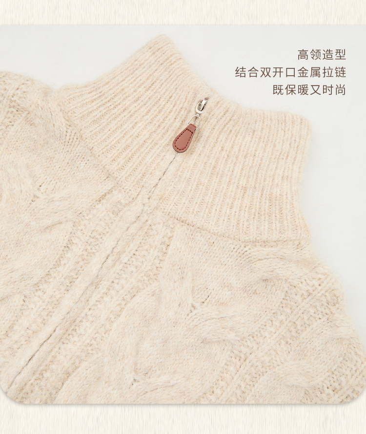 西遇短款开衫外套女2024年冬季新款高领双拉链设计麻花针织上衣D0043999