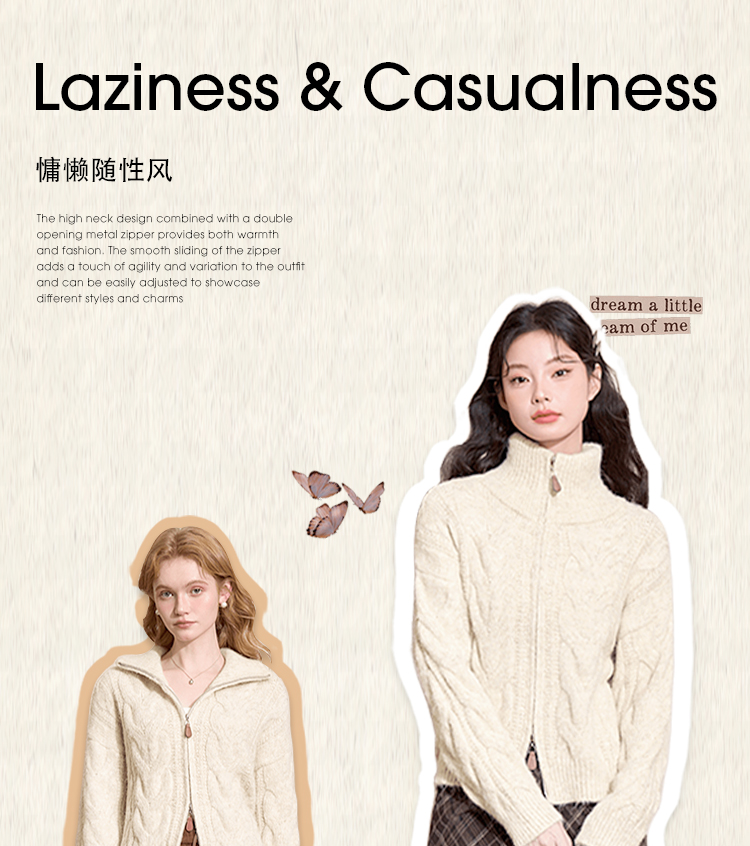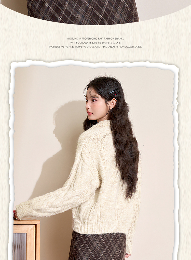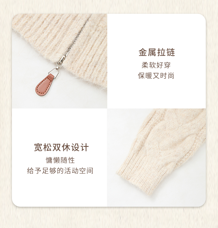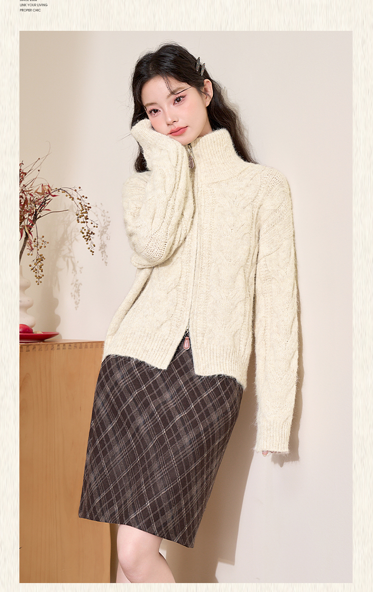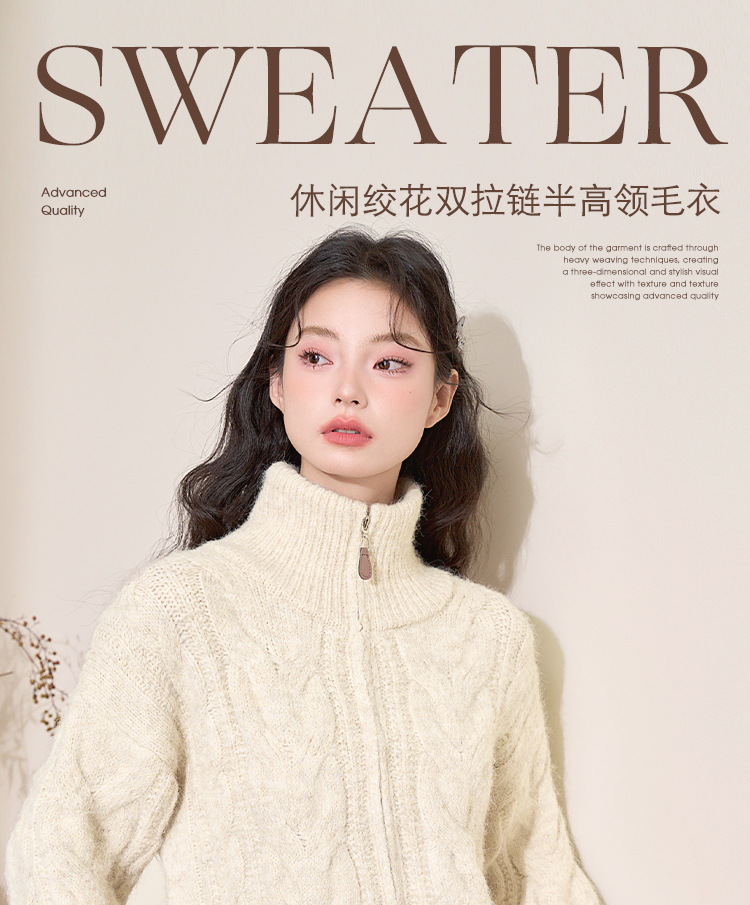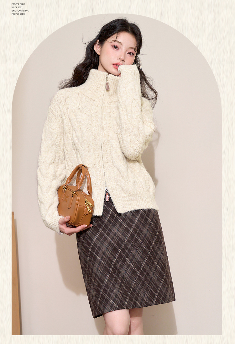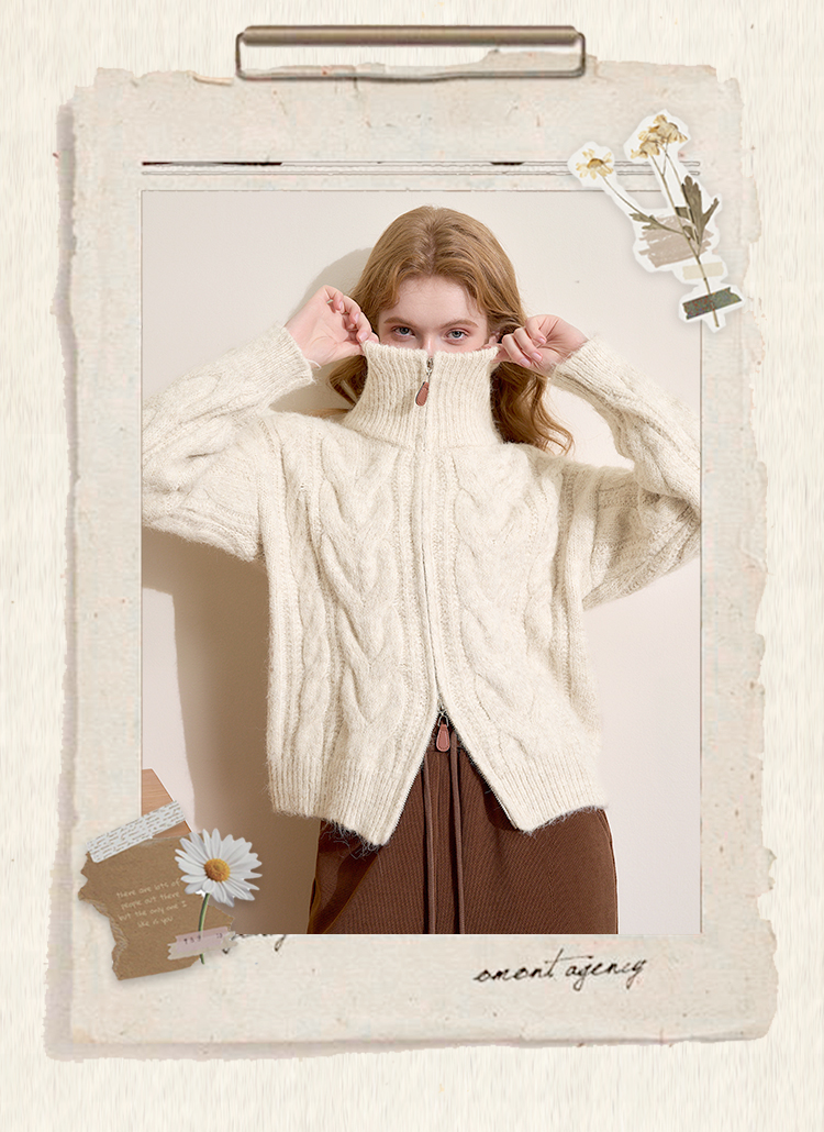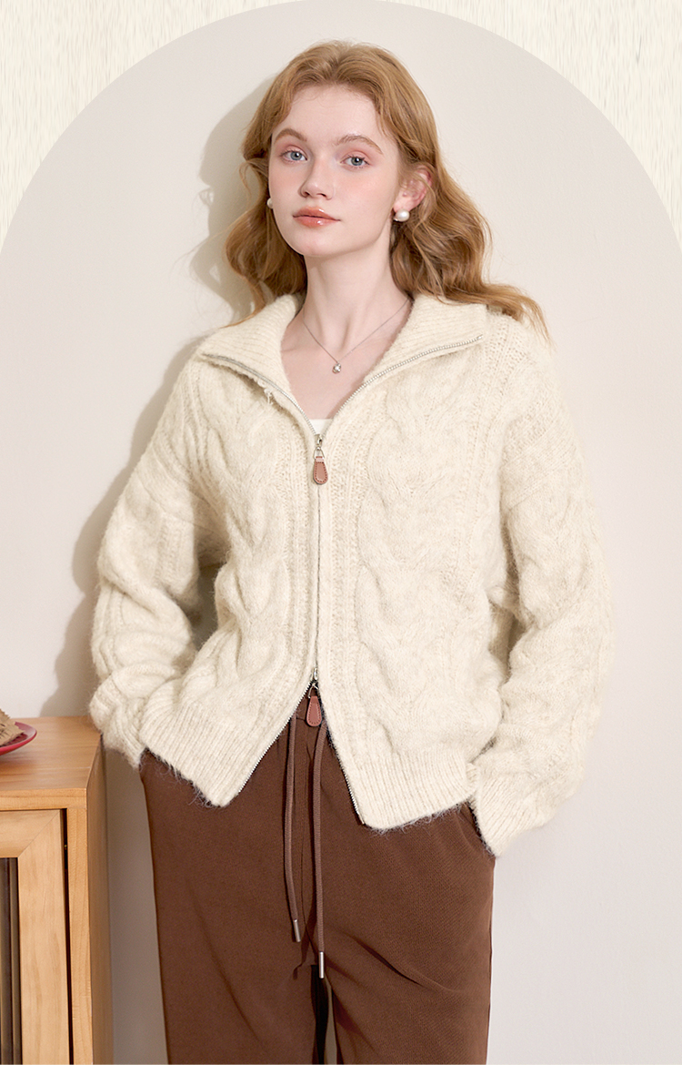 西遇短款开衫外套女2024年冬季新款高领双拉链设计麻花针织上衣D0043999