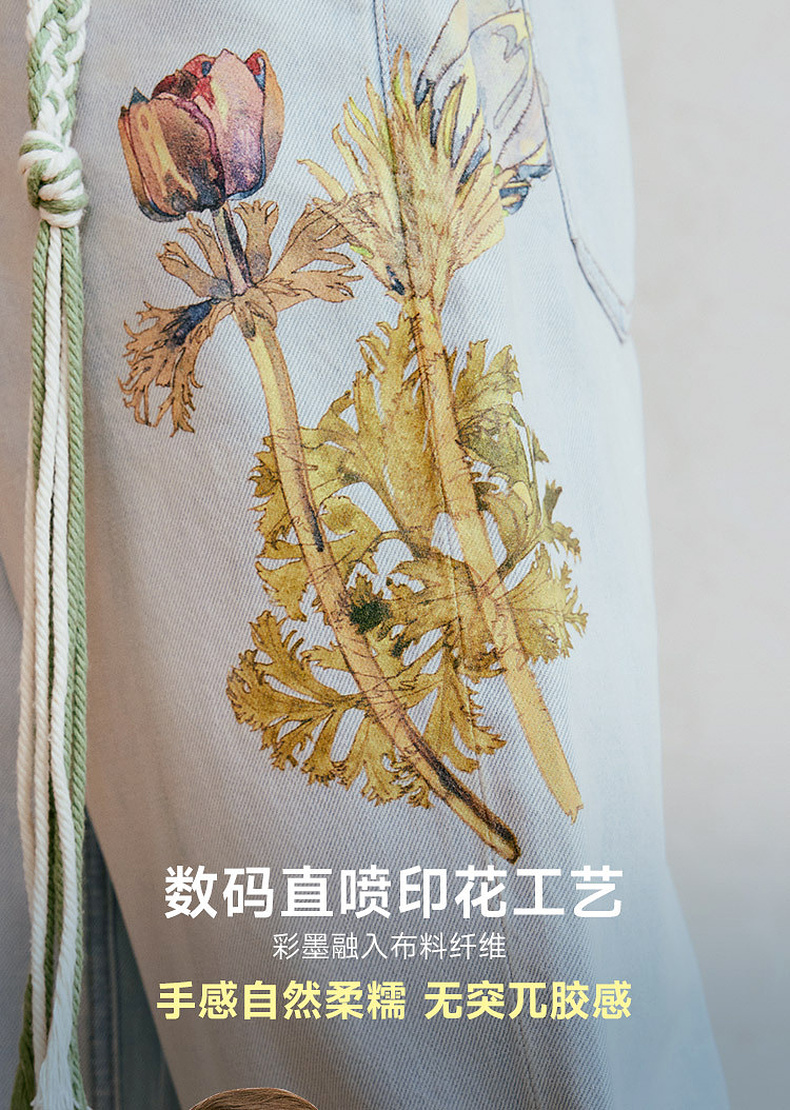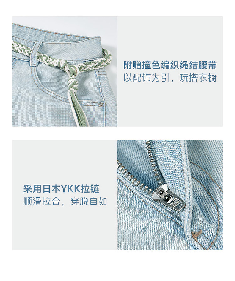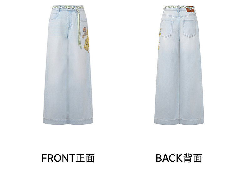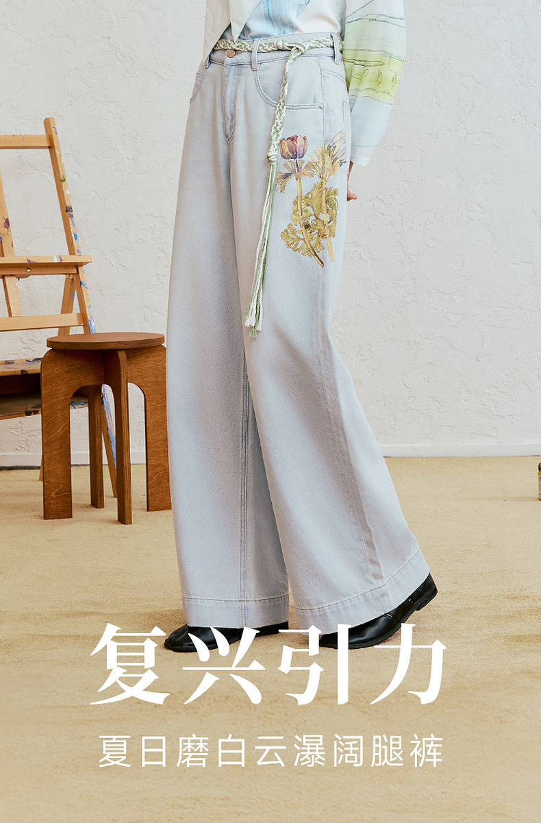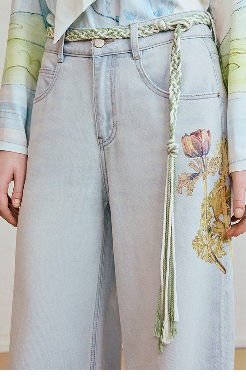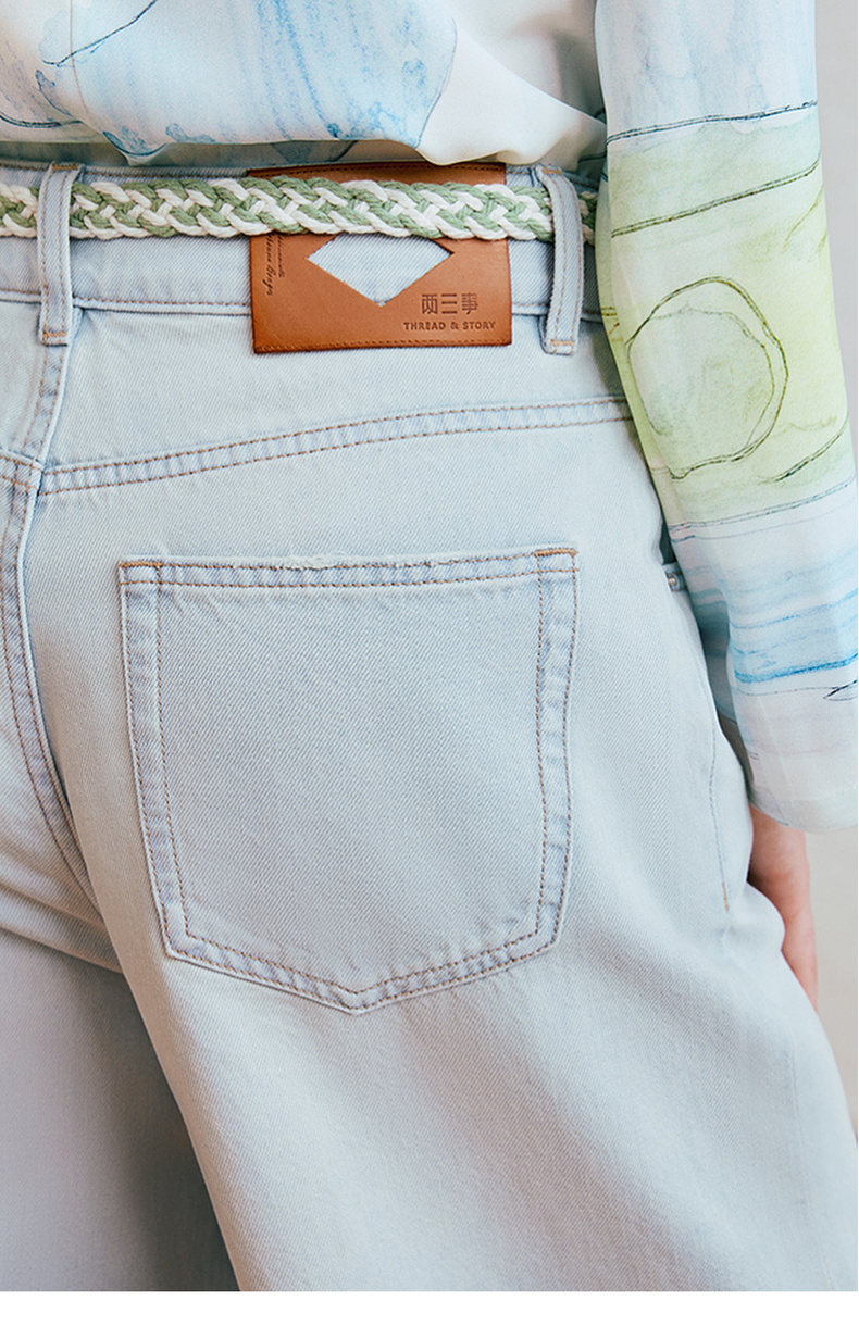 两三事 复兴引力 2025夏季新款休闲编织腰绳装饰印花直筒牛仔裤女