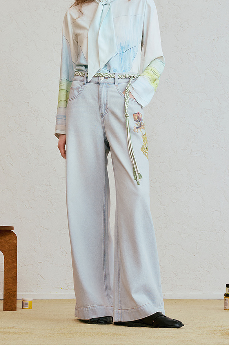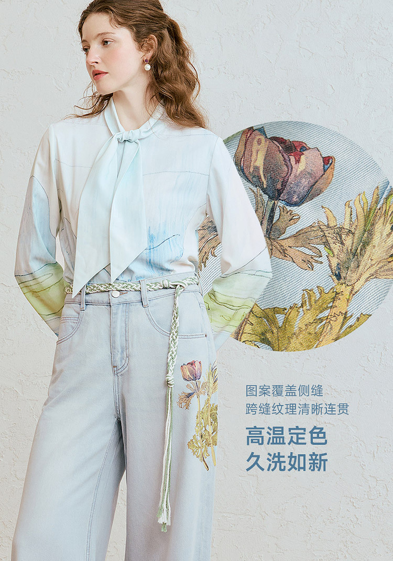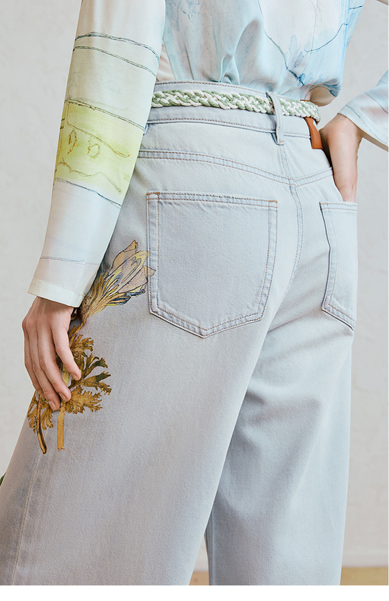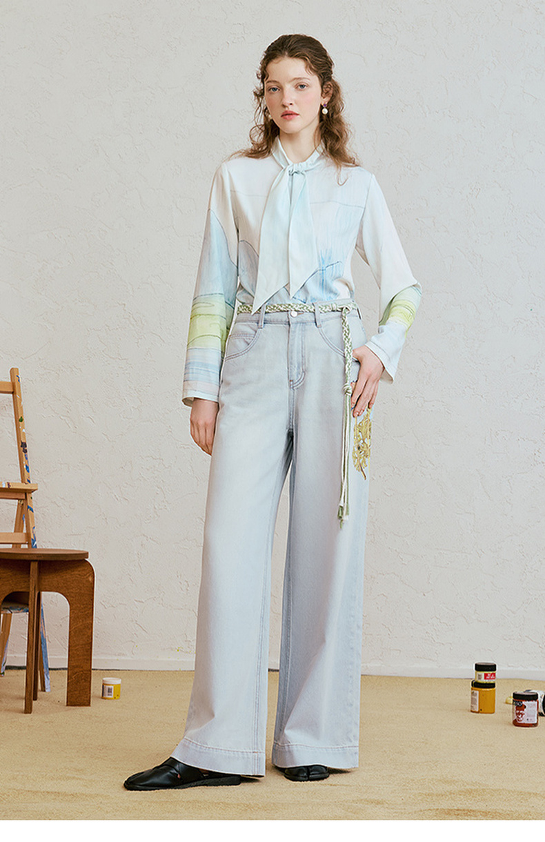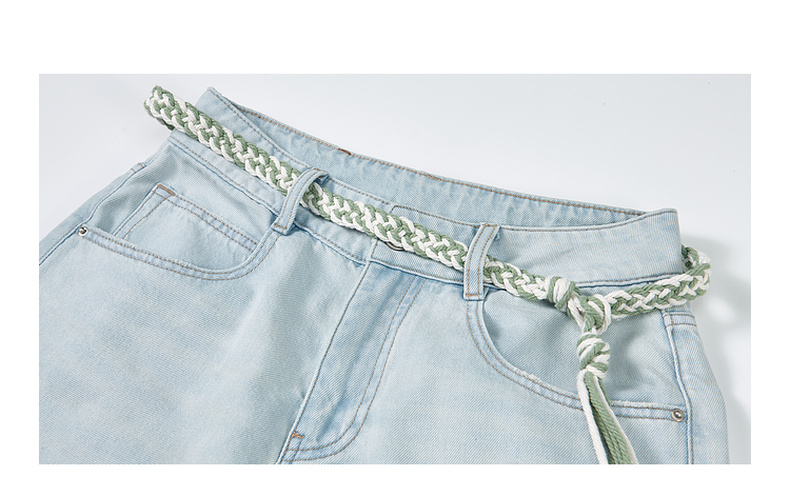 两三事 复兴引力 2025夏季新款休闲编织腰绳装饰印花直筒牛仔裤女
