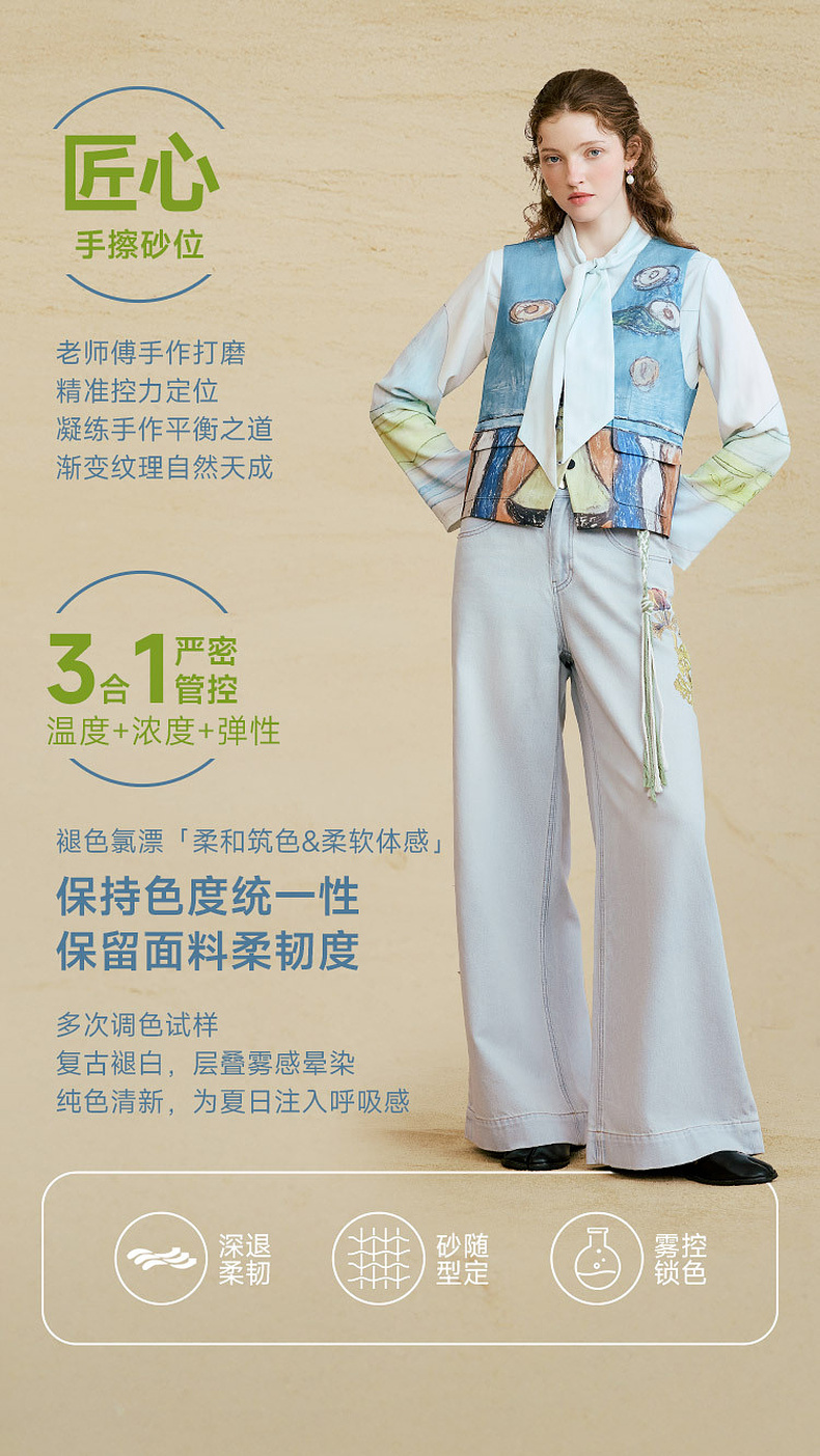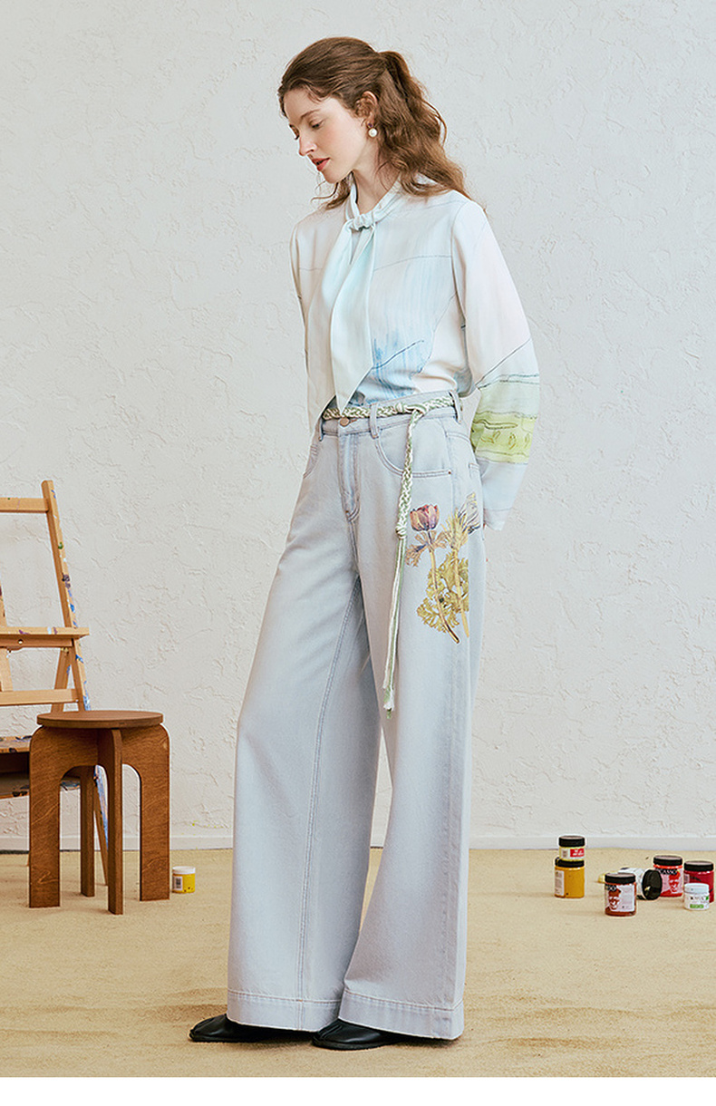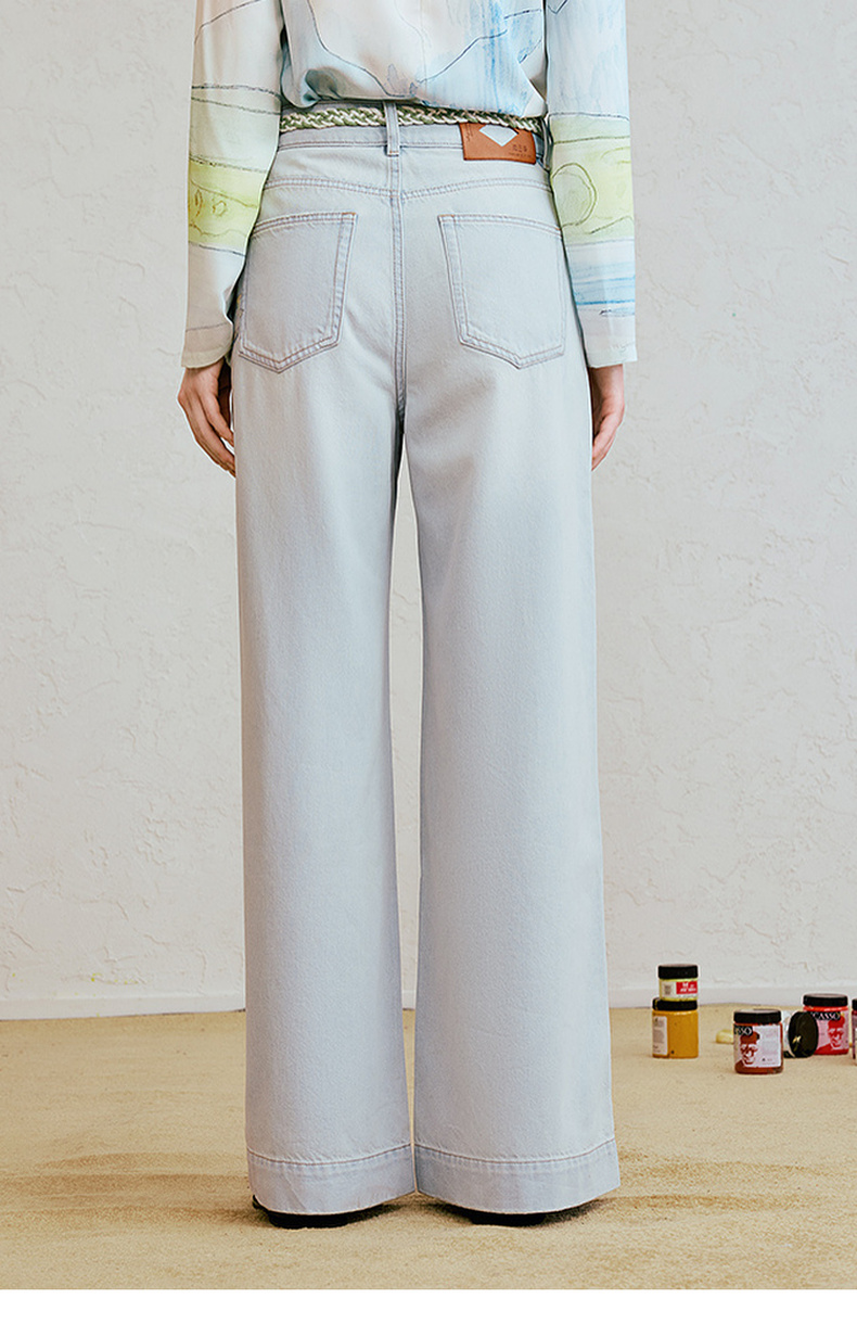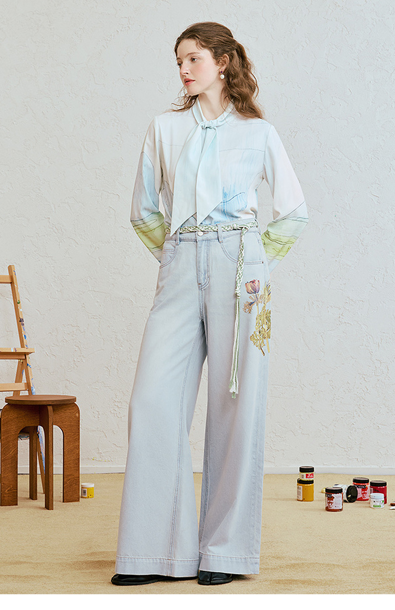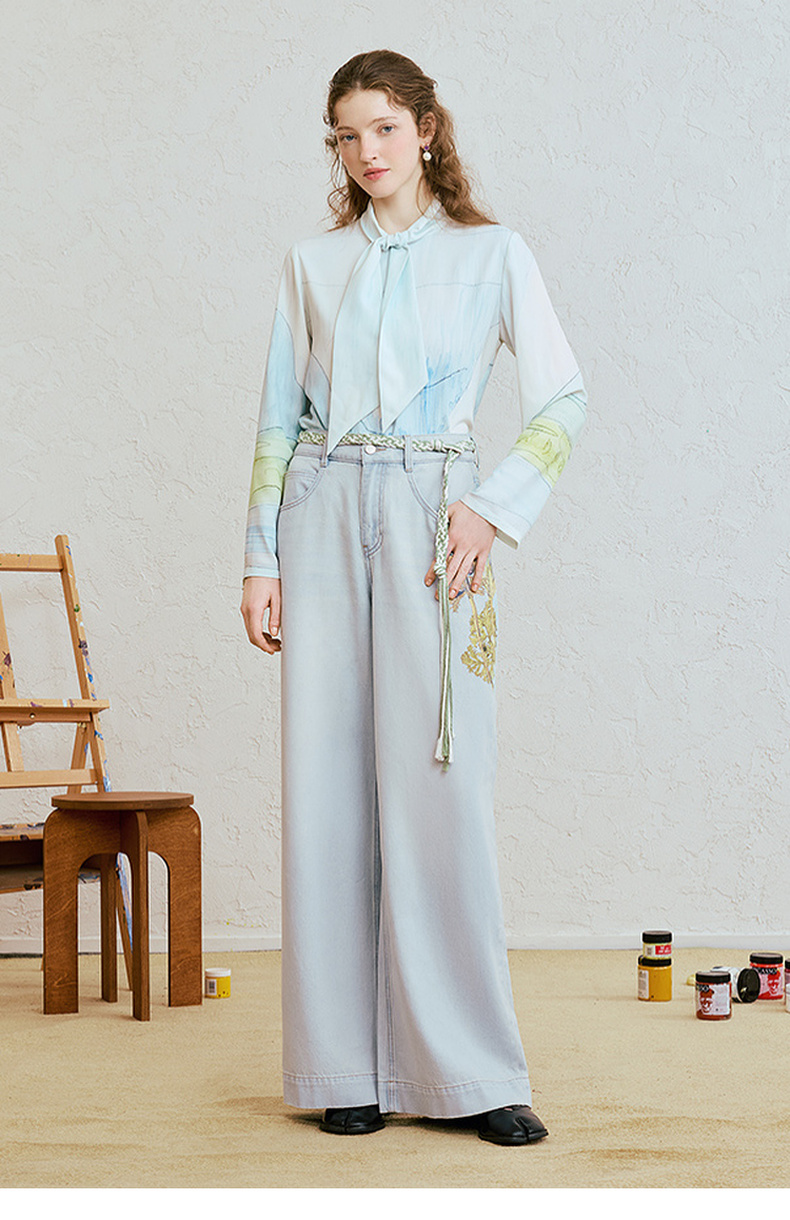 两三事 复兴引力 2025夏季新款休闲编织腰绳装饰印花直筒牛仔裤女