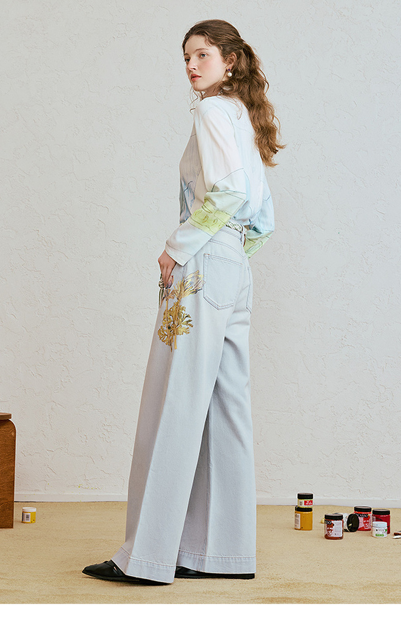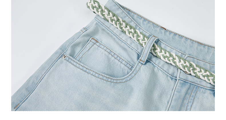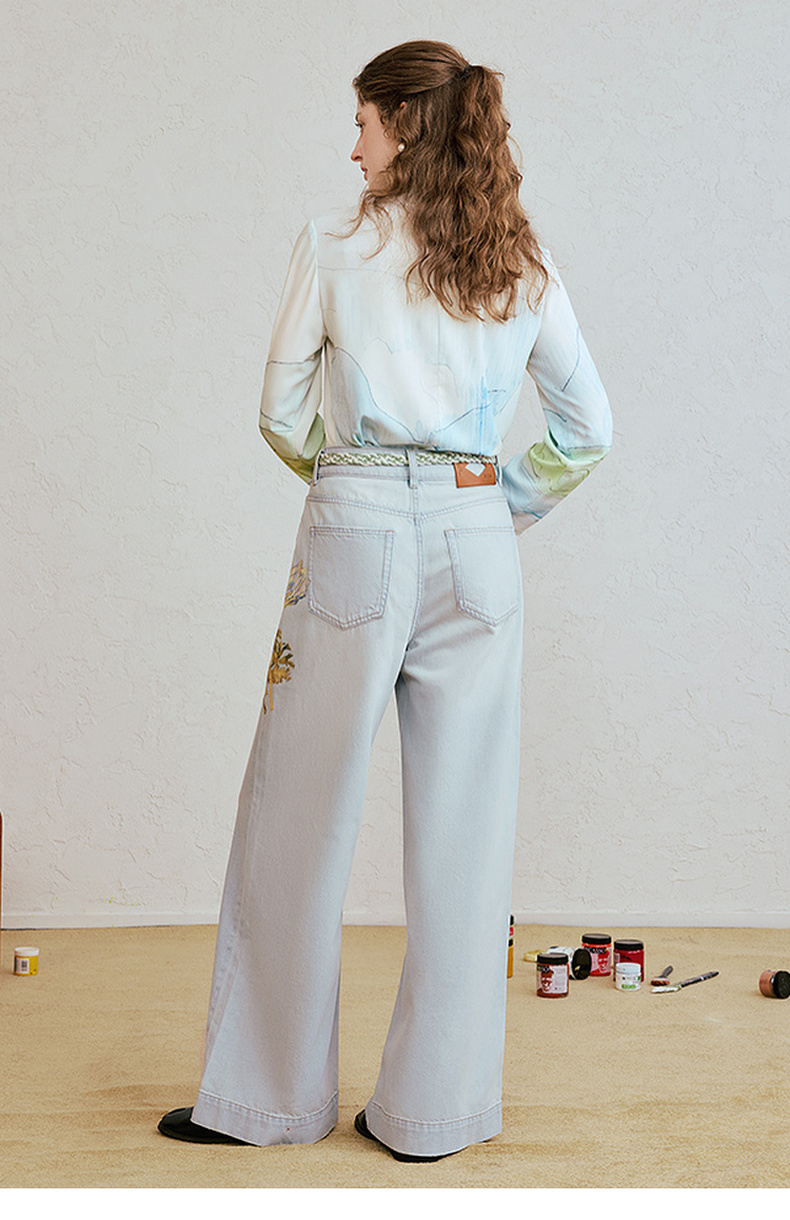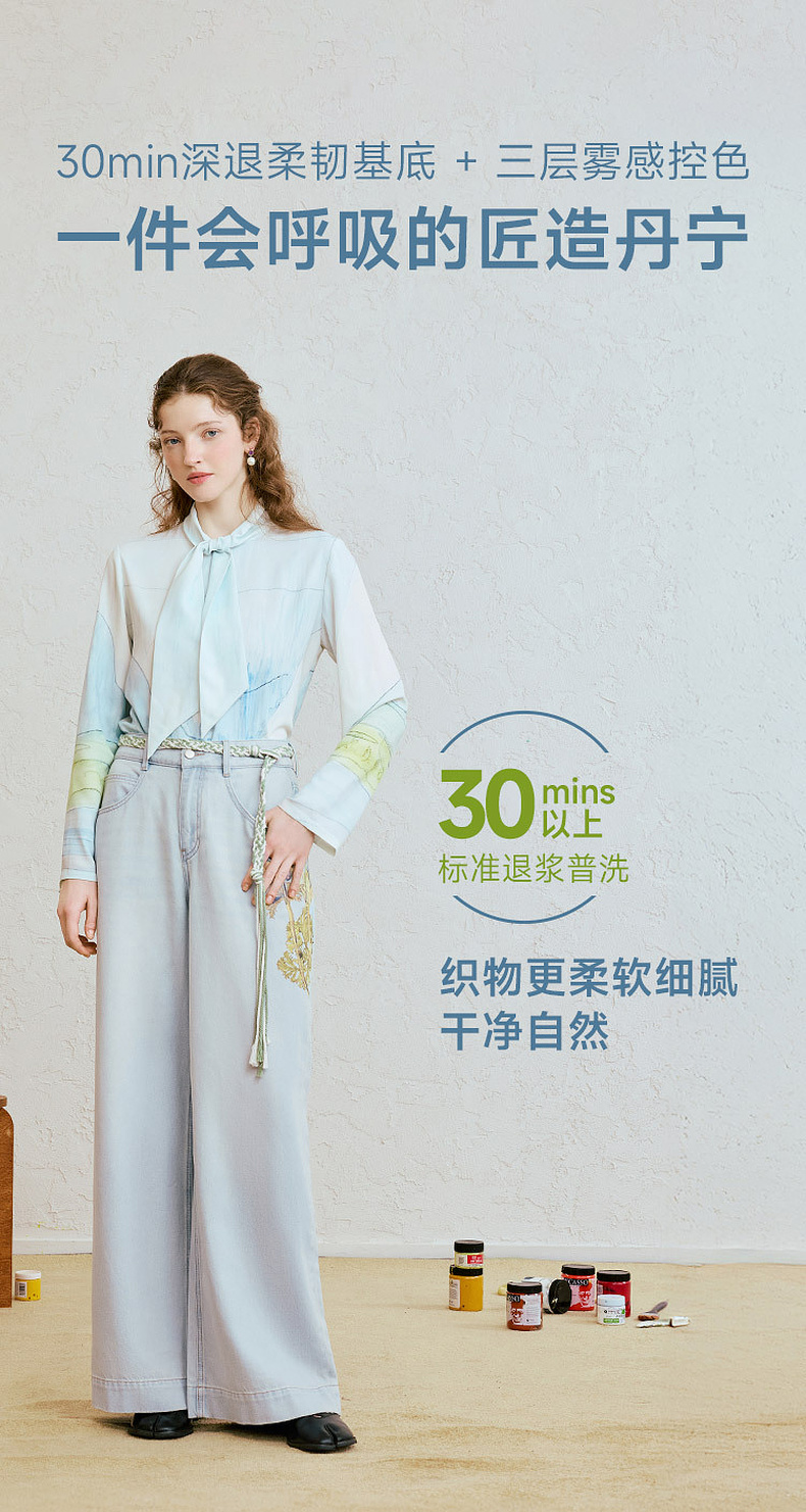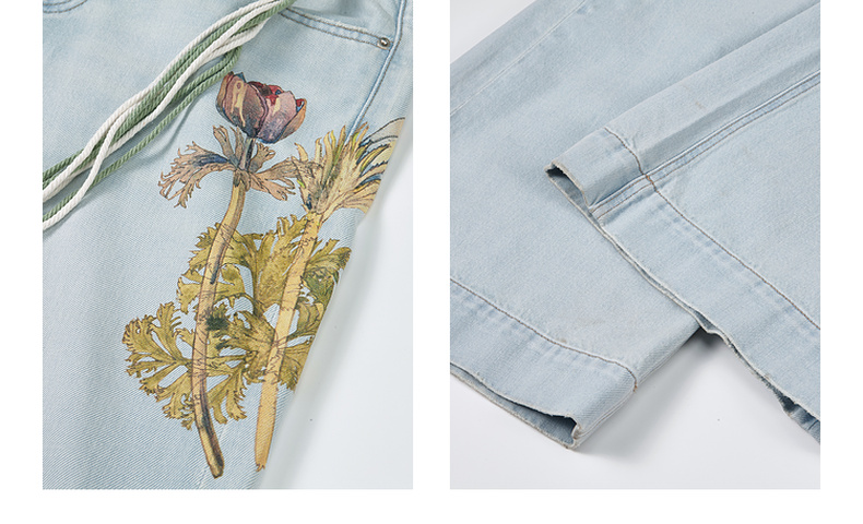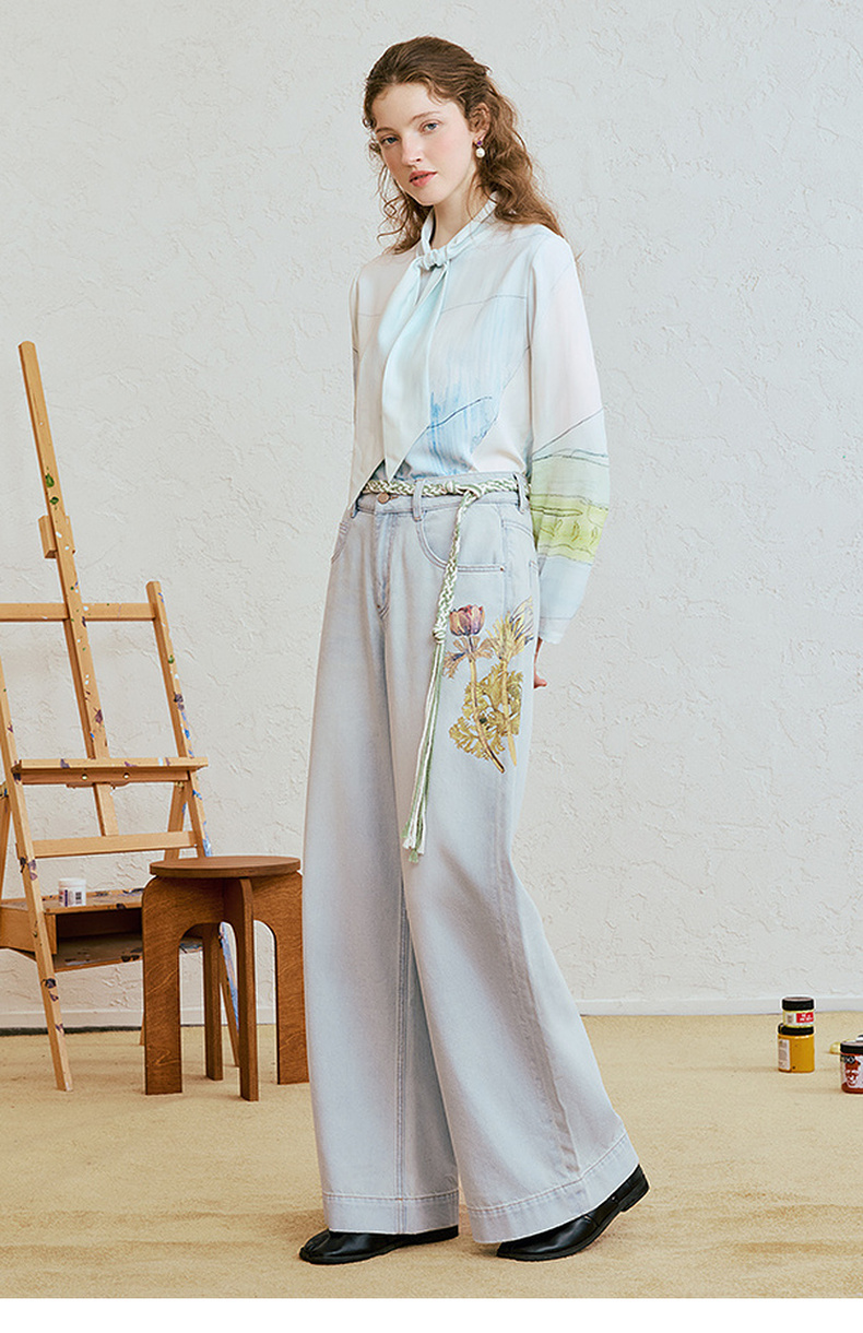两三事 复兴引力 2025夏季新款休闲编织腰绳装饰印花直筒牛仔裤女