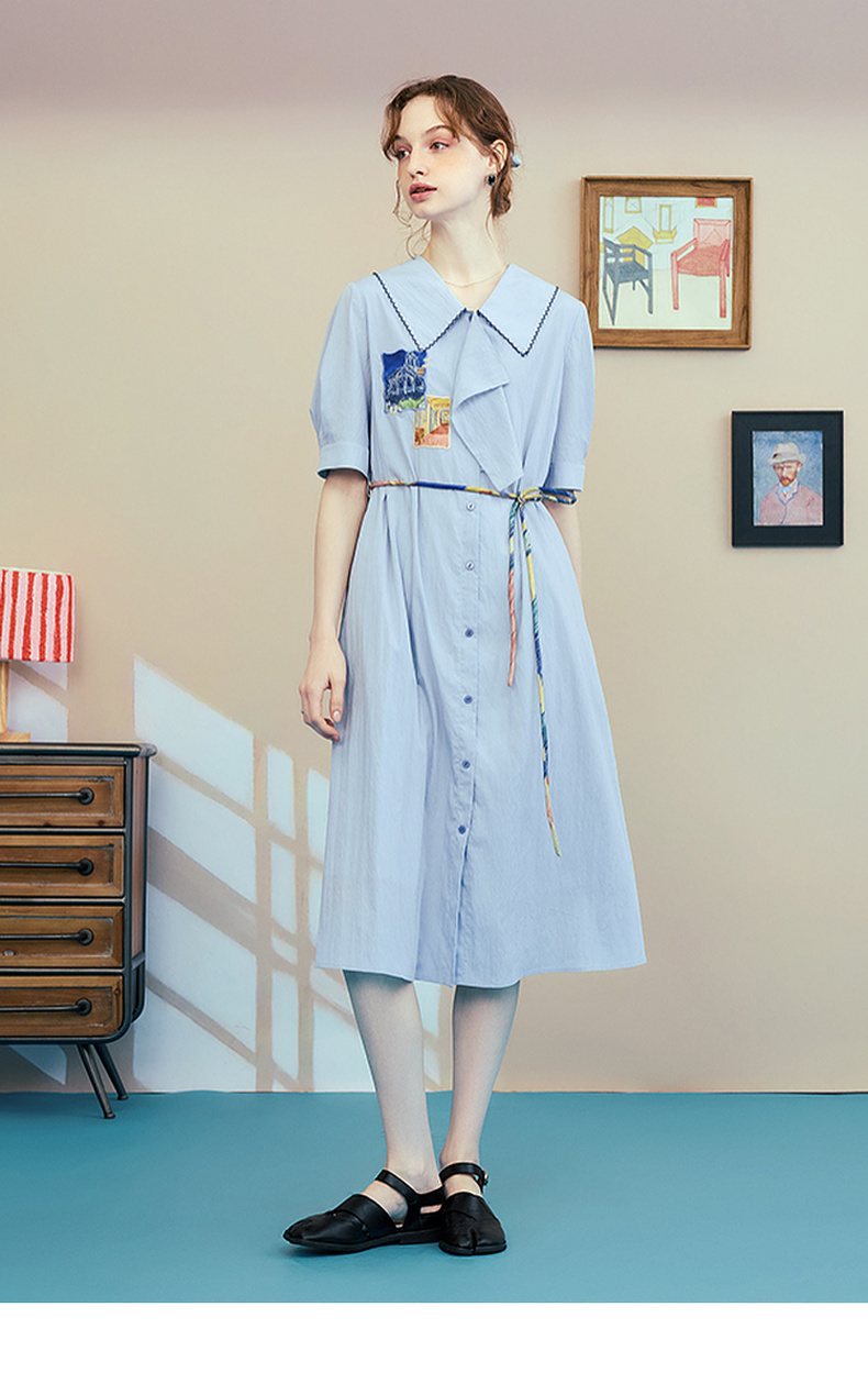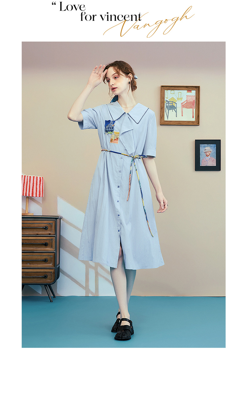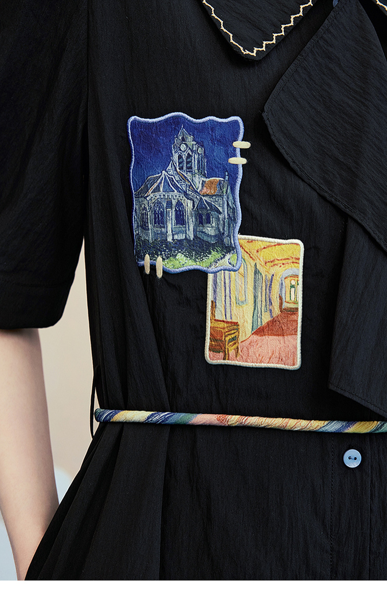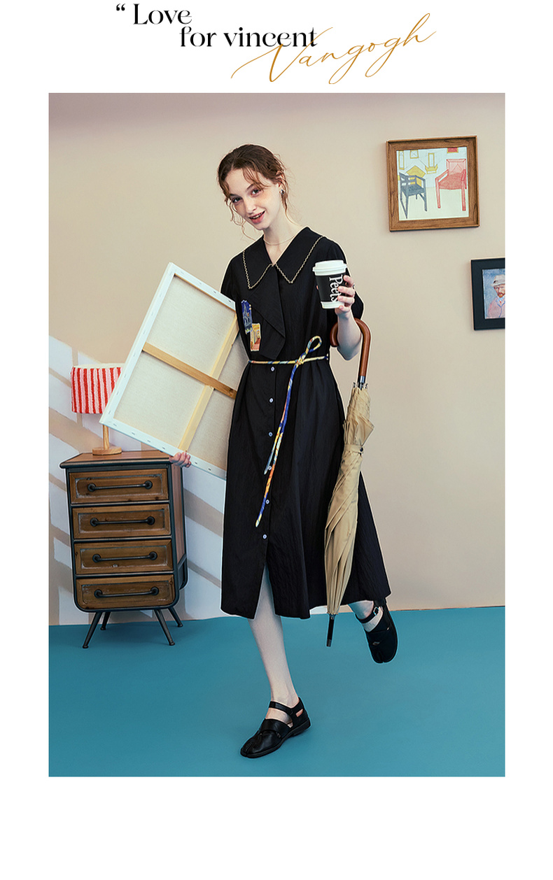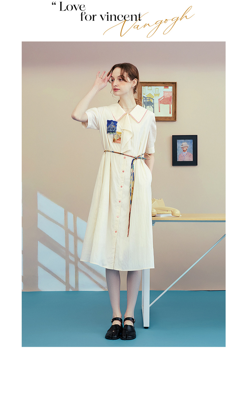 两三事梵高文艺 美学涟漪 2025夏季新款印花贴布绣绑带翻领连衣裙