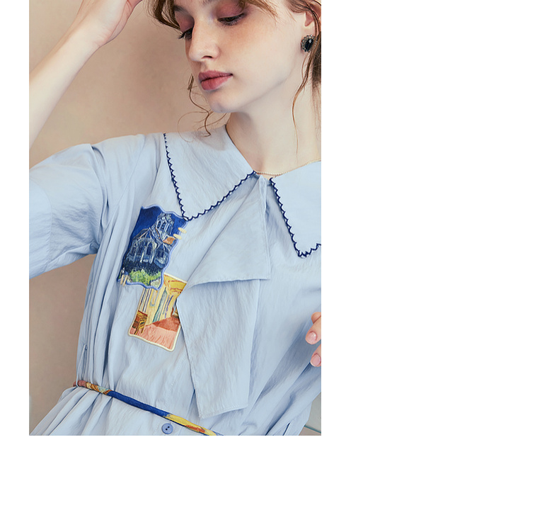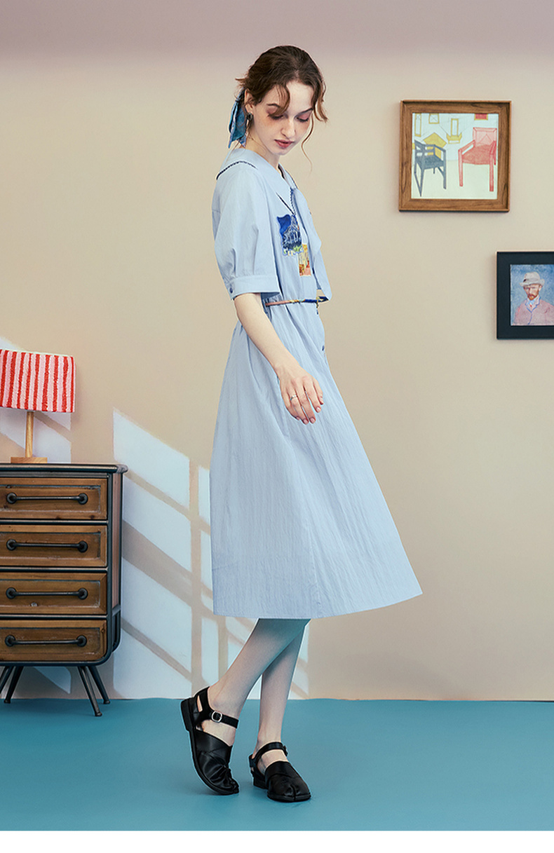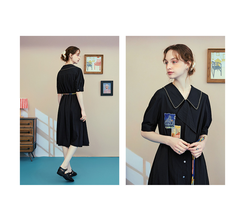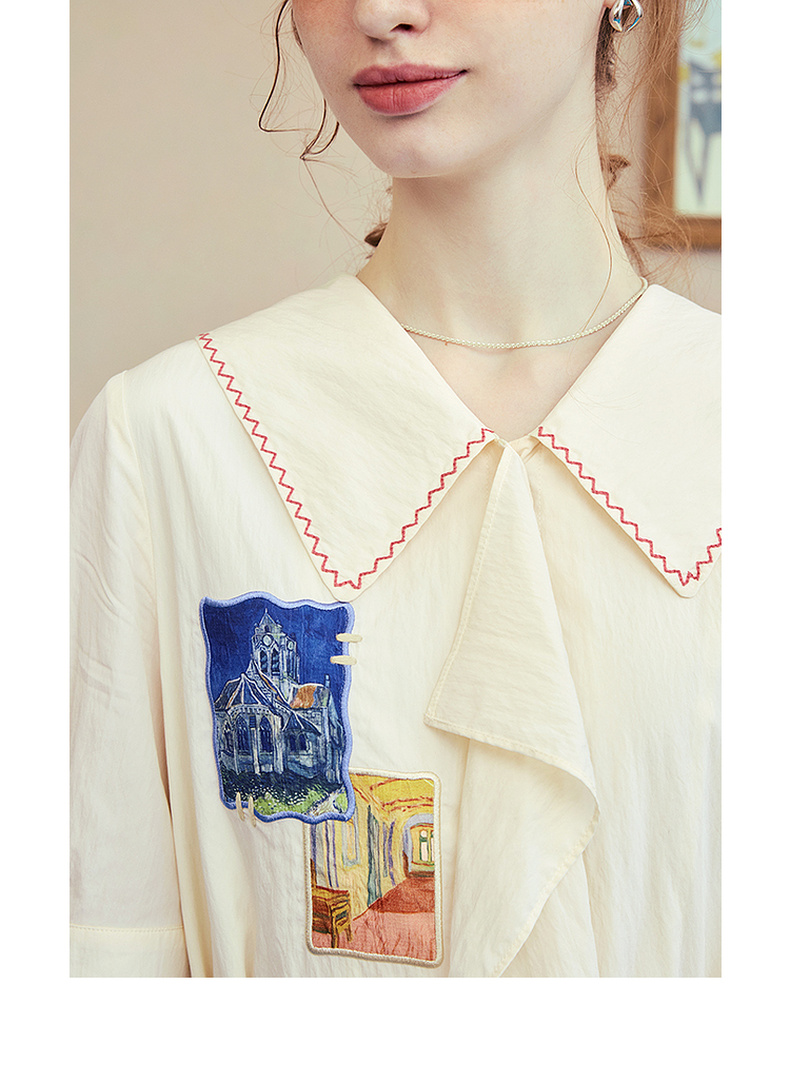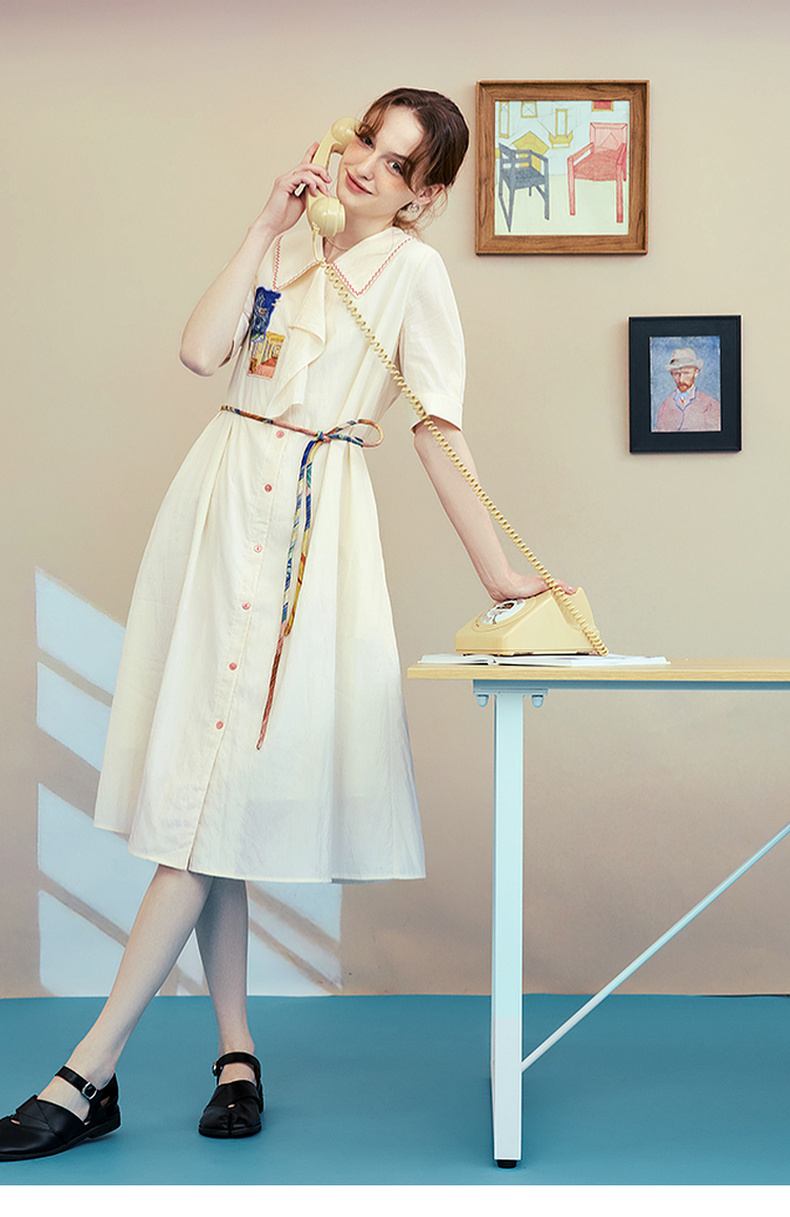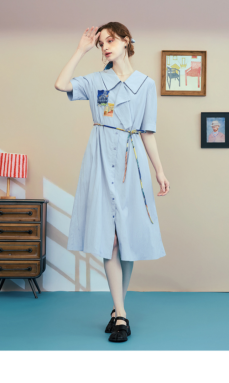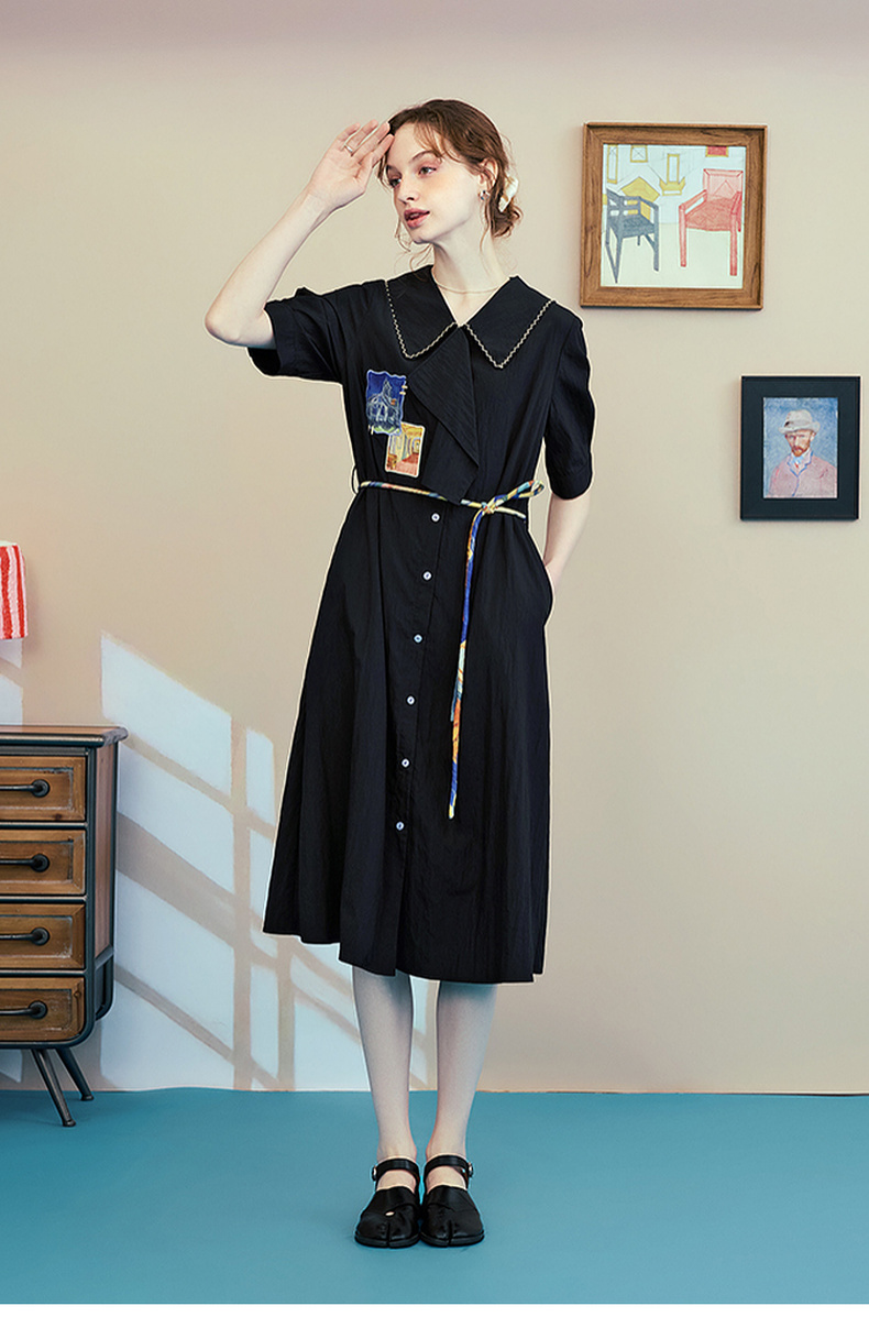 两三事梵高文艺 美学涟漪 2025夏季新款印花贴布绣绑带翻领连衣裙
