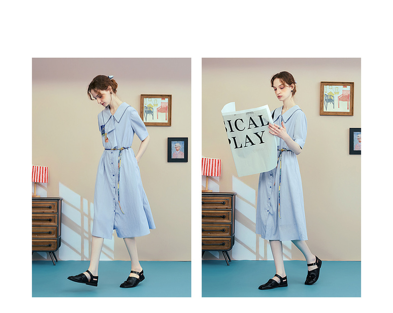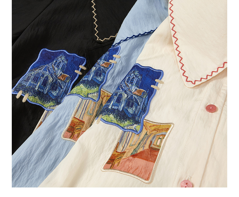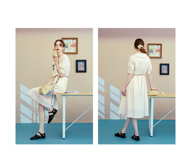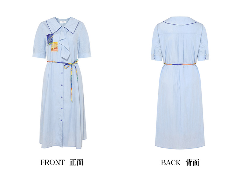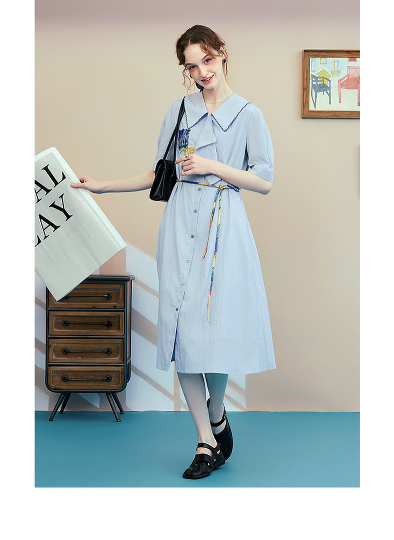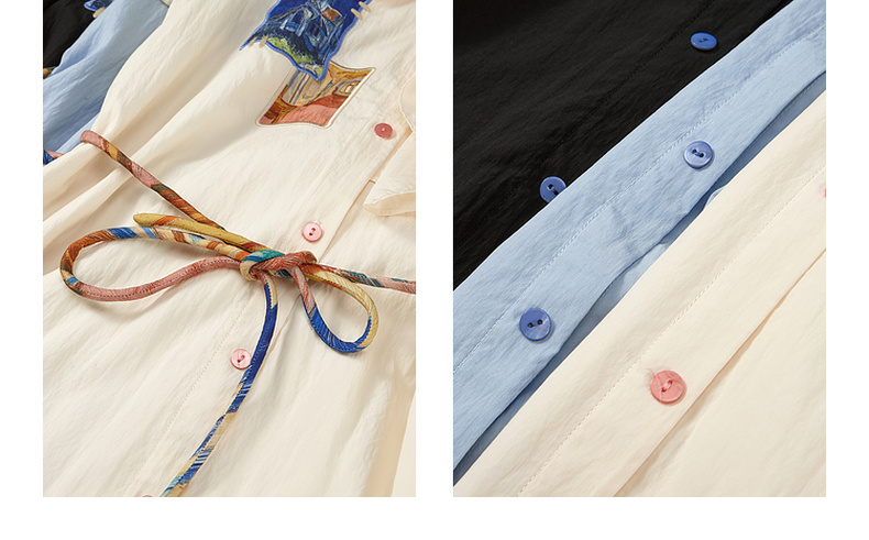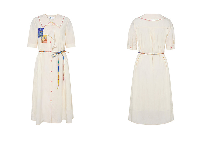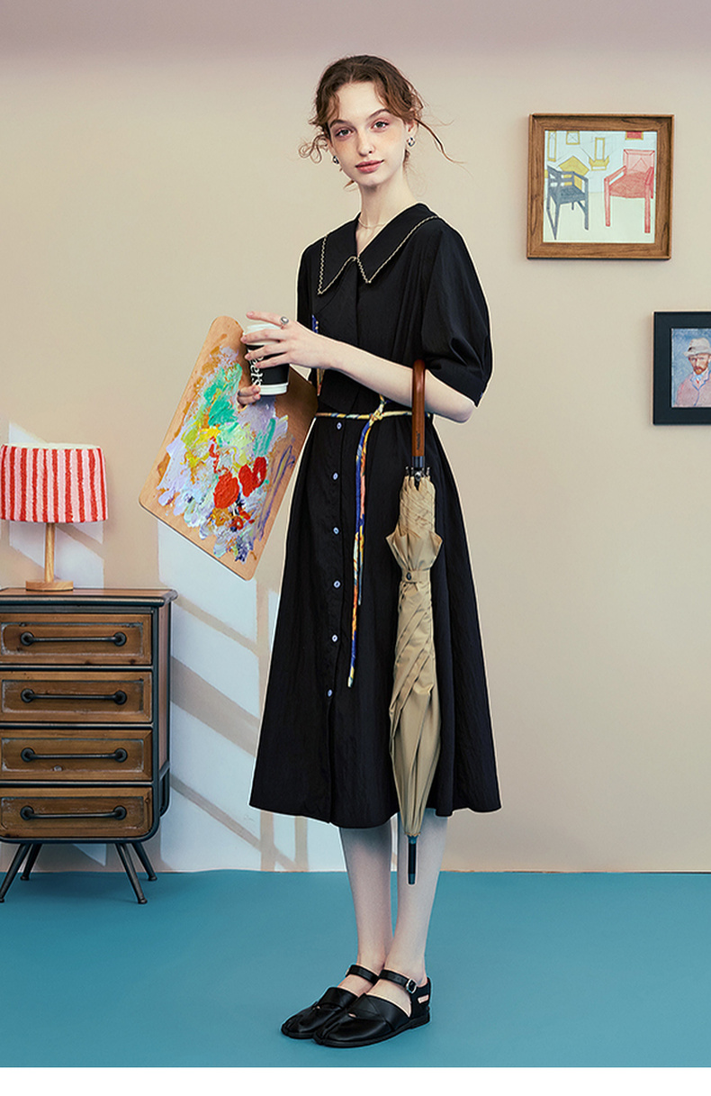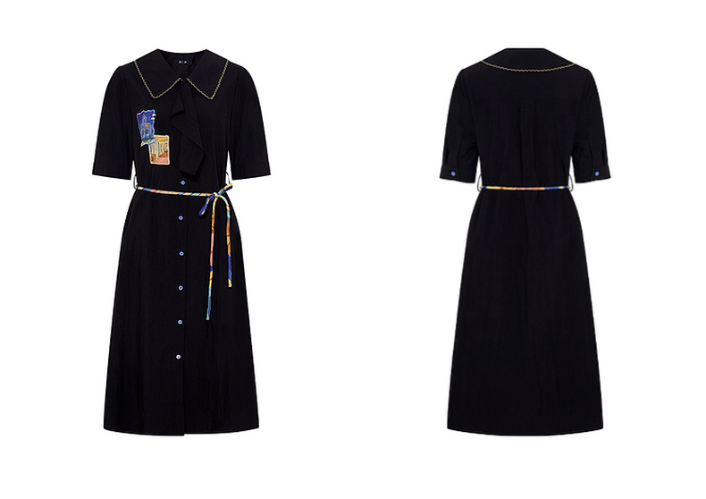 两三事梵高文艺 美学涟漪 2025夏季新款印花贴布绣绑带翻领连衣裙