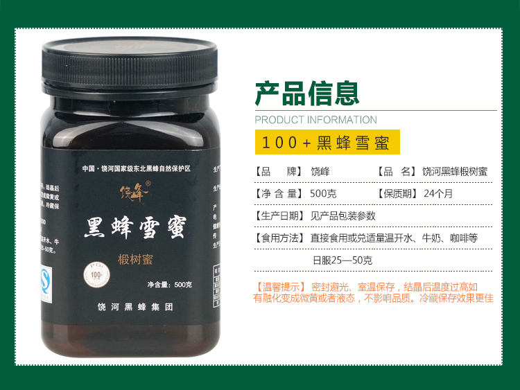 饶峰蜂蜜东北饶河特产黑蜂雪蜜椴树蜜500g100+