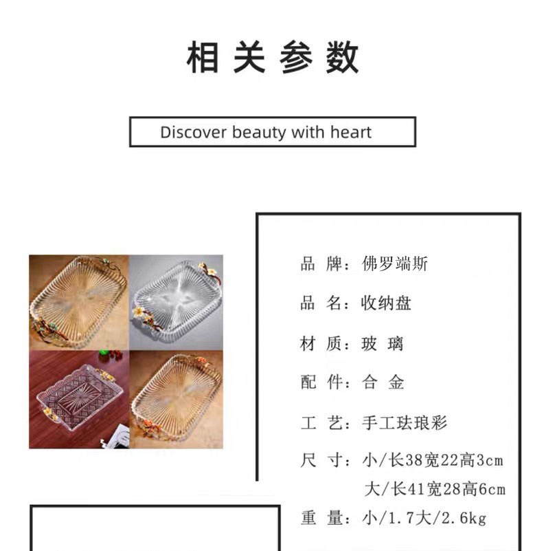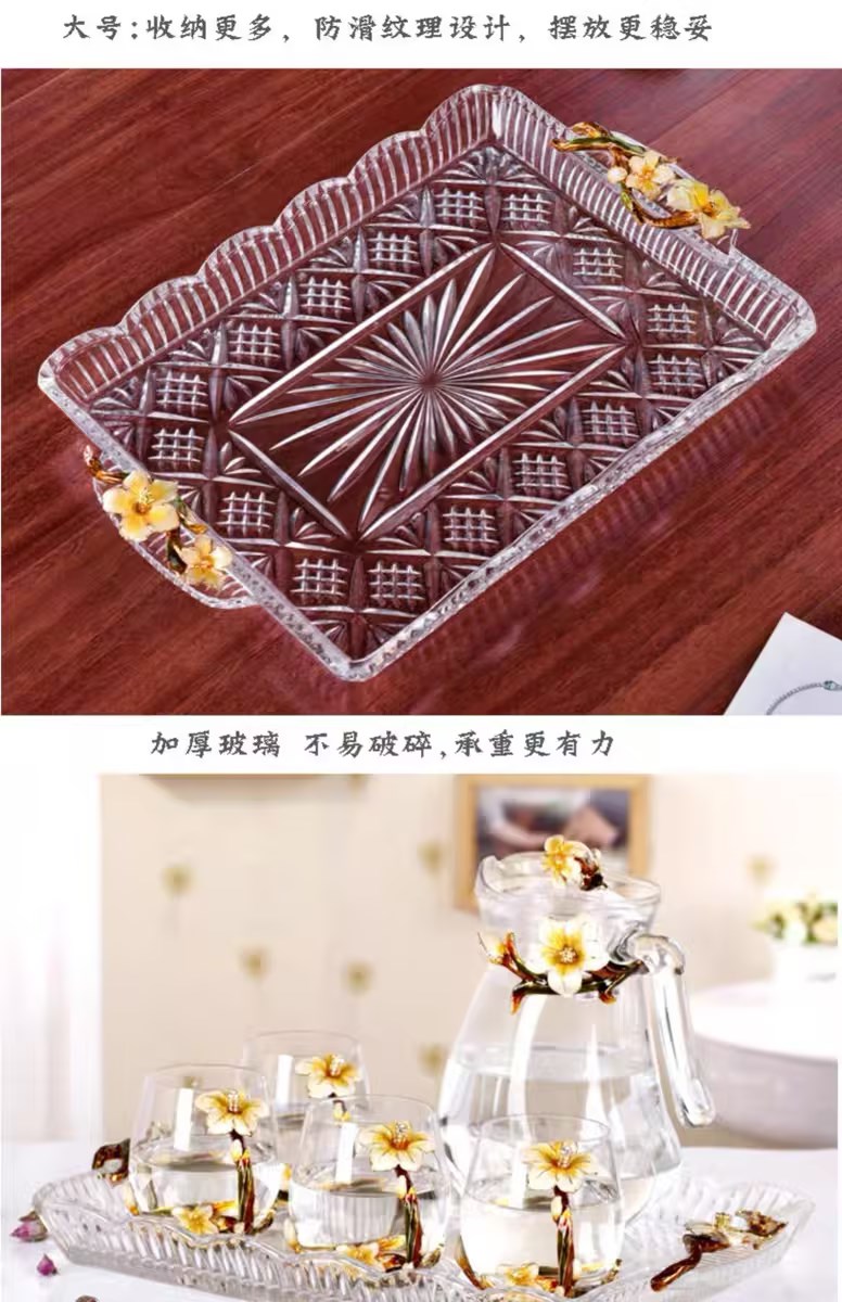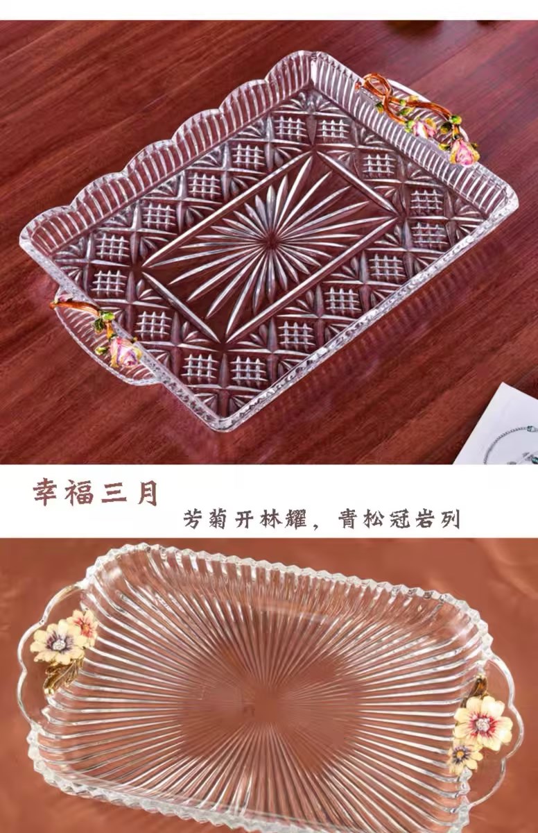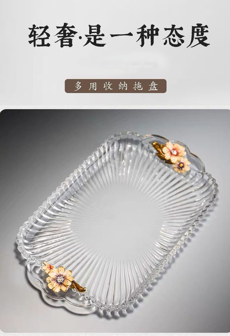 佛罗端斯 珐琅彩托盘水晶玻璃水果盘家用放杯子的盘子轻奢风长方形茶盘杯盘古典花纹托盘