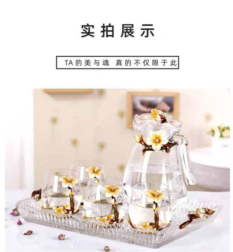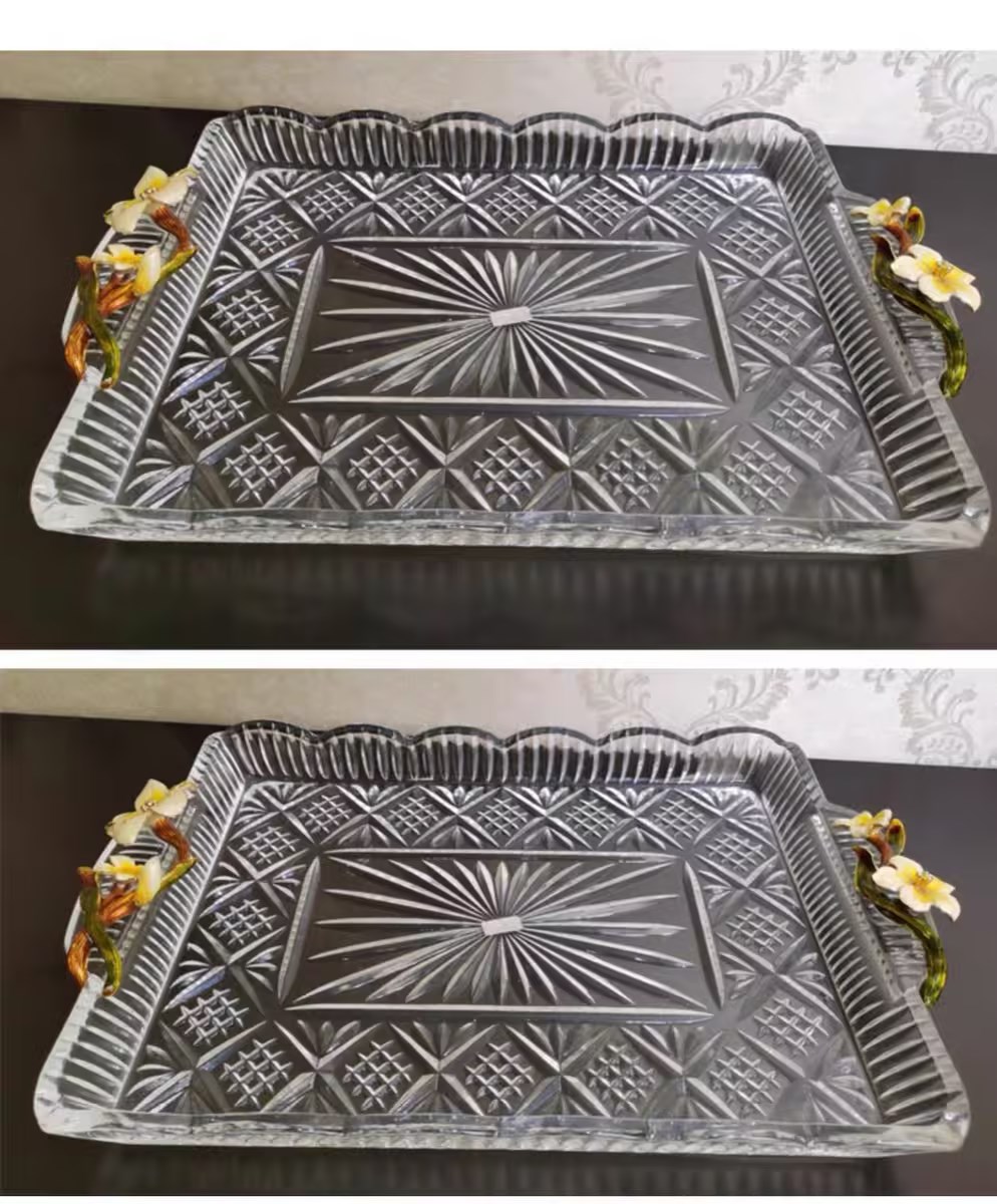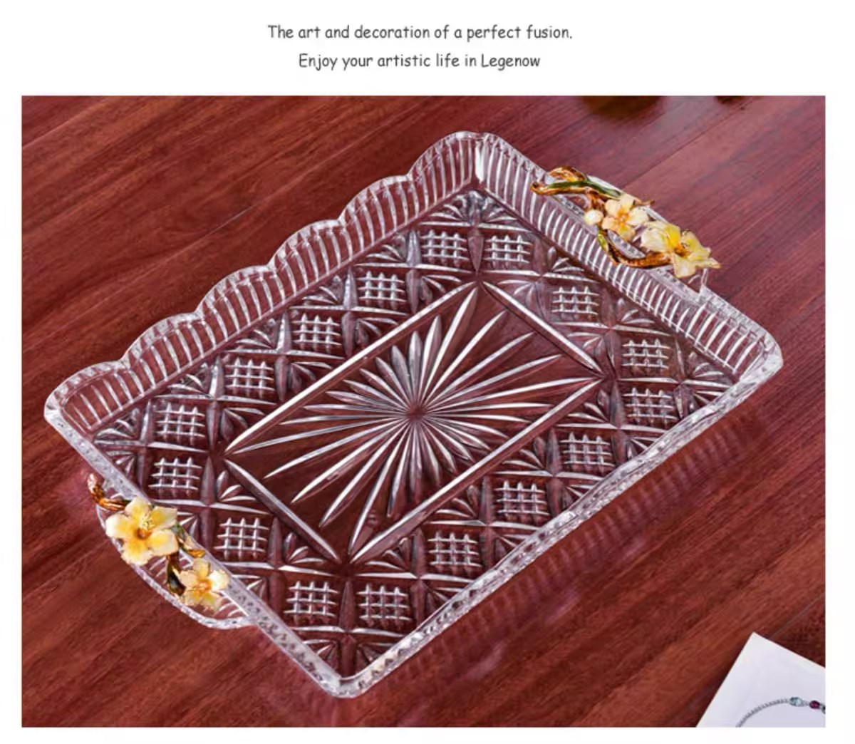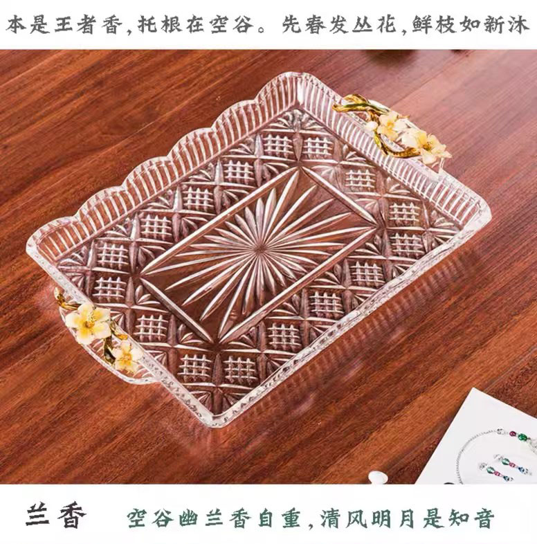 佛罗端斯 珐琅彩托盘水晶玻璃水果盘家用放杯子的盘子轻奢风长方形茶盘杯盘古典花纹托盘
