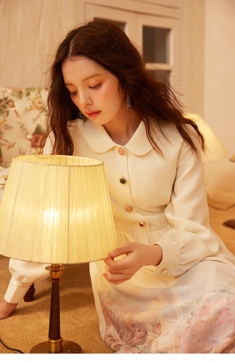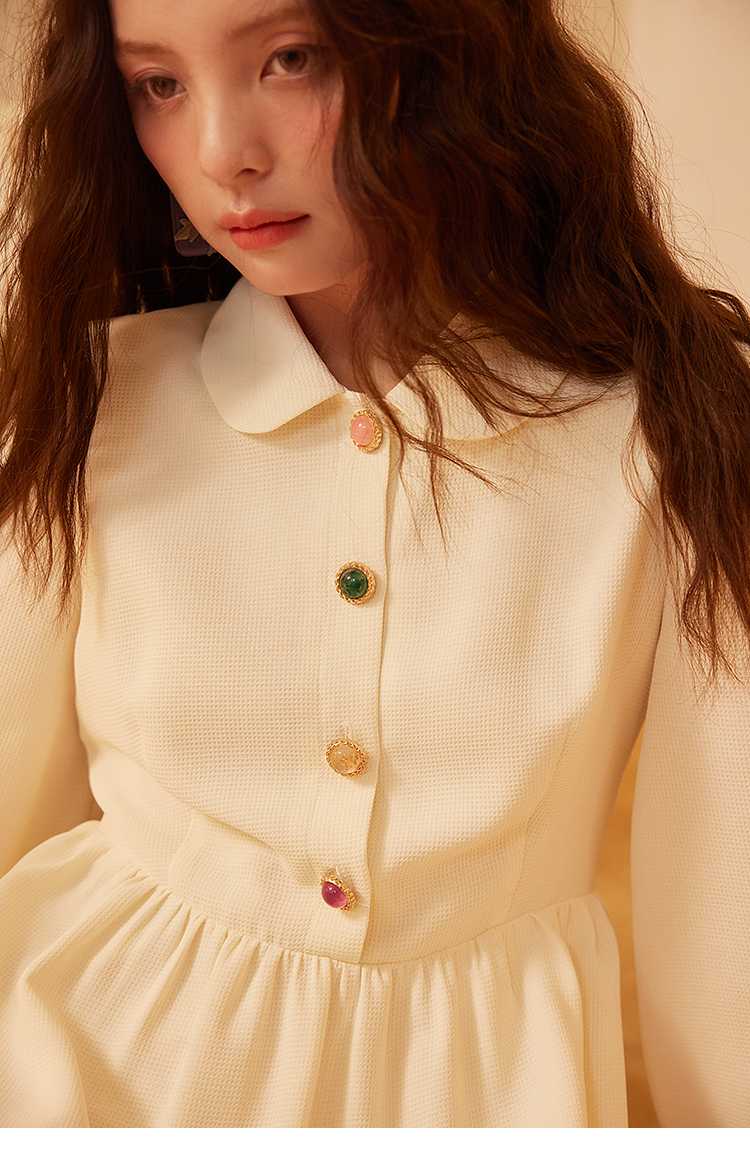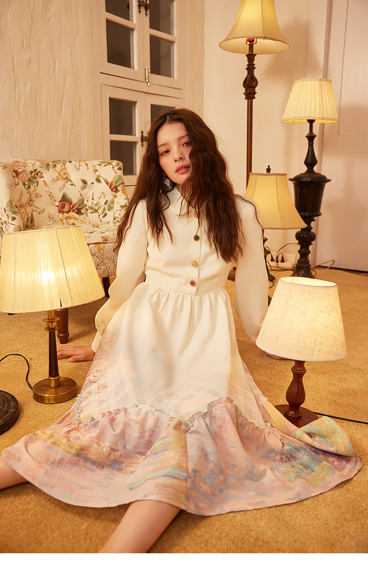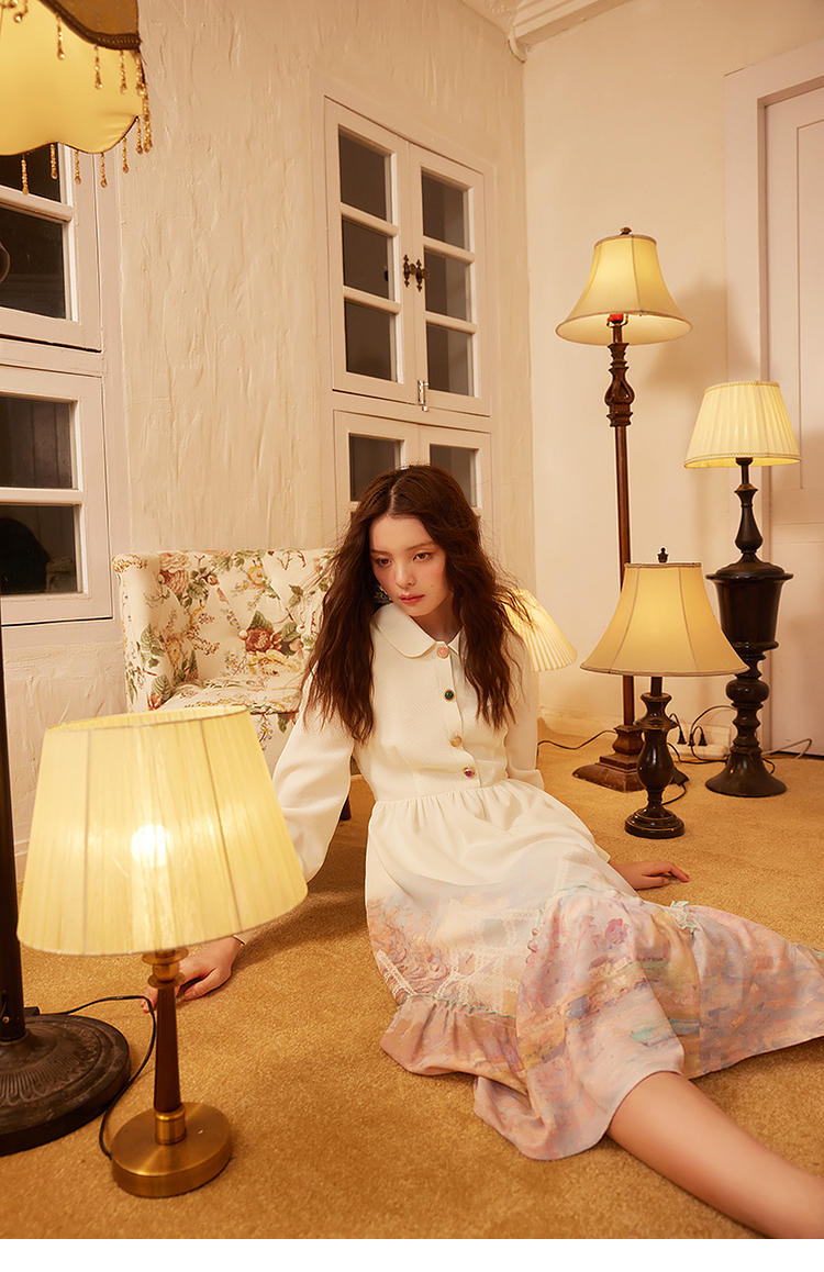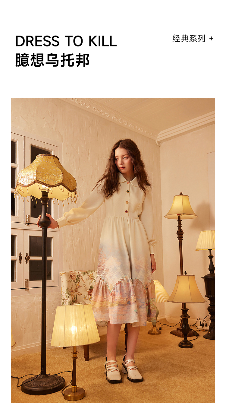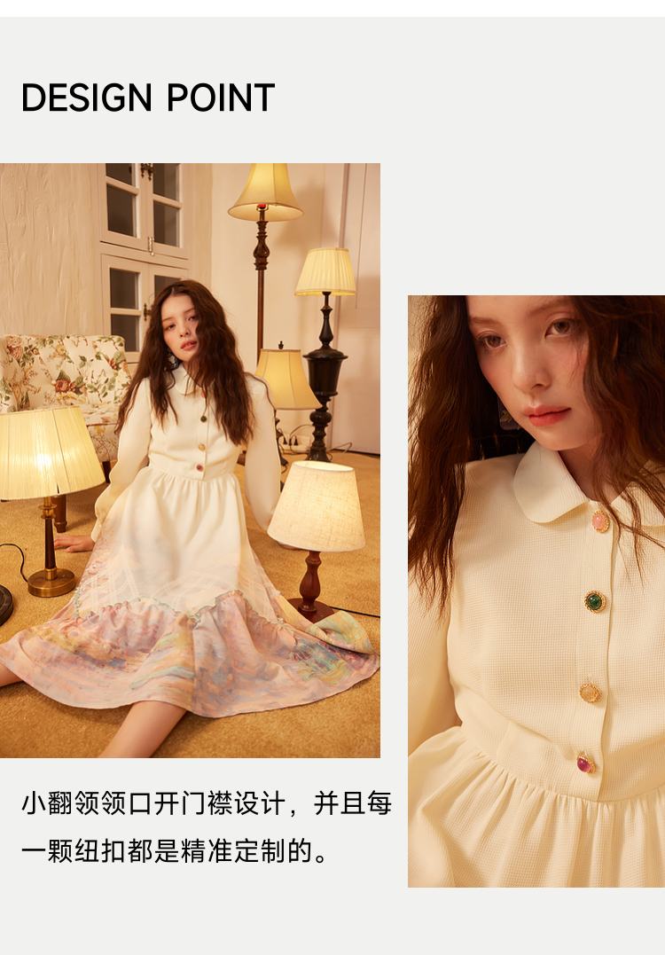 两三事臆想乌托邦 2023秋季新款复古艺术拼接设计系带长袖连衣裙