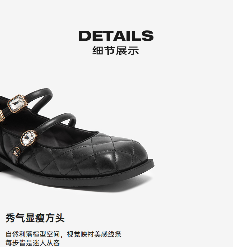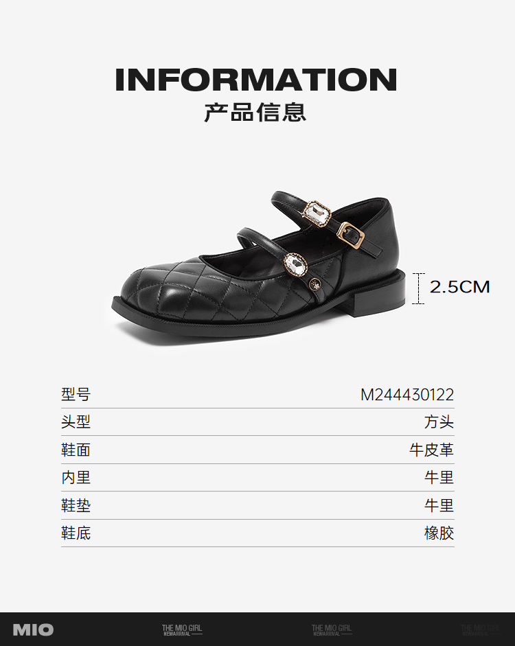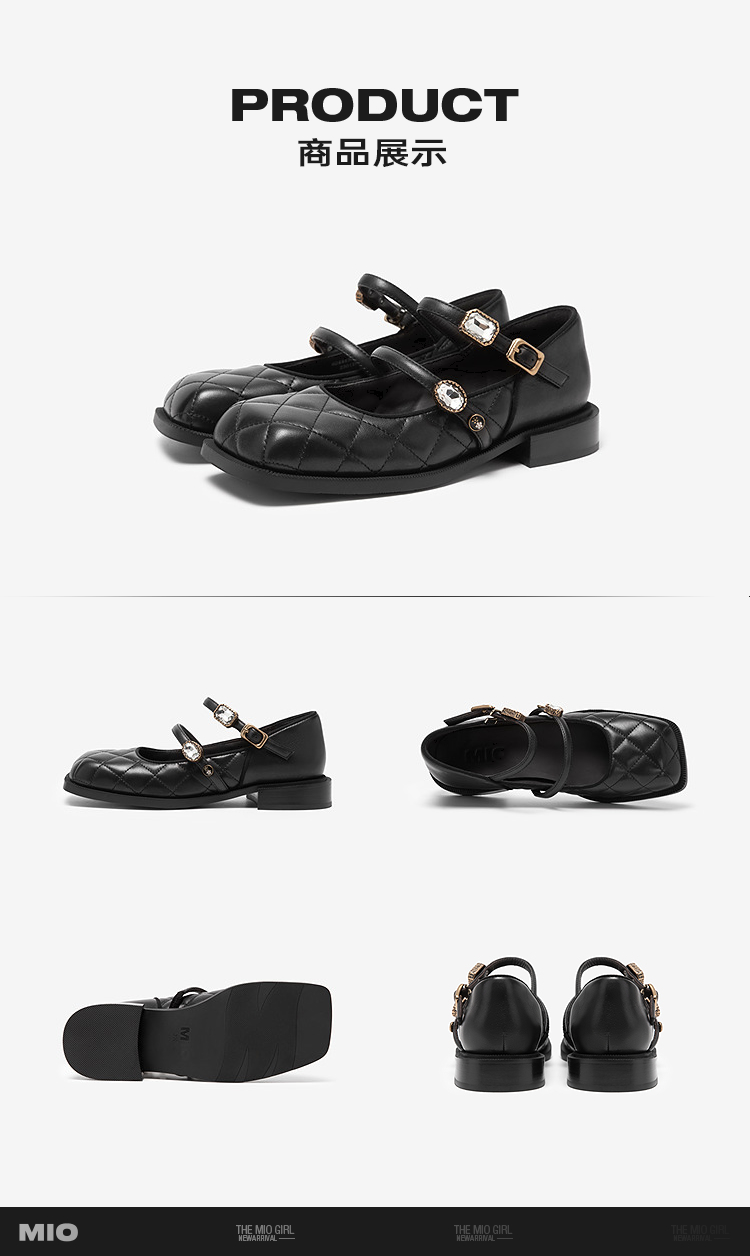MIO米奥秋季方头低跟单鞋闪钻双条袢带复古时髦玛丽珍女鞋M244430122
