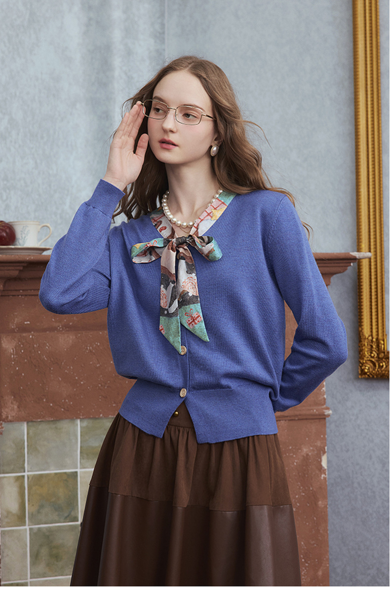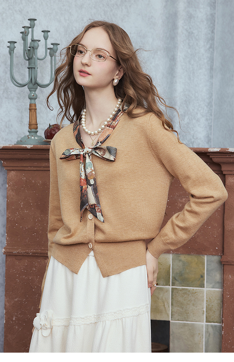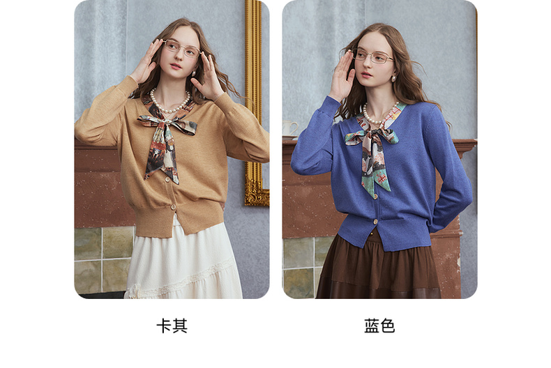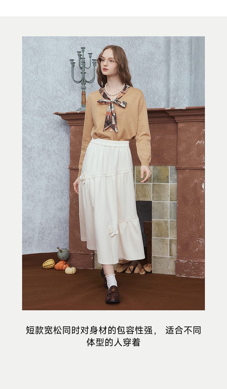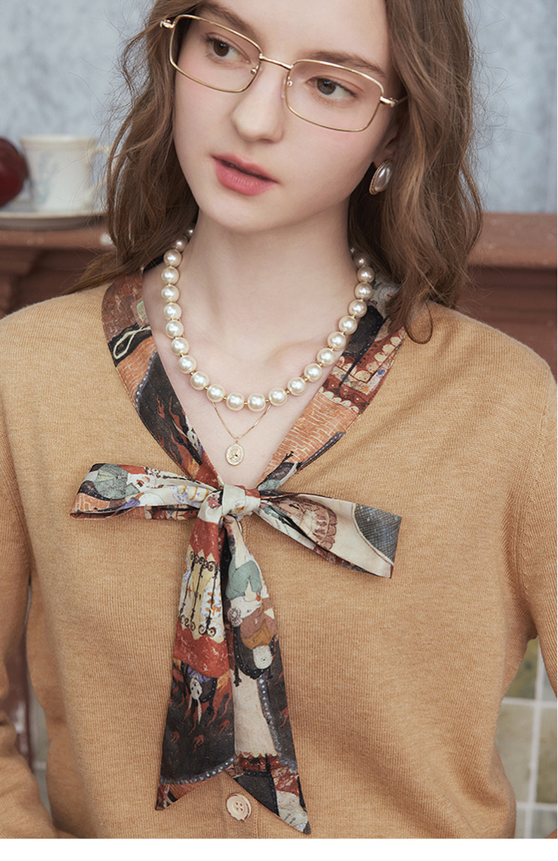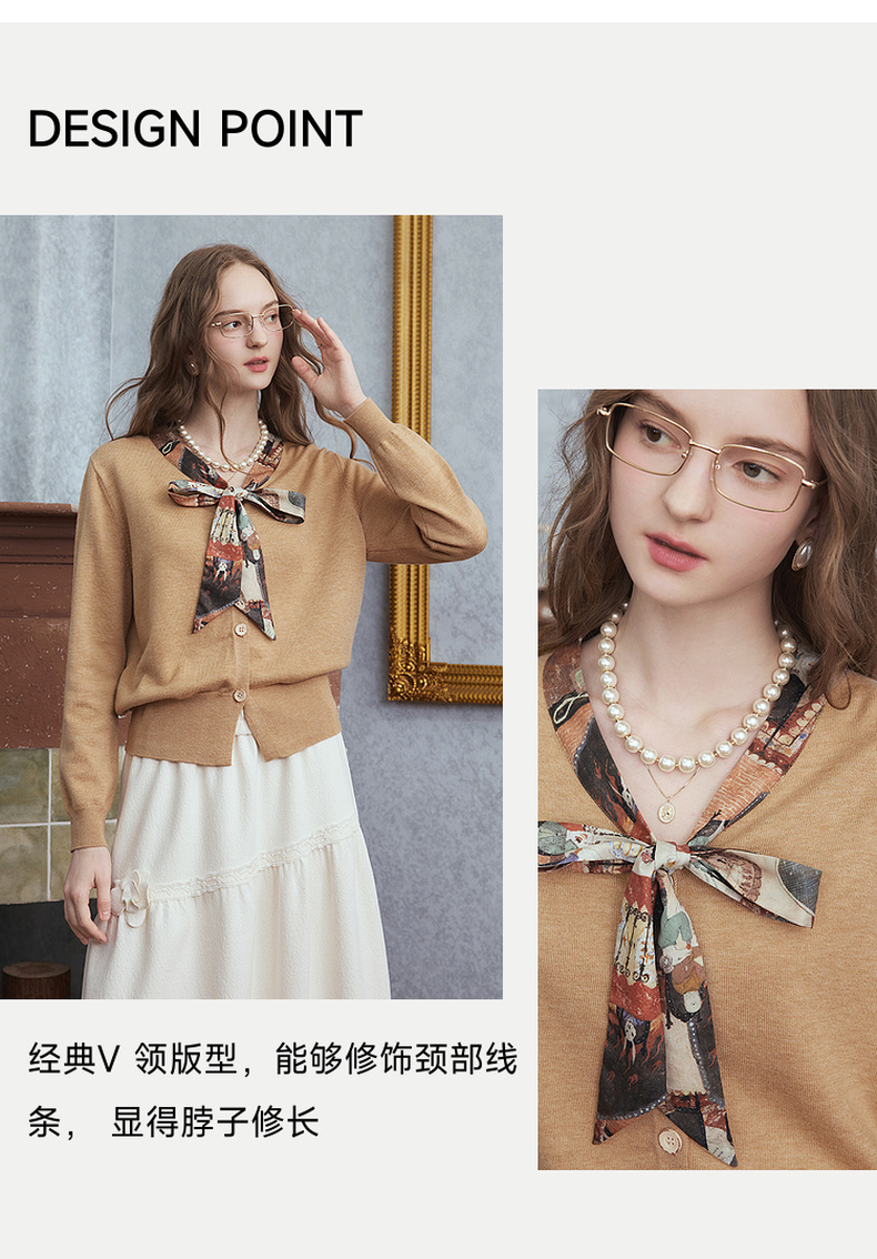 两三事 抒情诗人 2025秋季新款森系风印花领带针织开衫女宽松
