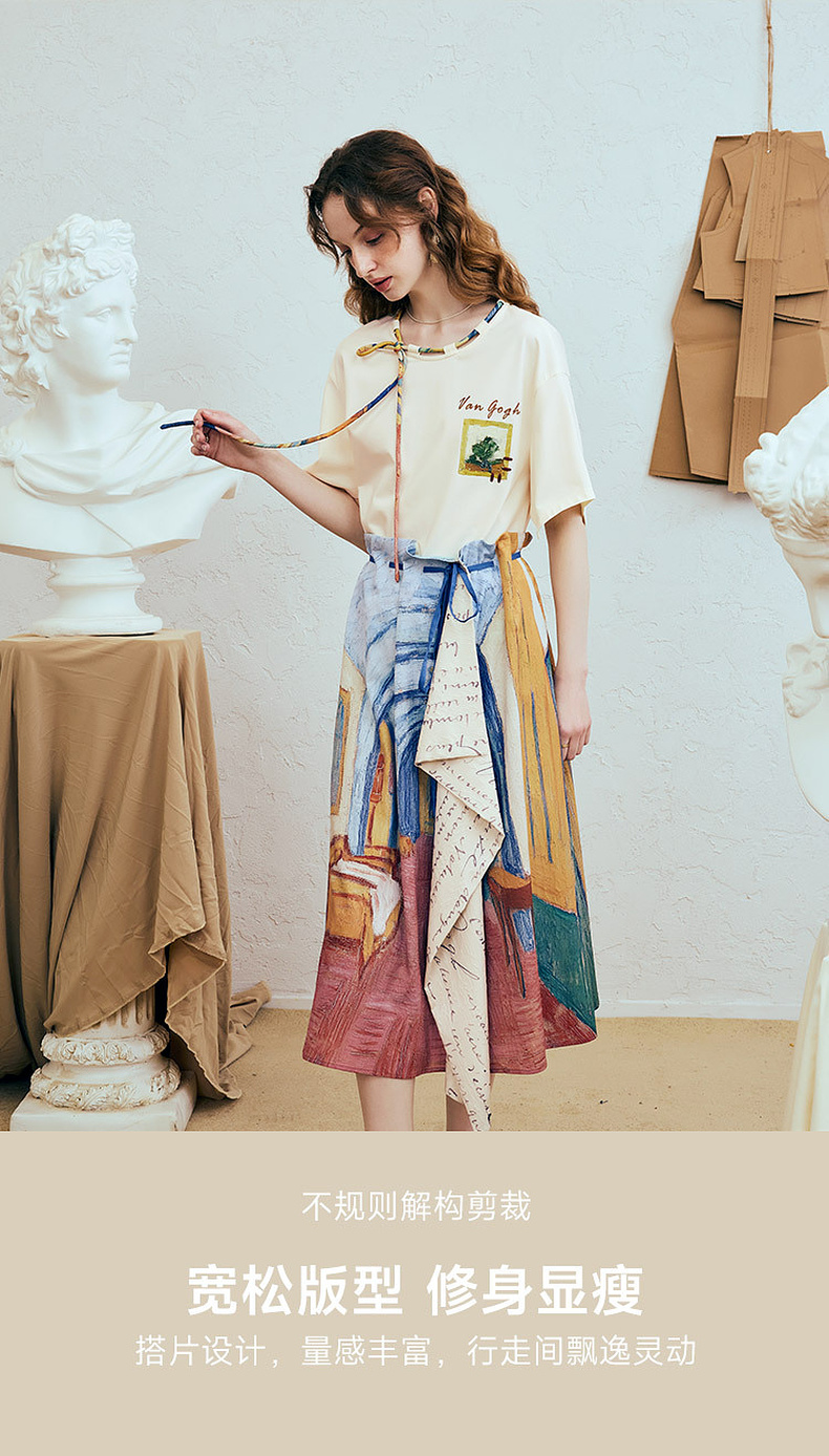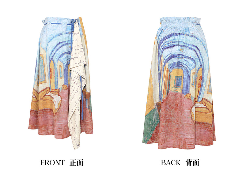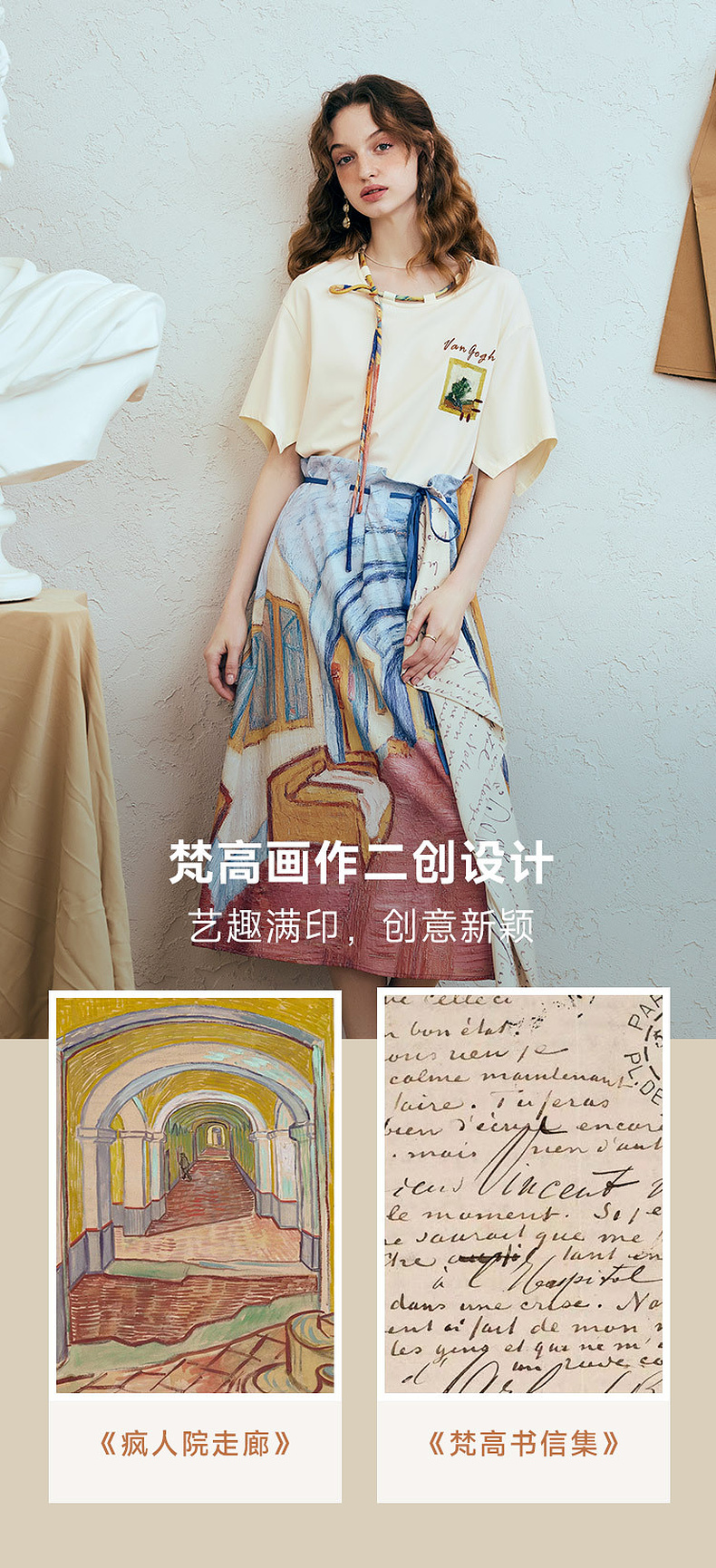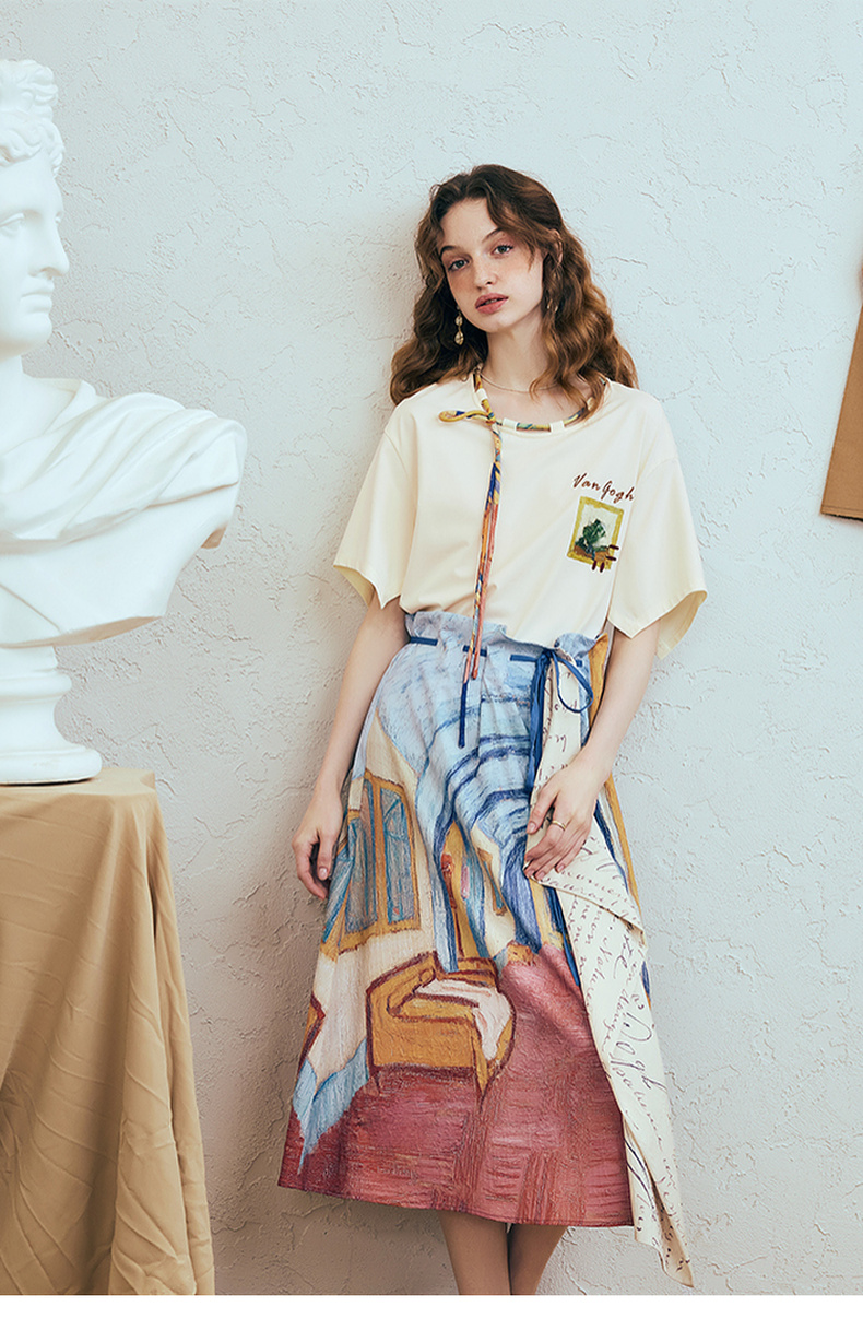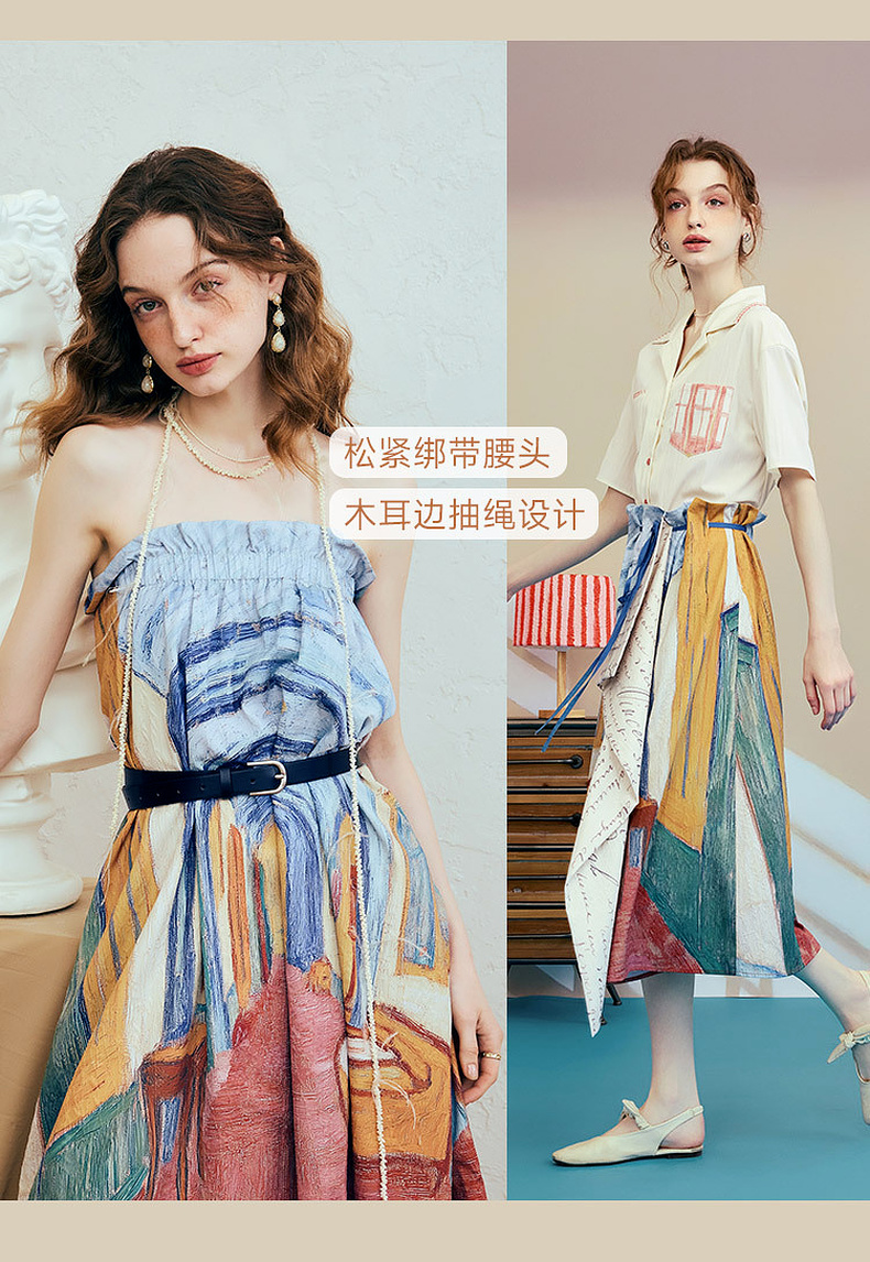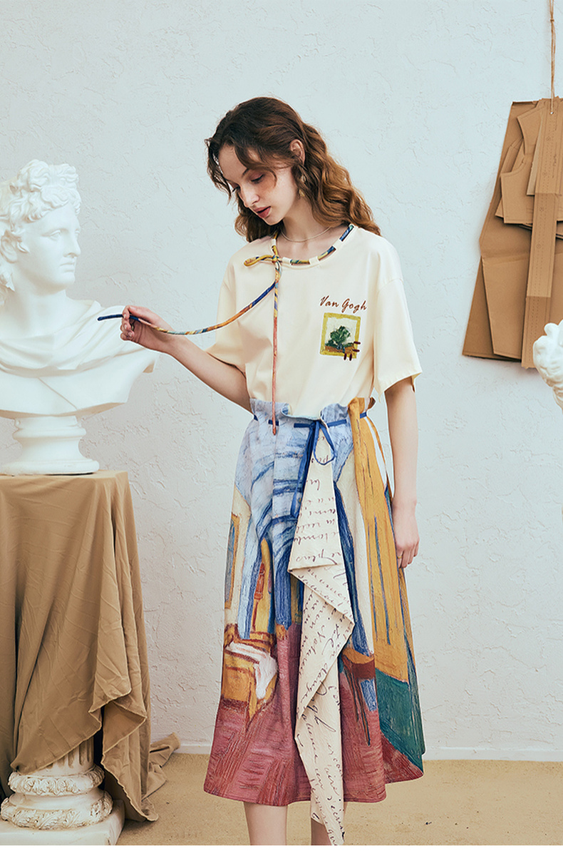 两三事梵高文艺艺术长廊2025夏季新款复古印花抽绳绑带两穿半身裙