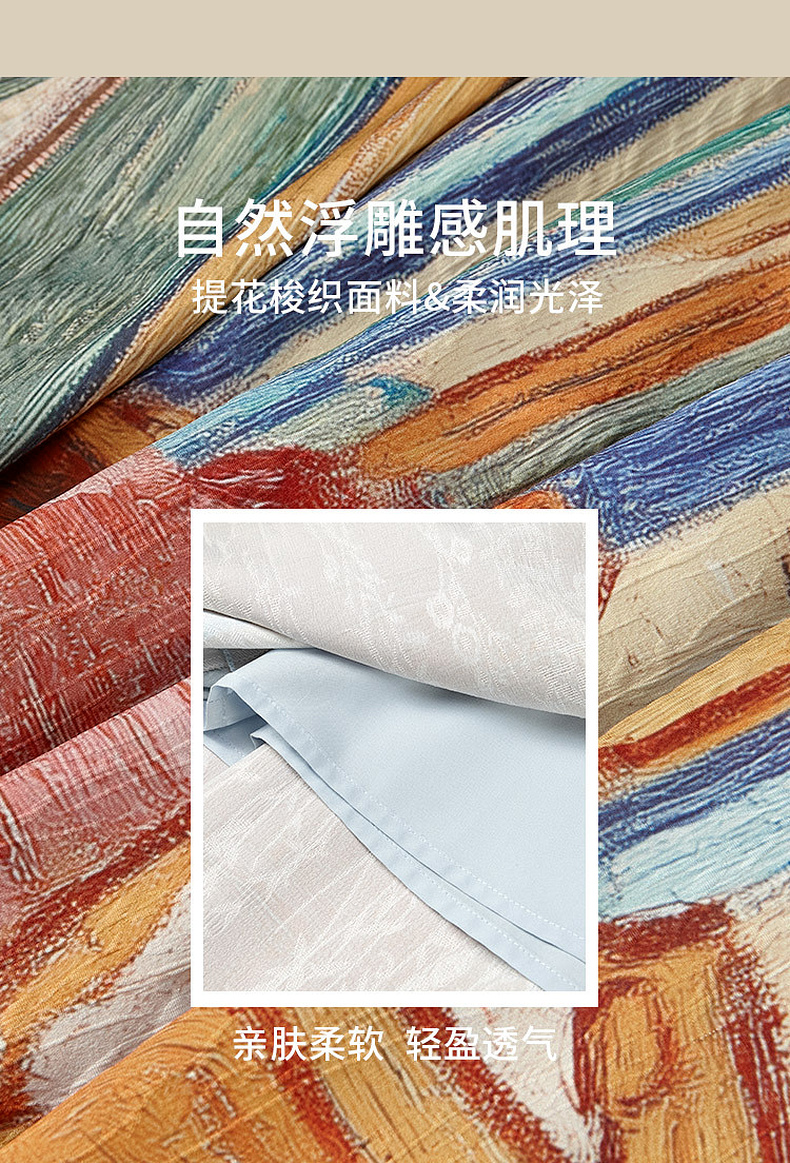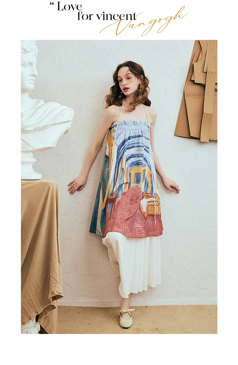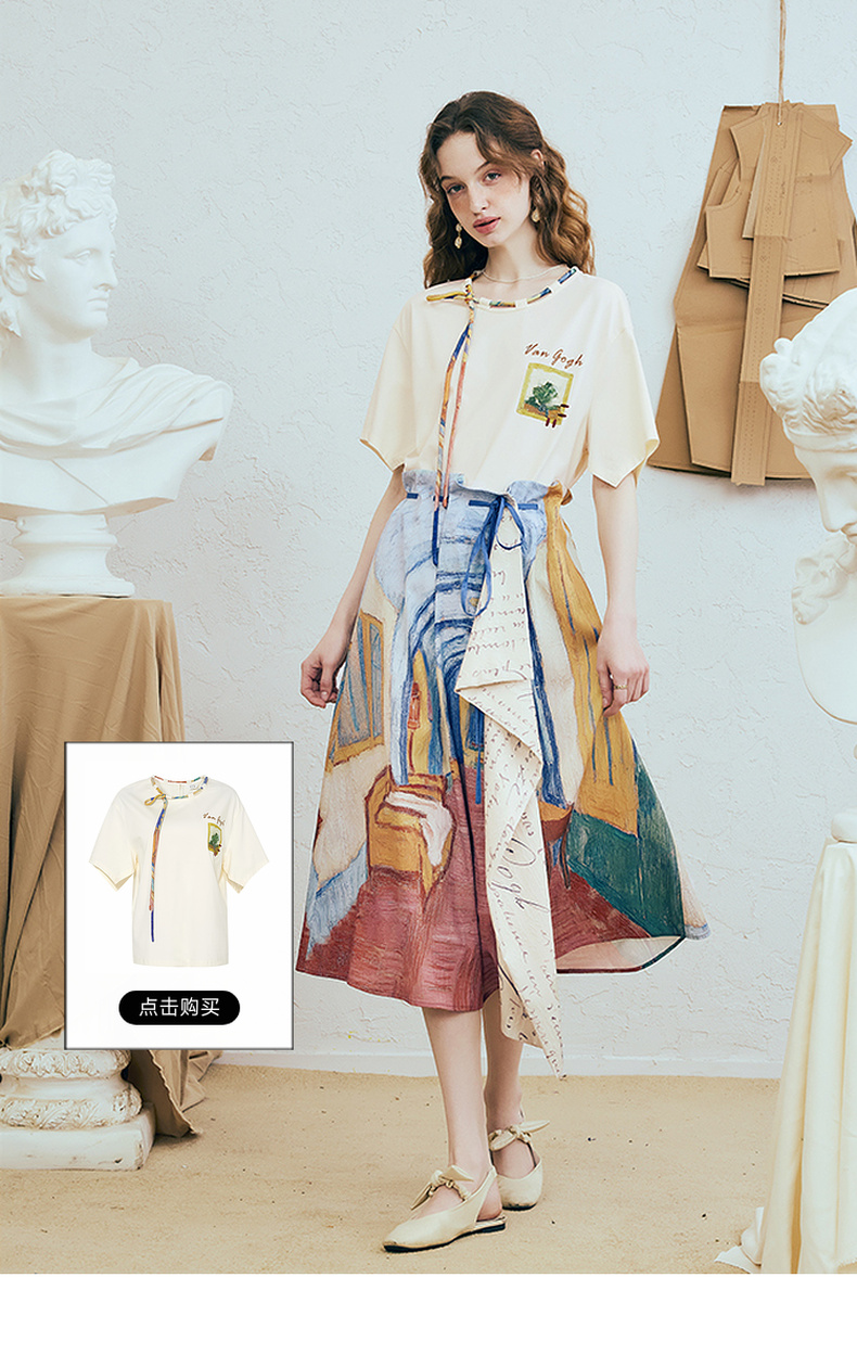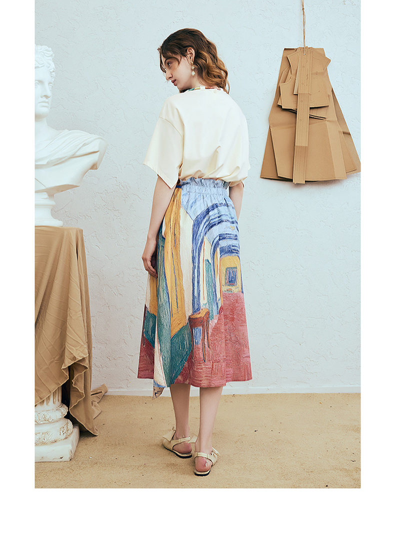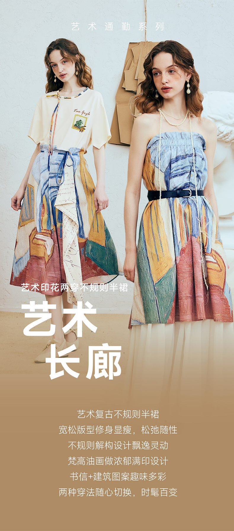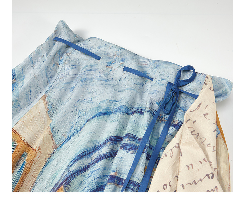 两三事梵高文艺艺术长廊2025夏季新款复古印花抽绳绑带两穿半身裙