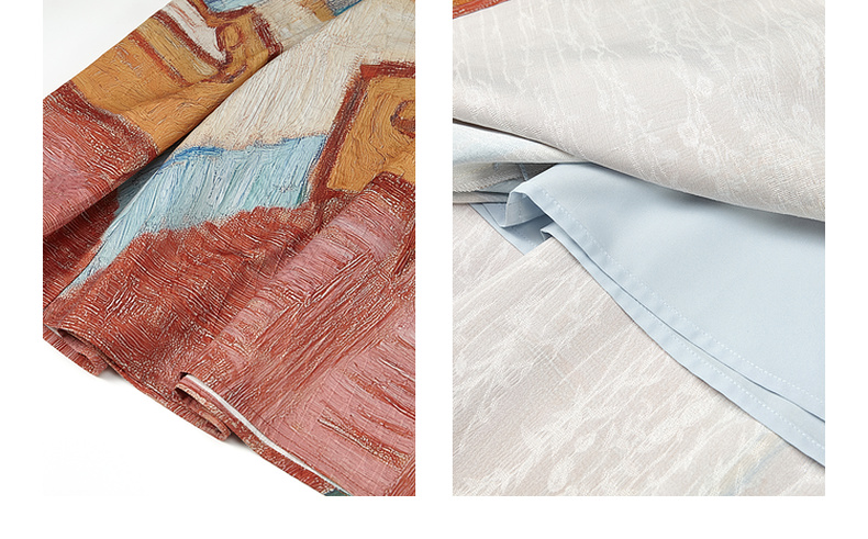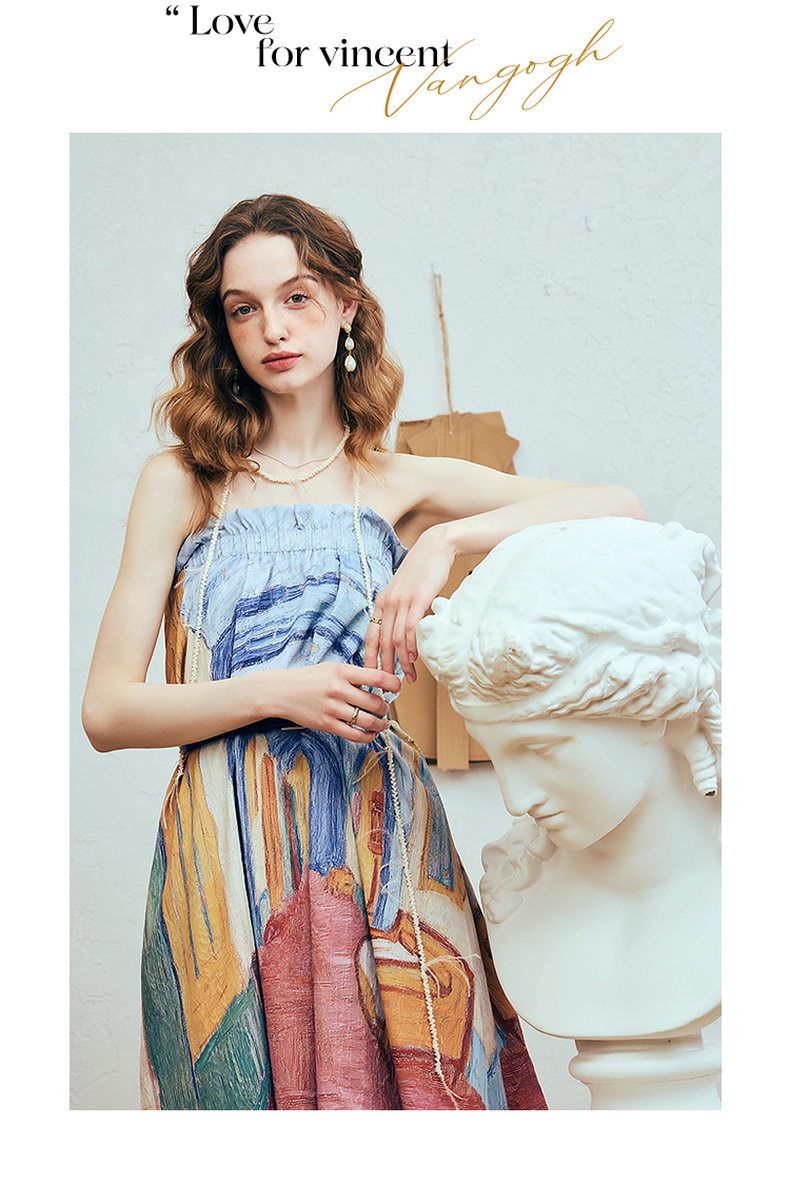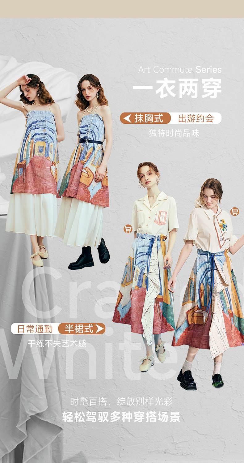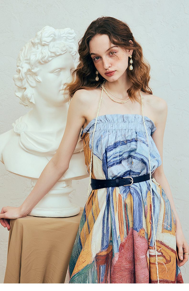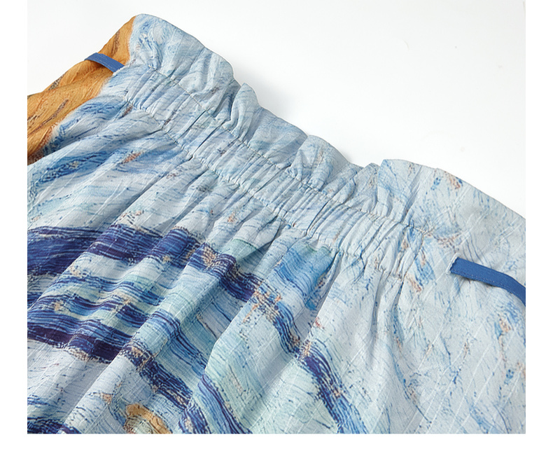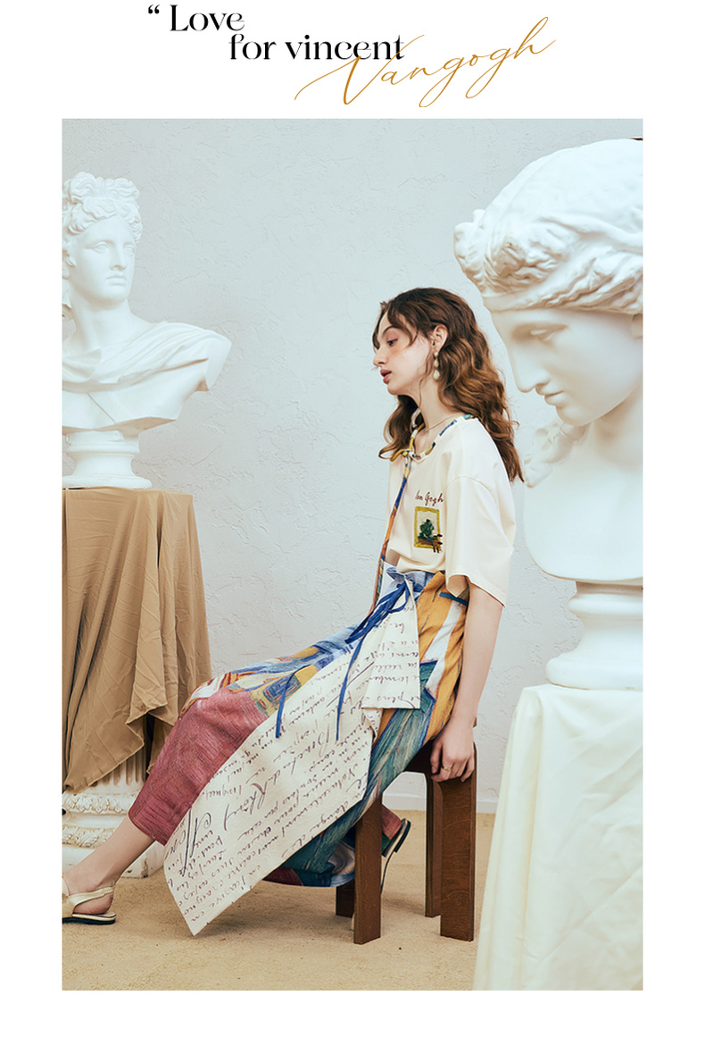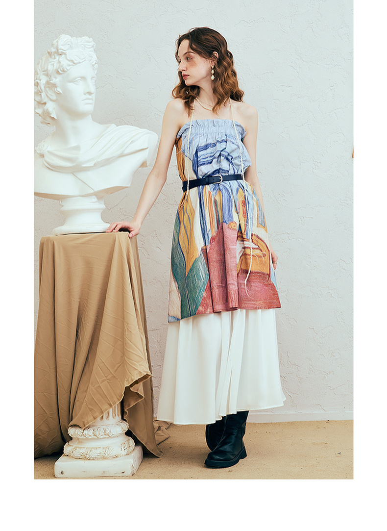 两三事梵高文艺艺术长廊2025夏季新款复古印花抽绳绑带两穿半身裙