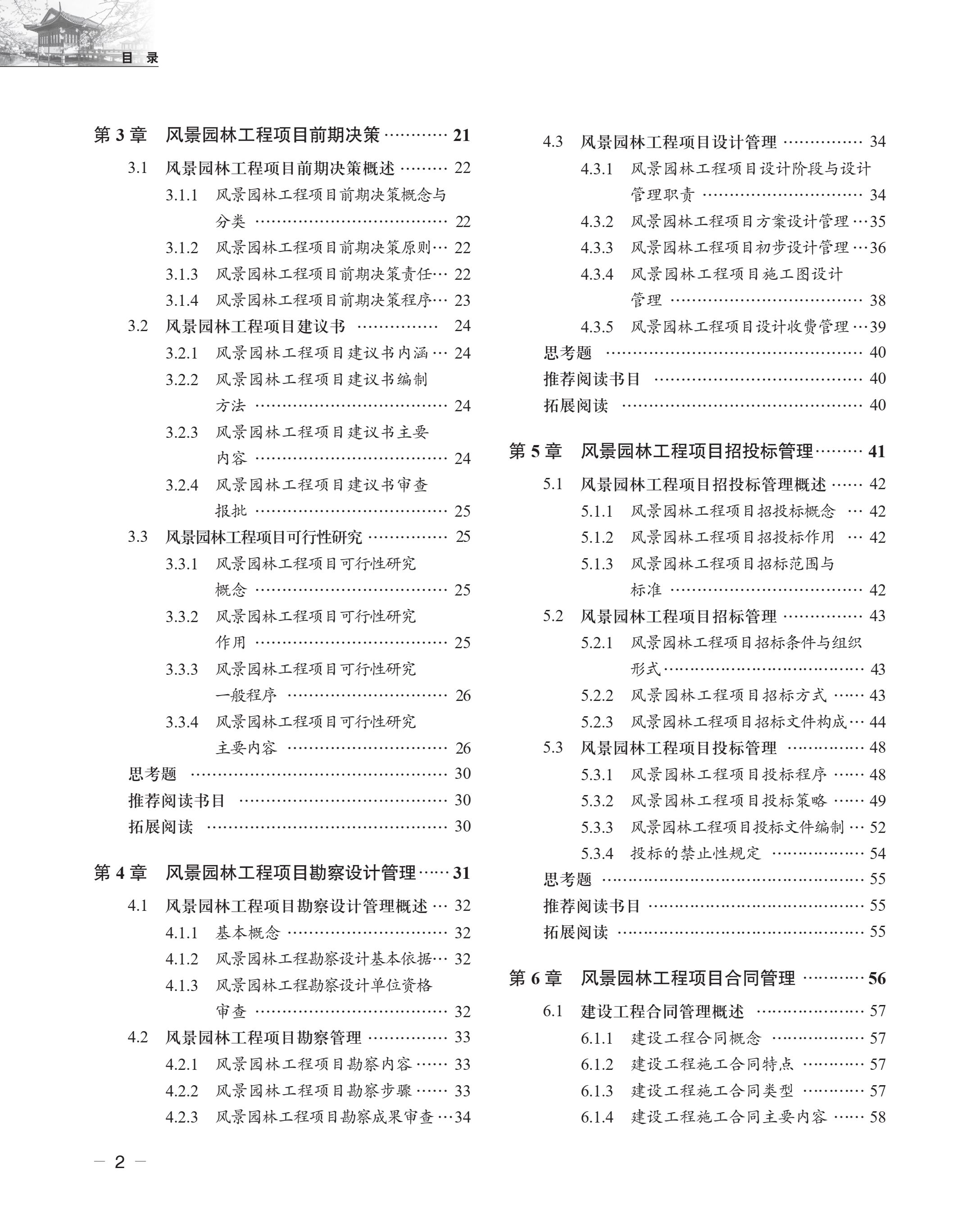 本教材适用于高等院校风景园林、园林、环境设计、人文地理与城乡规划等相关专业教学,也可供建设单位、设计单位、施工单位、监理单位、咨询单位、工程管理单位等从事相关专业的工作人员参考。