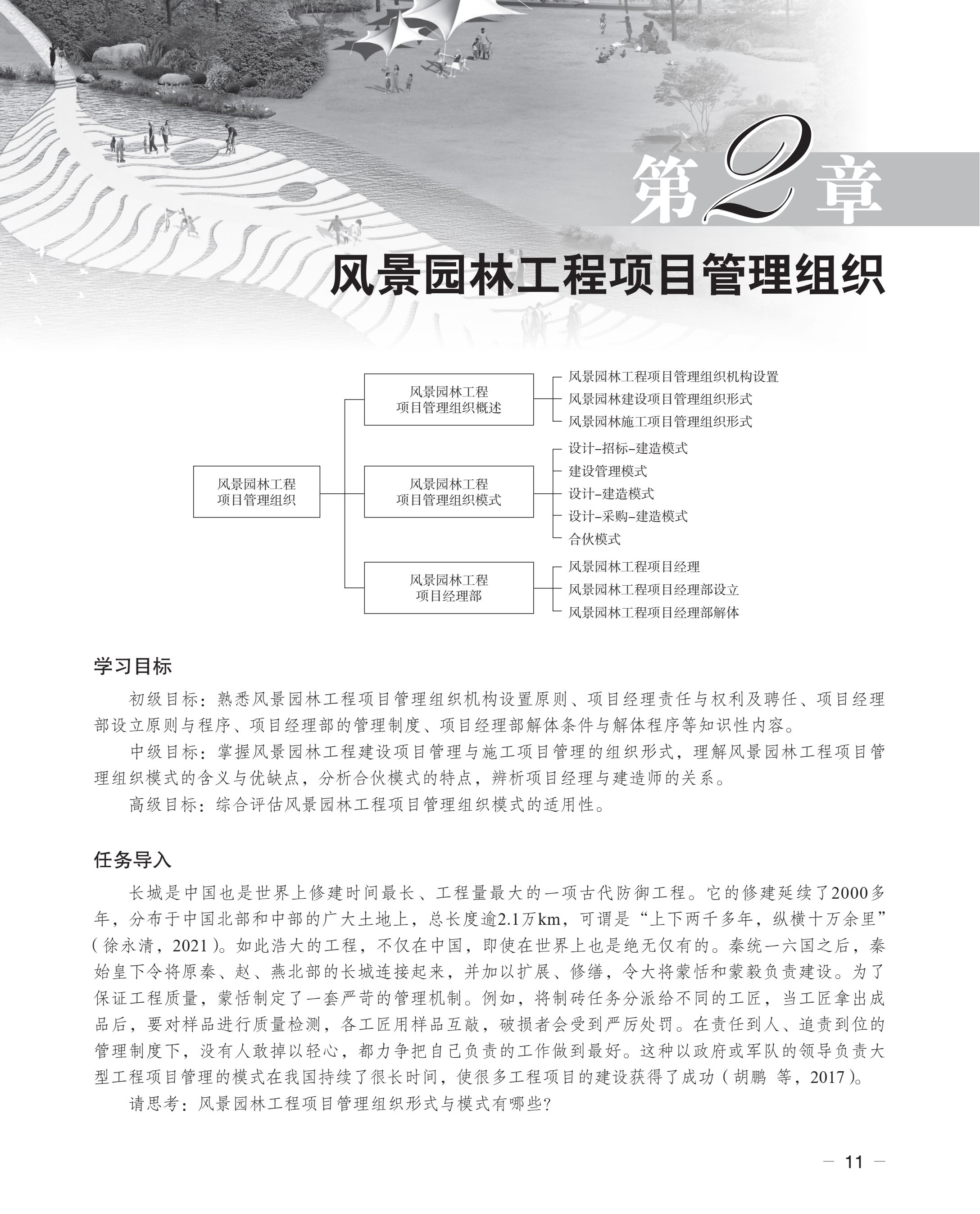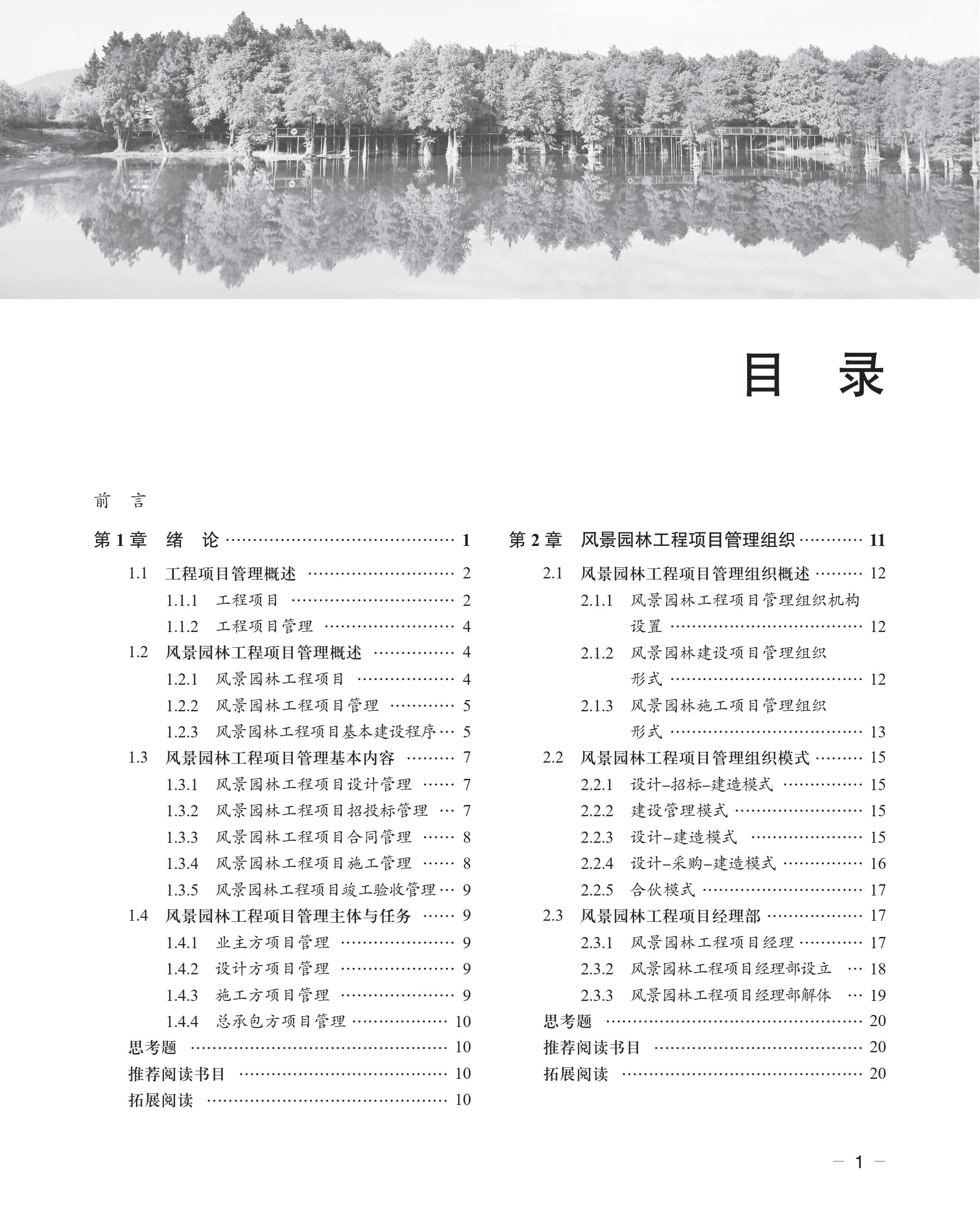 本教材借鉴吸收近年来风景园林工程项目管理研究成果和实践经验,力求契合风景园林工程项目管理应用型人才培养的需求。主要内容包括:绪论,风景园林工程项目管理组织、前期决策、勘察设计管理、招投标管理、合同管理,风景园林工程施工组织设计,风景园林工程项目成本管理、进度管理、质量管理及竣工验收管理。