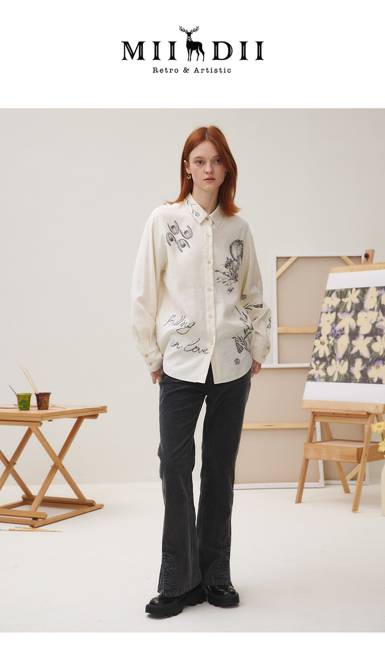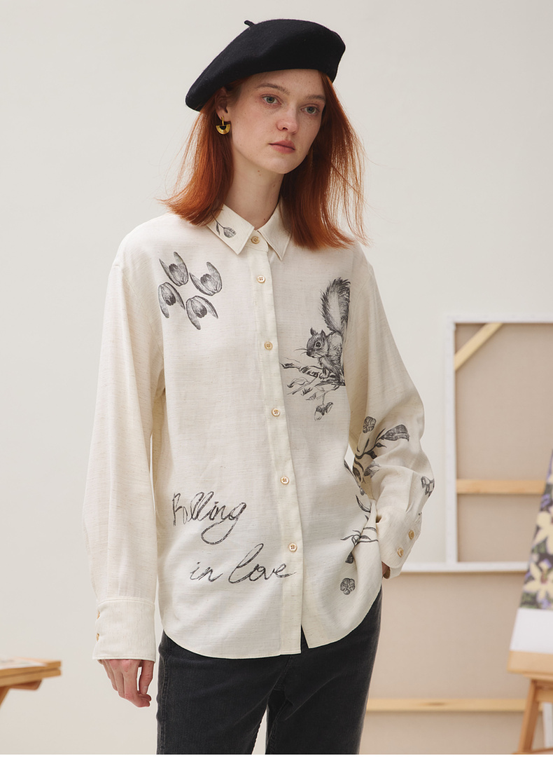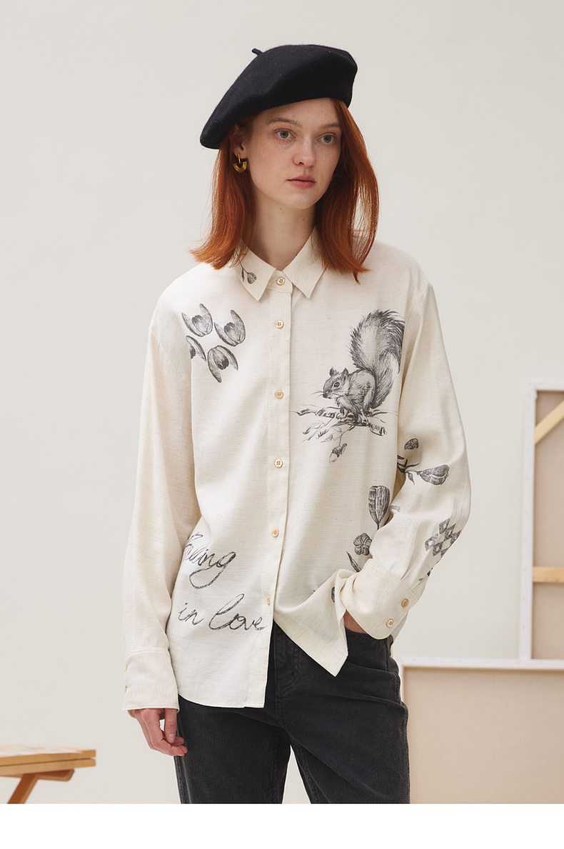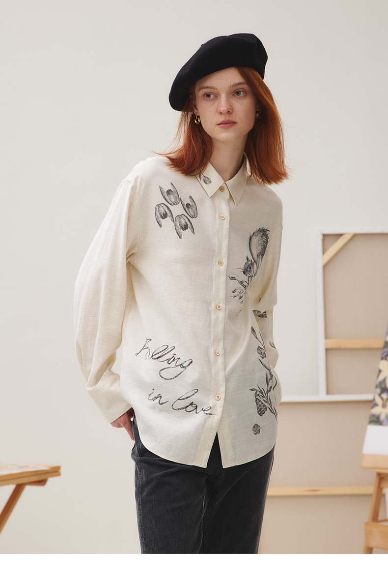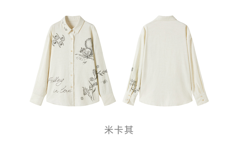 谜底衬衣长袖女2025秋季新品复古通勤亚麻混纺印花衬衫253MC1176