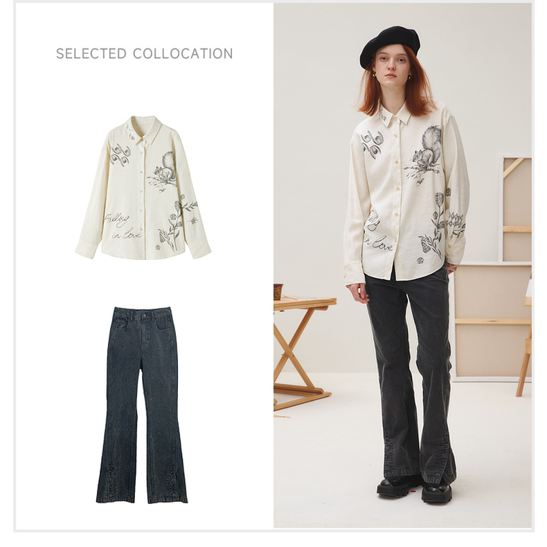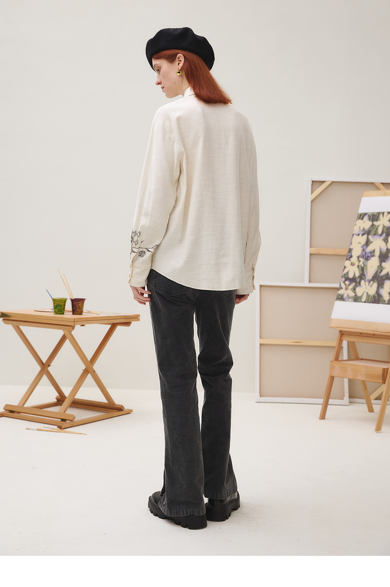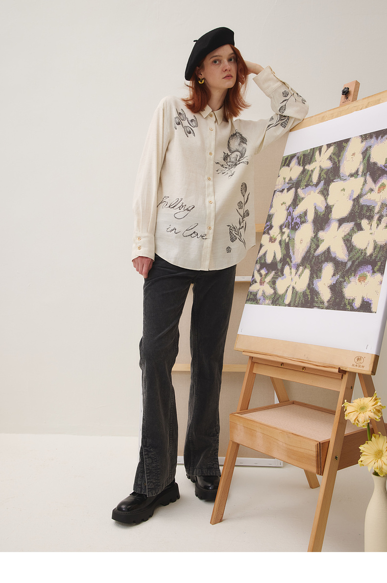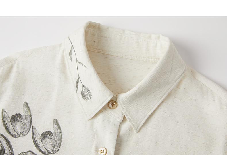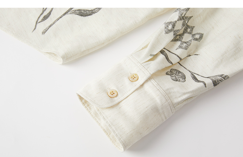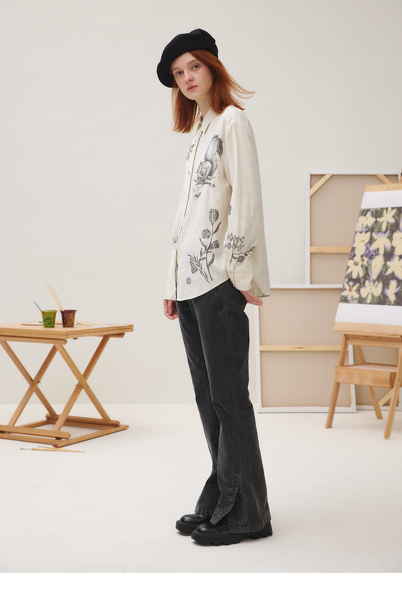 谜底衬衣长袖女2025秋季新品复古通勤亚麻混纺印花衬衫253MC1176