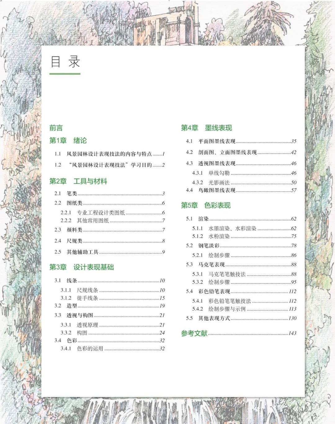 本书针对园林设计手绘,主要内容涵盖手绘工具介绍、风景园林设计的平面图表现、剖立面图表现、透视图表现等。重点讲解钢笔线稿、钢笔淡彩、水彩渲染、马克笔表现、彩色铅笔表现的具体方法和技巧,提供清晰明确的技能方法图示和优秀范例,旨在帮助学生提高风景园林设计的手绘表现水平。