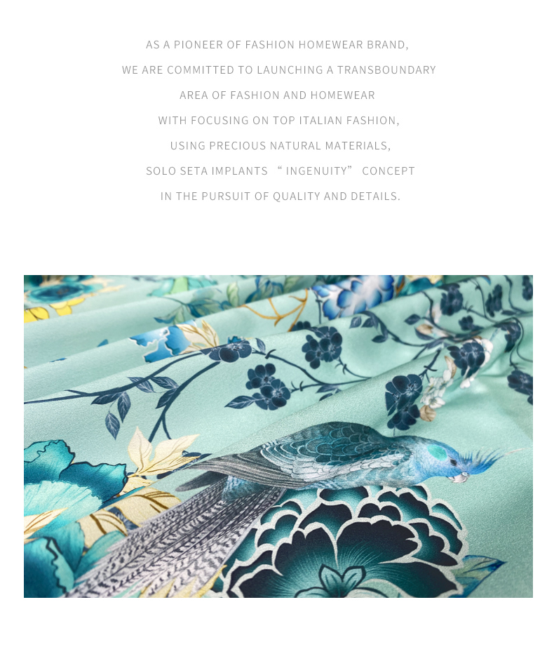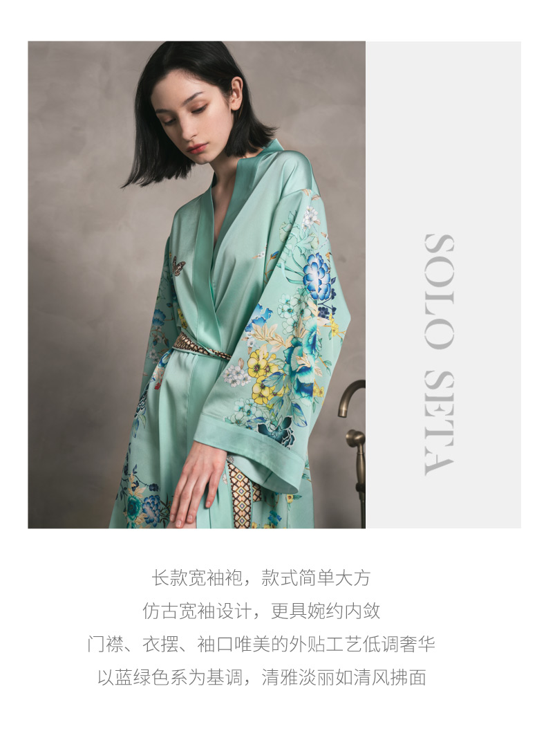 - soloseta专注于真丝织物,灵感源自意大利语,中文含义为“只做真丝”的意思。让睡衣变时尚,居家和外出瞬间切换,使其更具有出街,度假,参加宴会等功能。