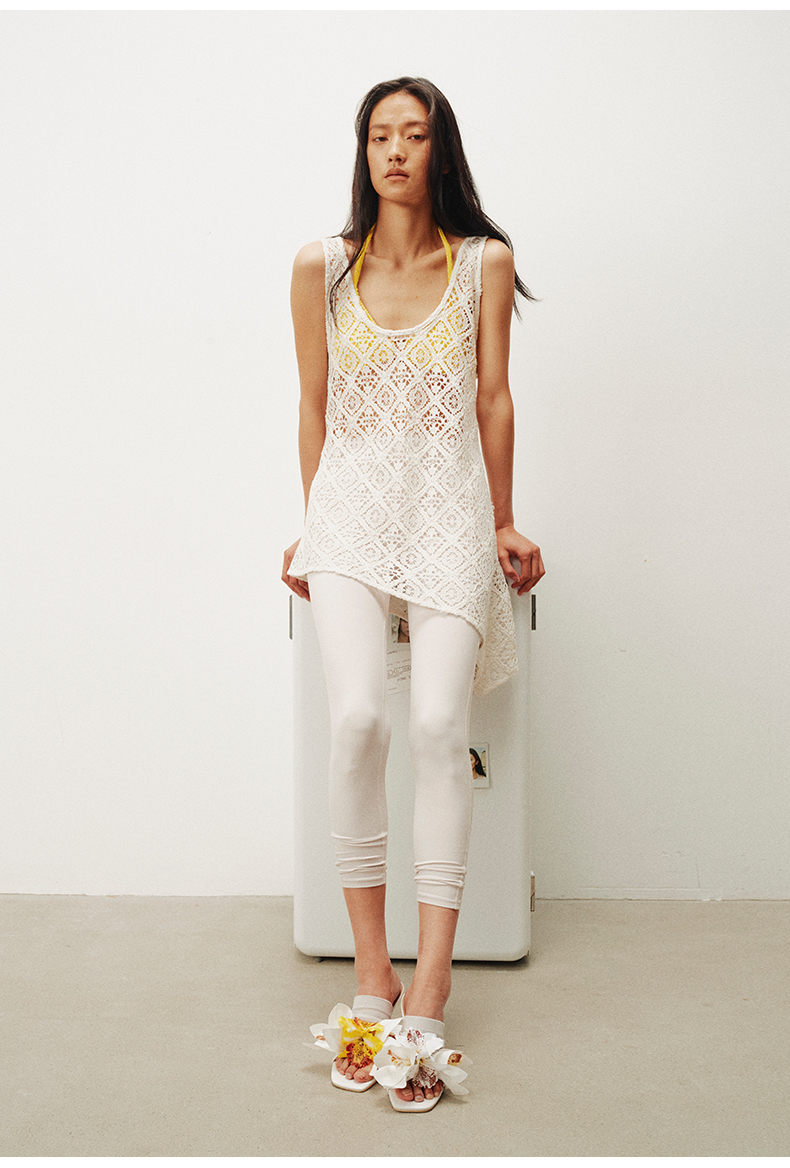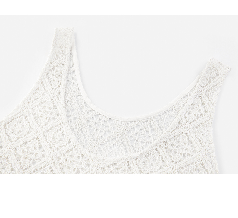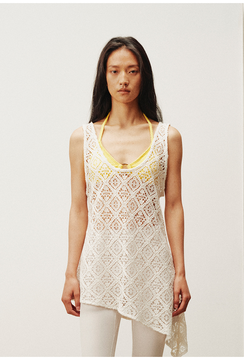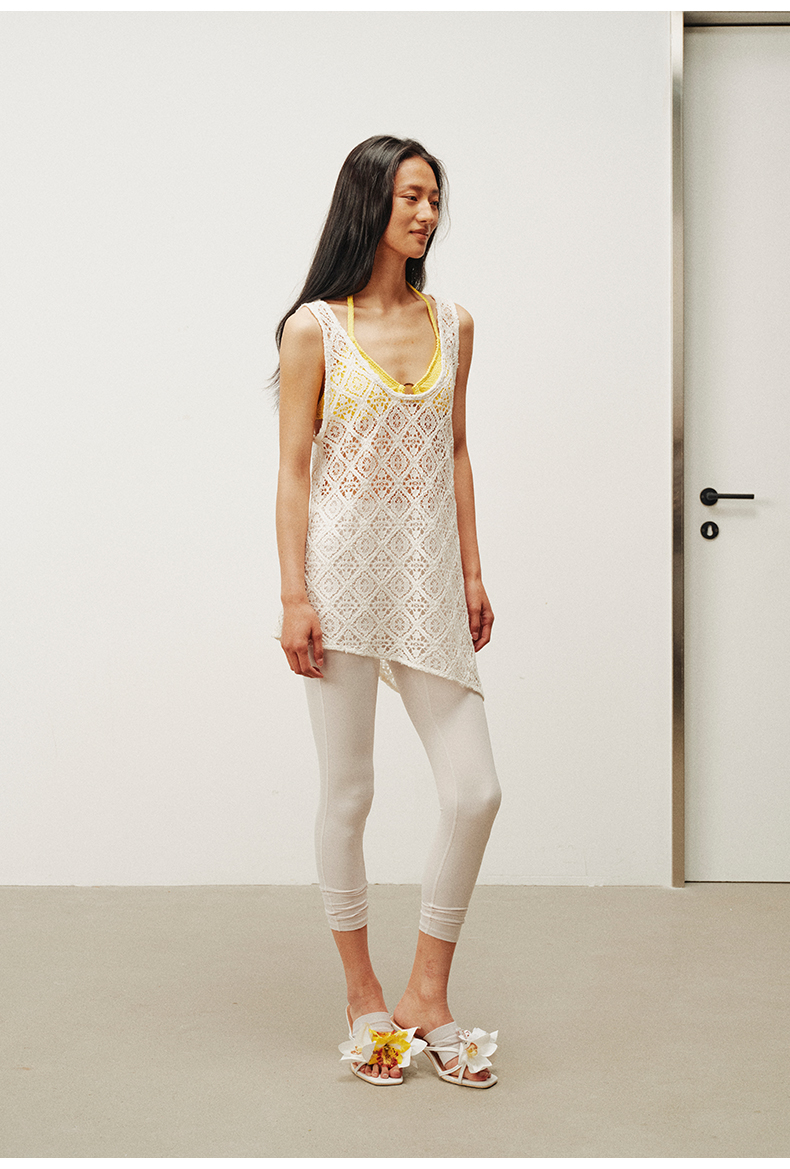 NUTH 大U领度假感半透镂空中长款工字背心罩衫 米白色