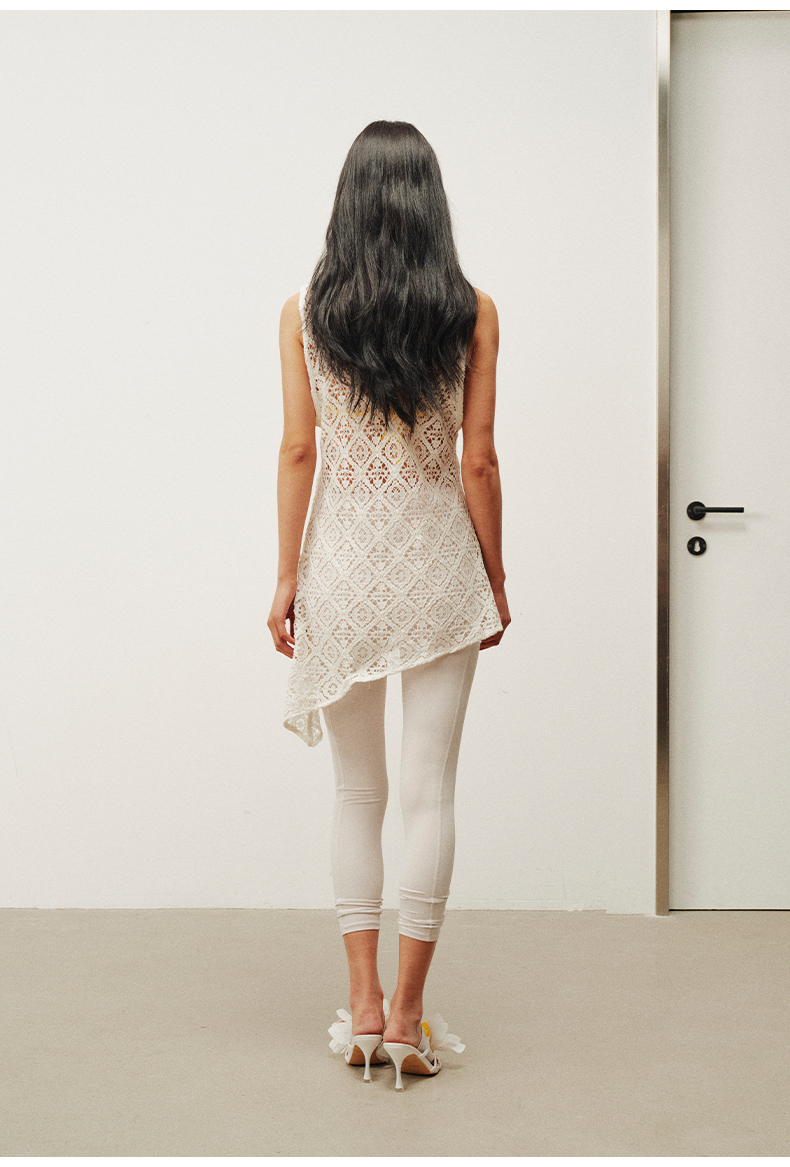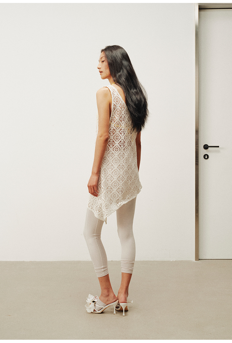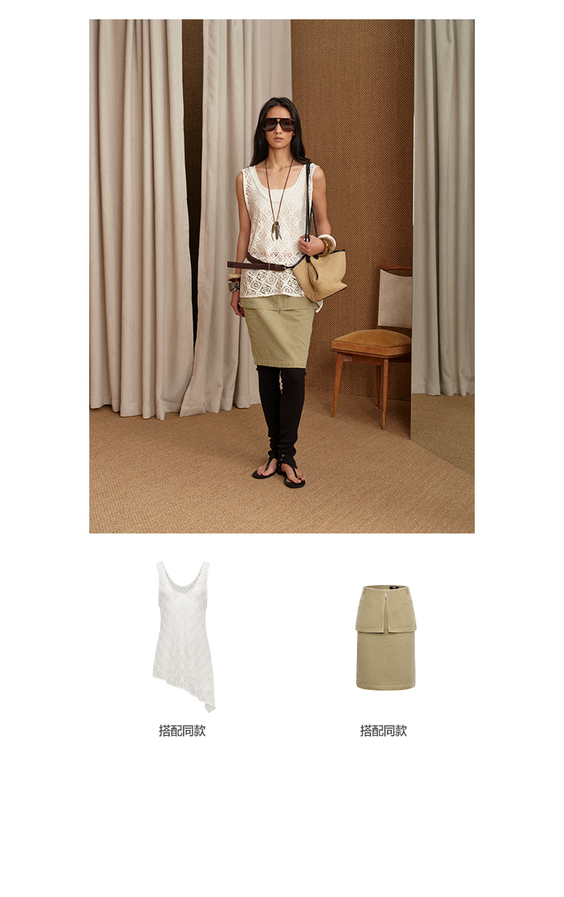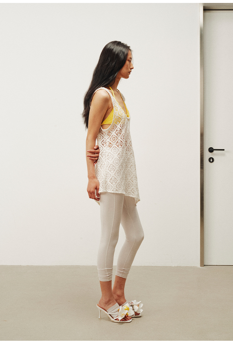NUTH 大U领度假感半透镂空中长款工字背心罩衫 米白色