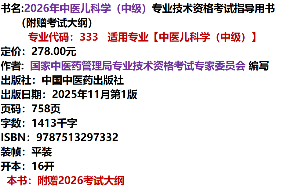 2026年中医儿科学(中级)专业技术资格考试指导用书 专业代码333国家中医药管理局专业技术资格考试专家委员会 中国中医药出版社