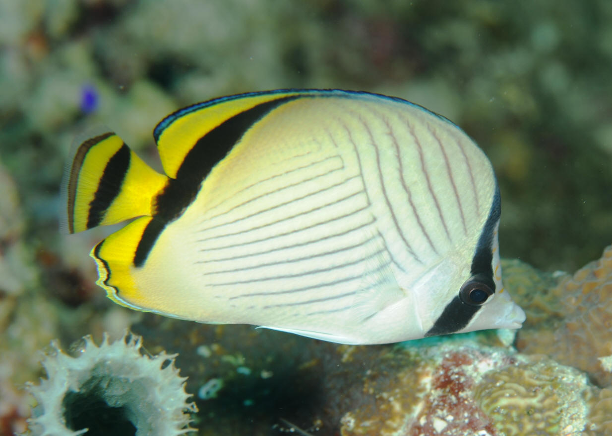 也叫飘浮蝴蝶鱼。身体主要颜色为白色,带有暗色斜纹。眼睛上有黑色条纹穿过,背鳍、尾鳍及臀鳍是黄色带两条黑色条纹。