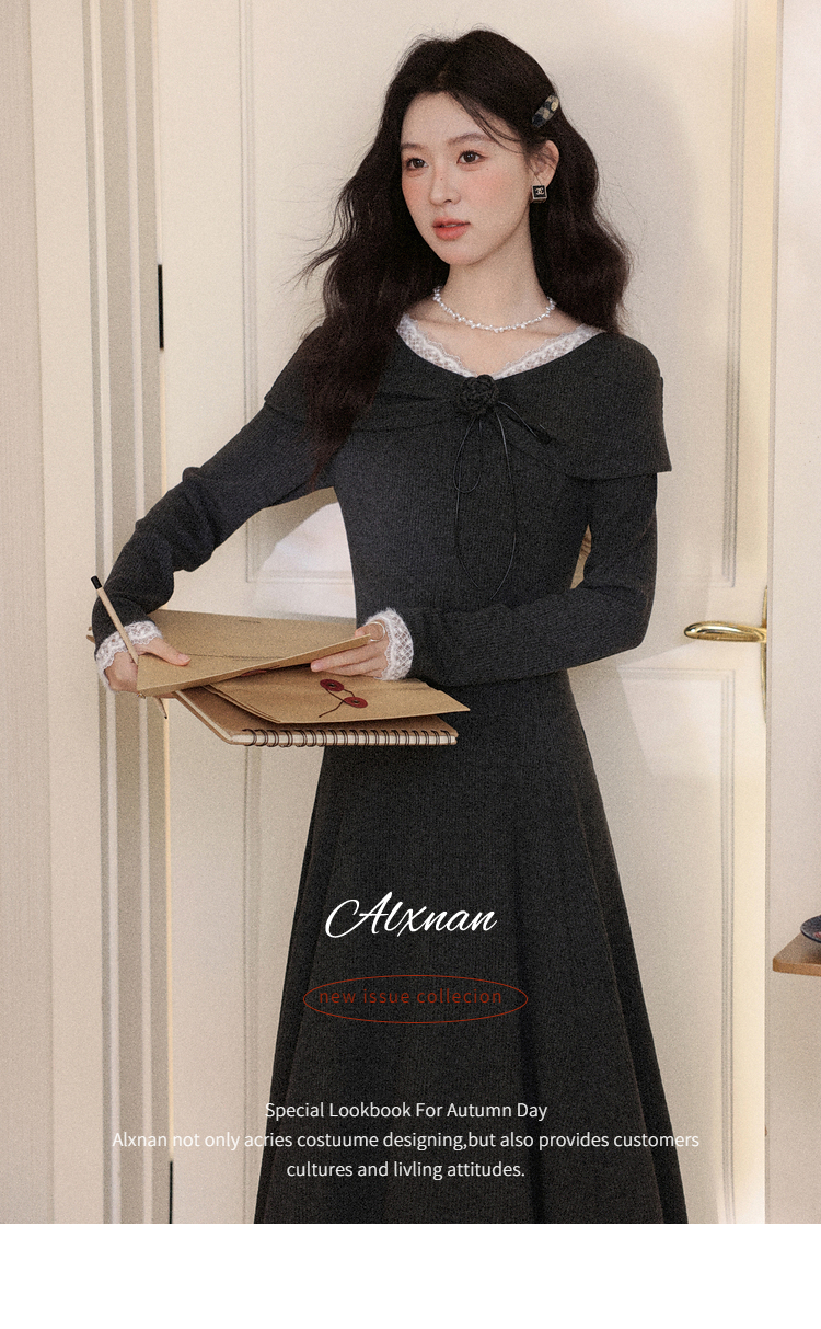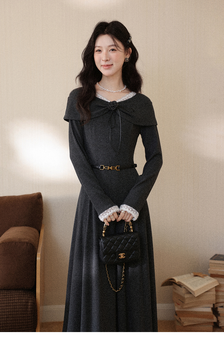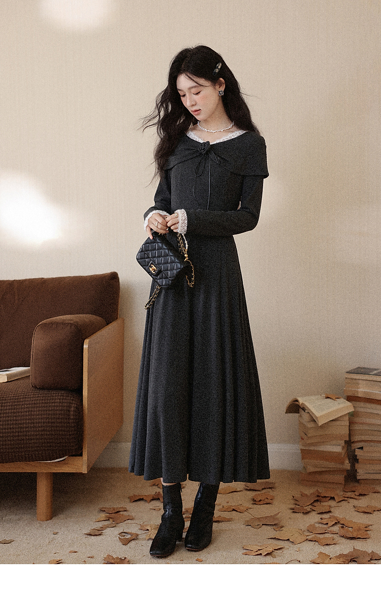 鹿向南「雾屿静语」黑色设计感长袖连衣裙女秋冬新款叠穿气质长裙