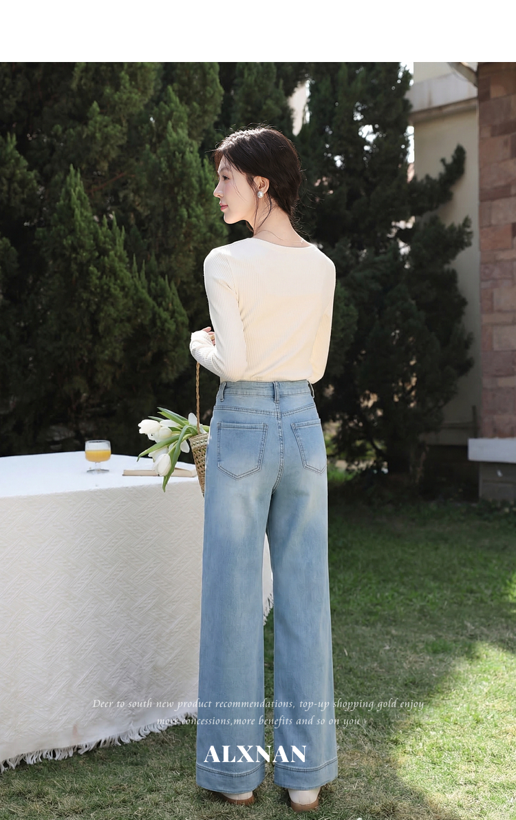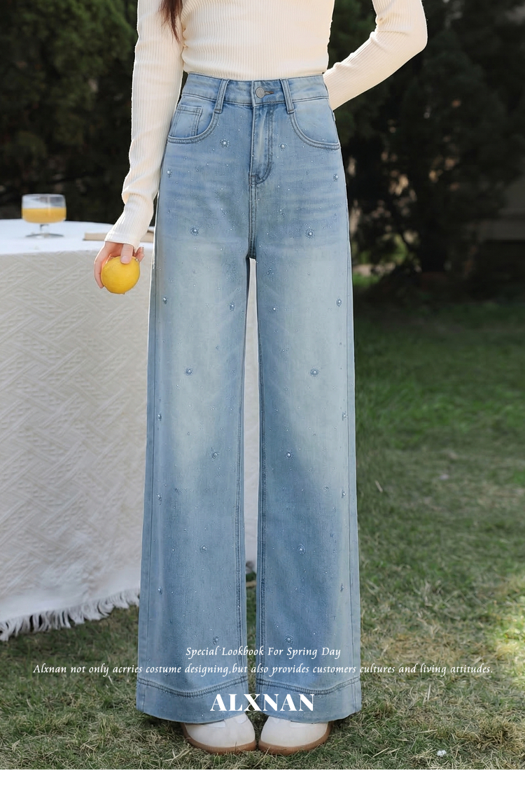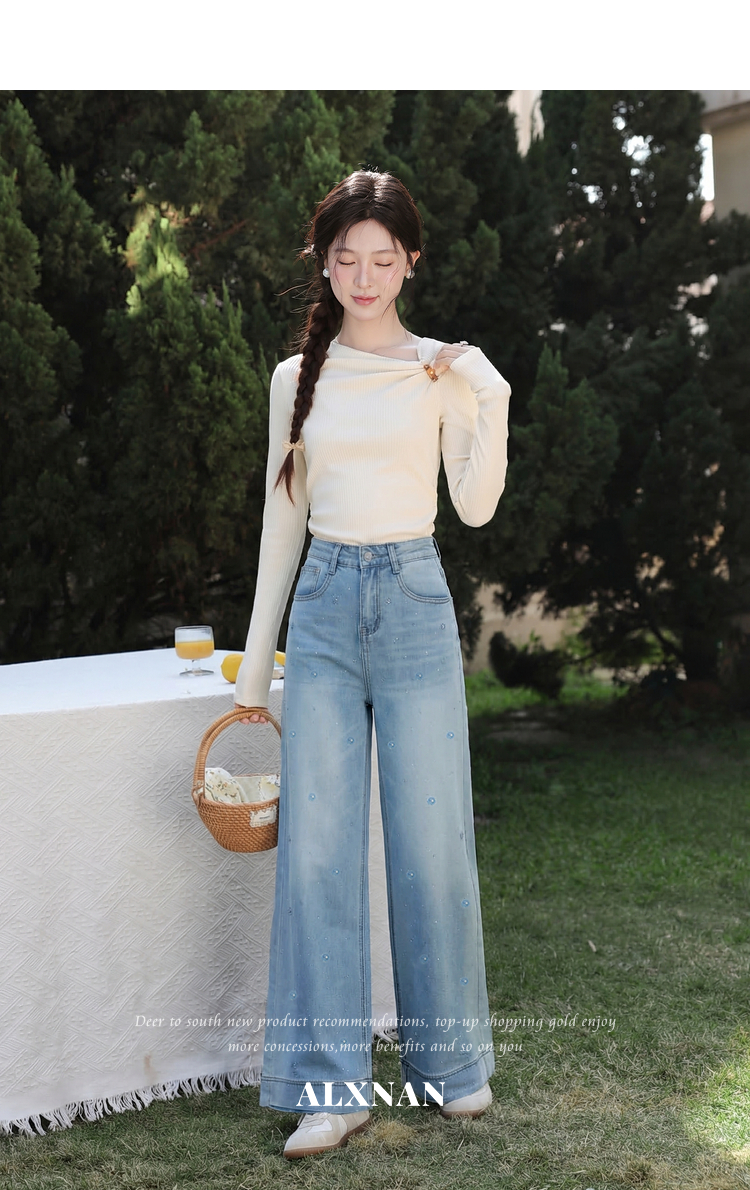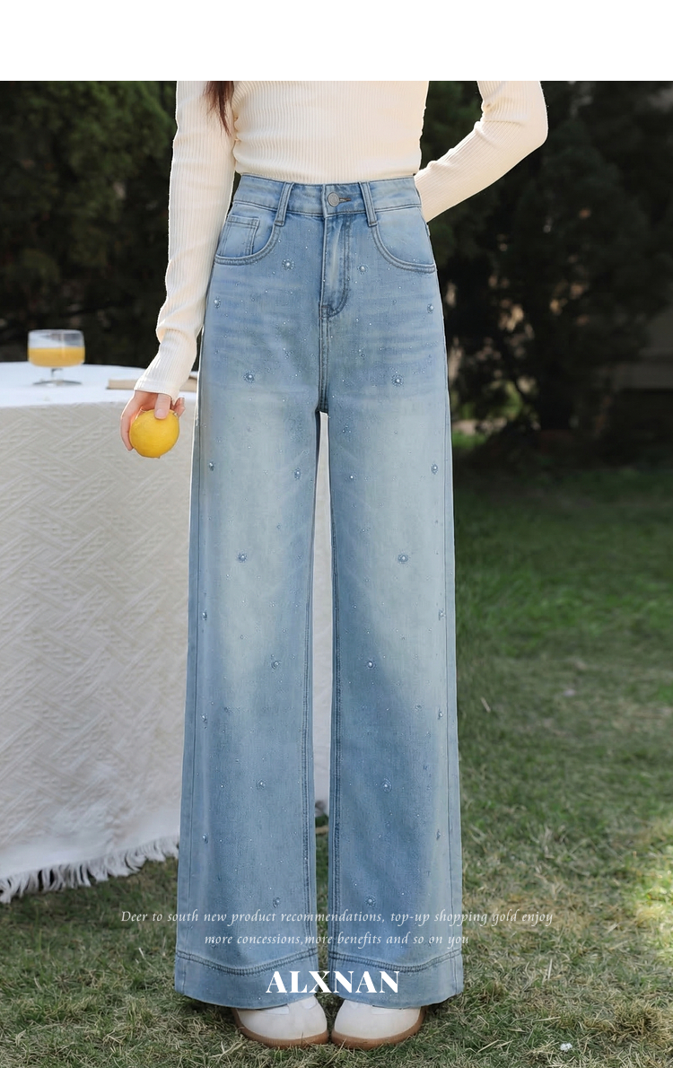 鹿向南「甜芜漫庭」蓝色牛仔裤夏季新款时尚印花小众设计感长裤女