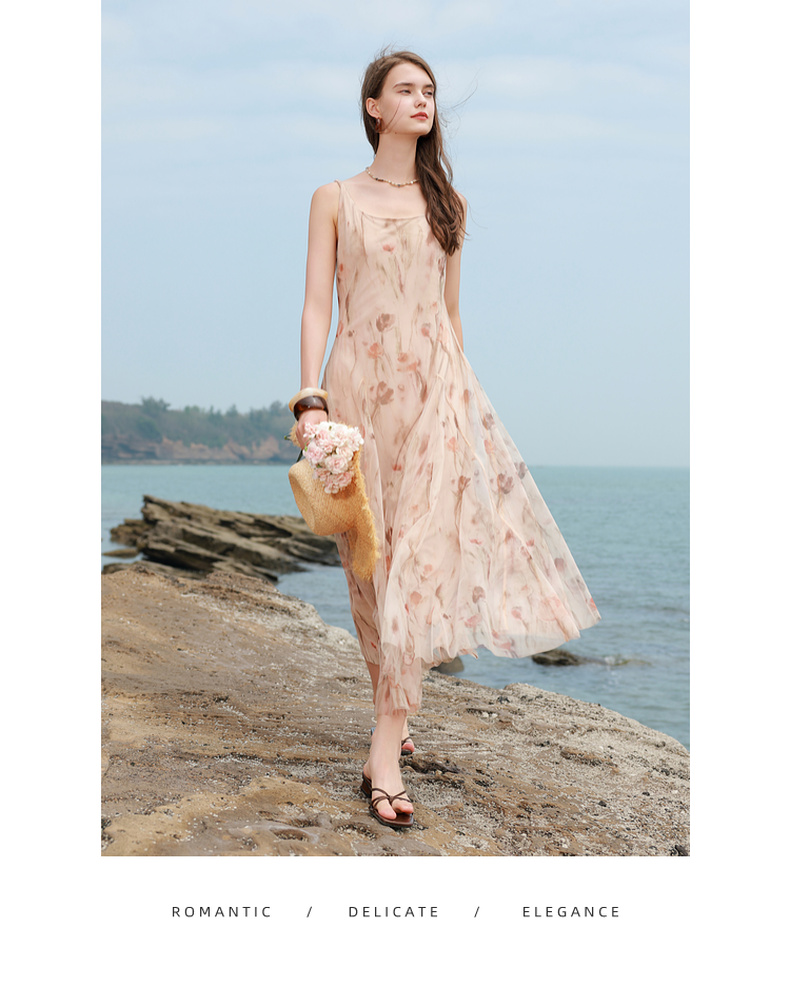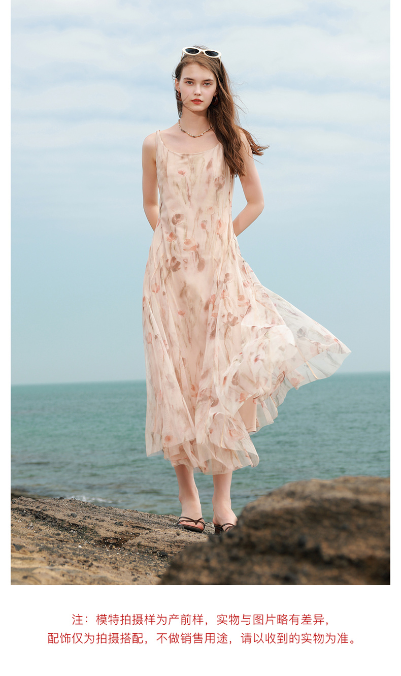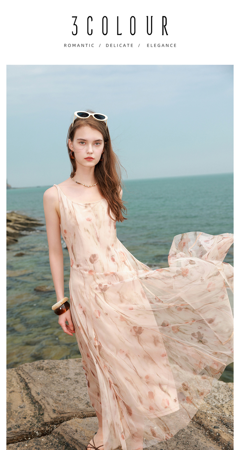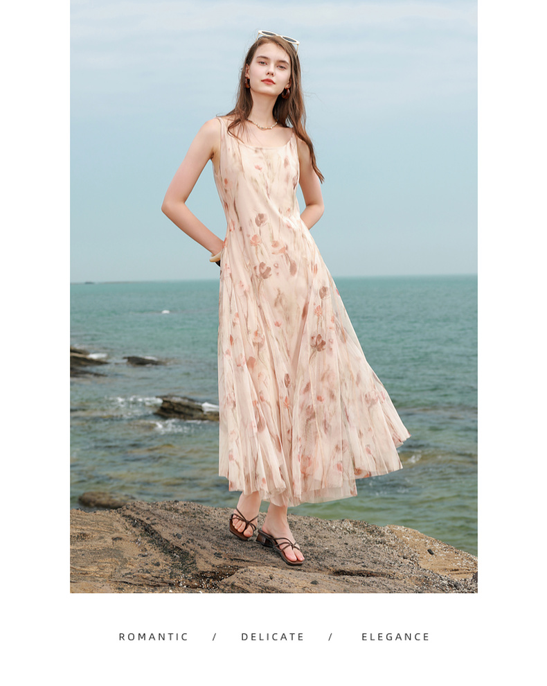三彩2025夏季新款网纱吊带裙收腰A字裙氛围感长裙度假浪漫M