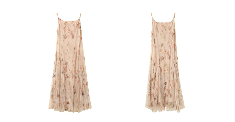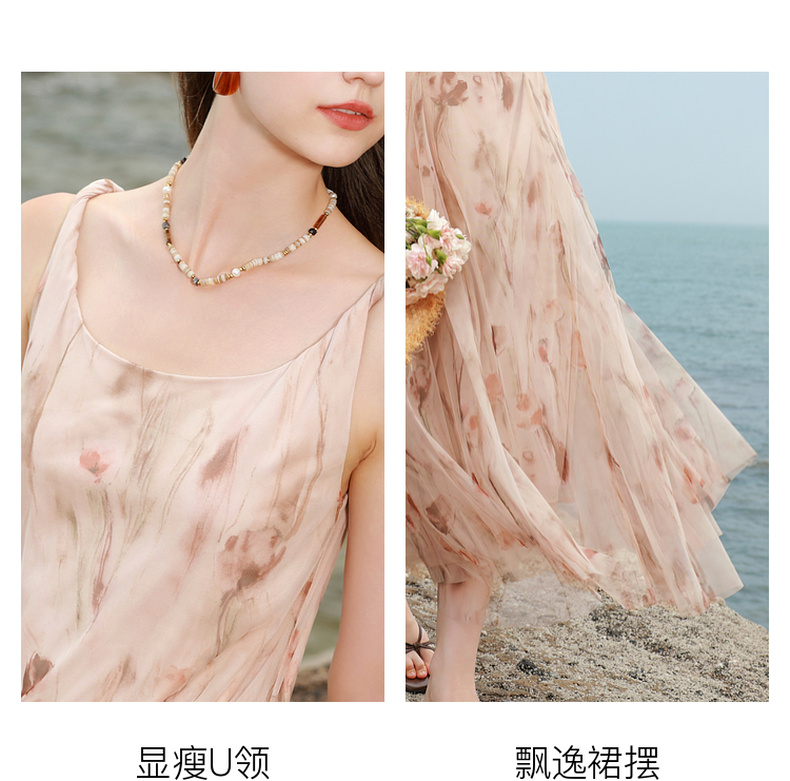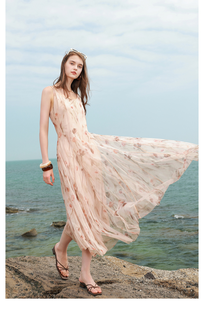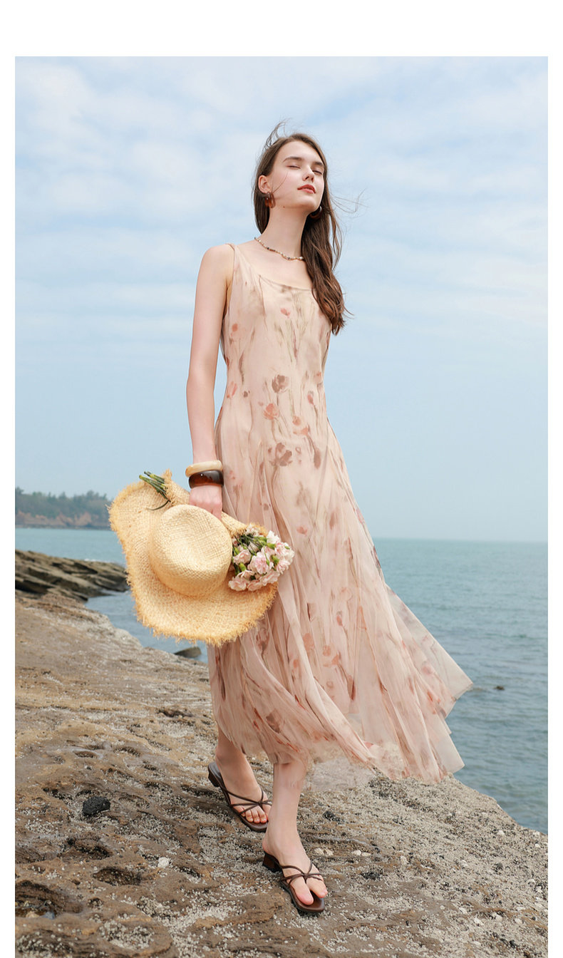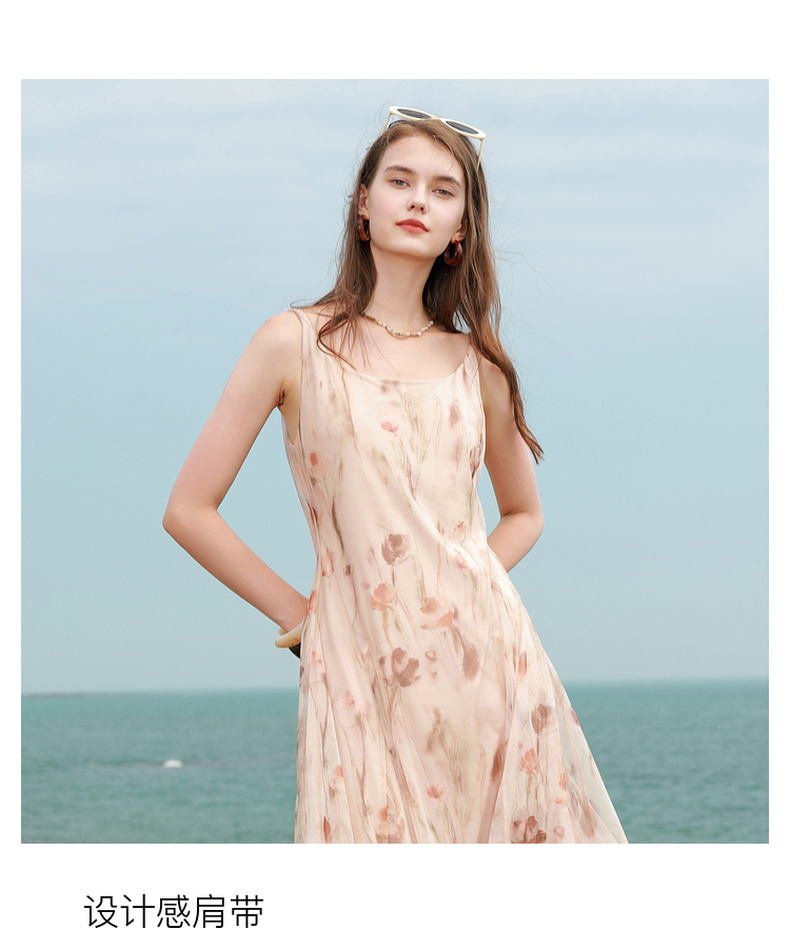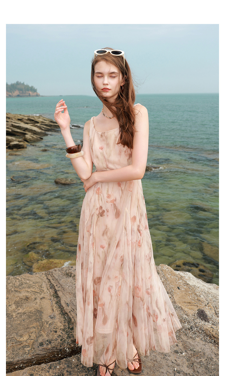 三彩2025夏季新款网纱吊带裙收腰A字裙氛围感长裙度假浪漫M
