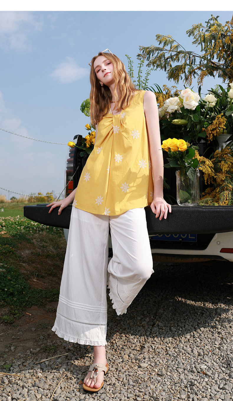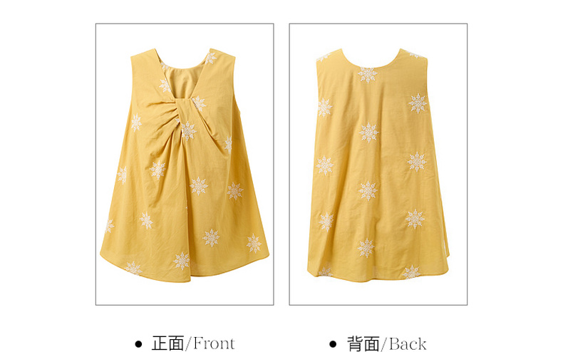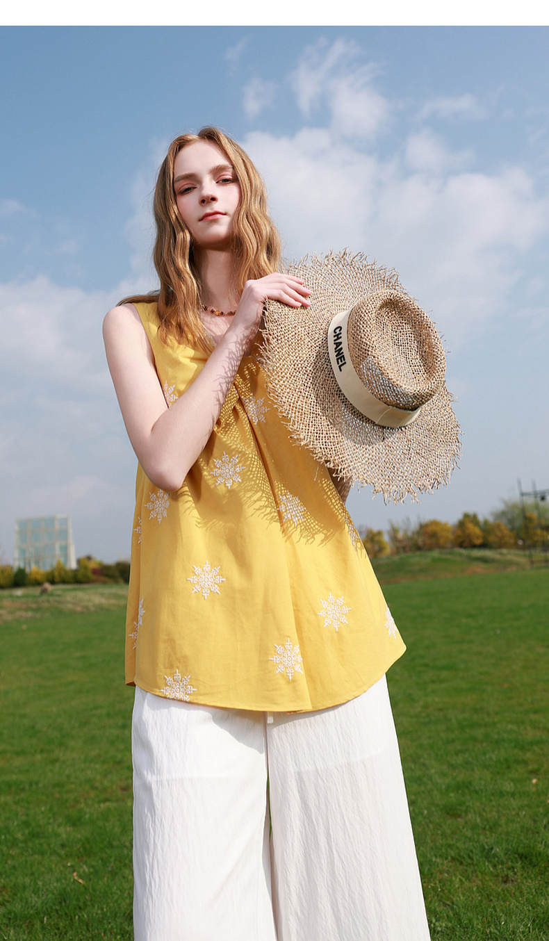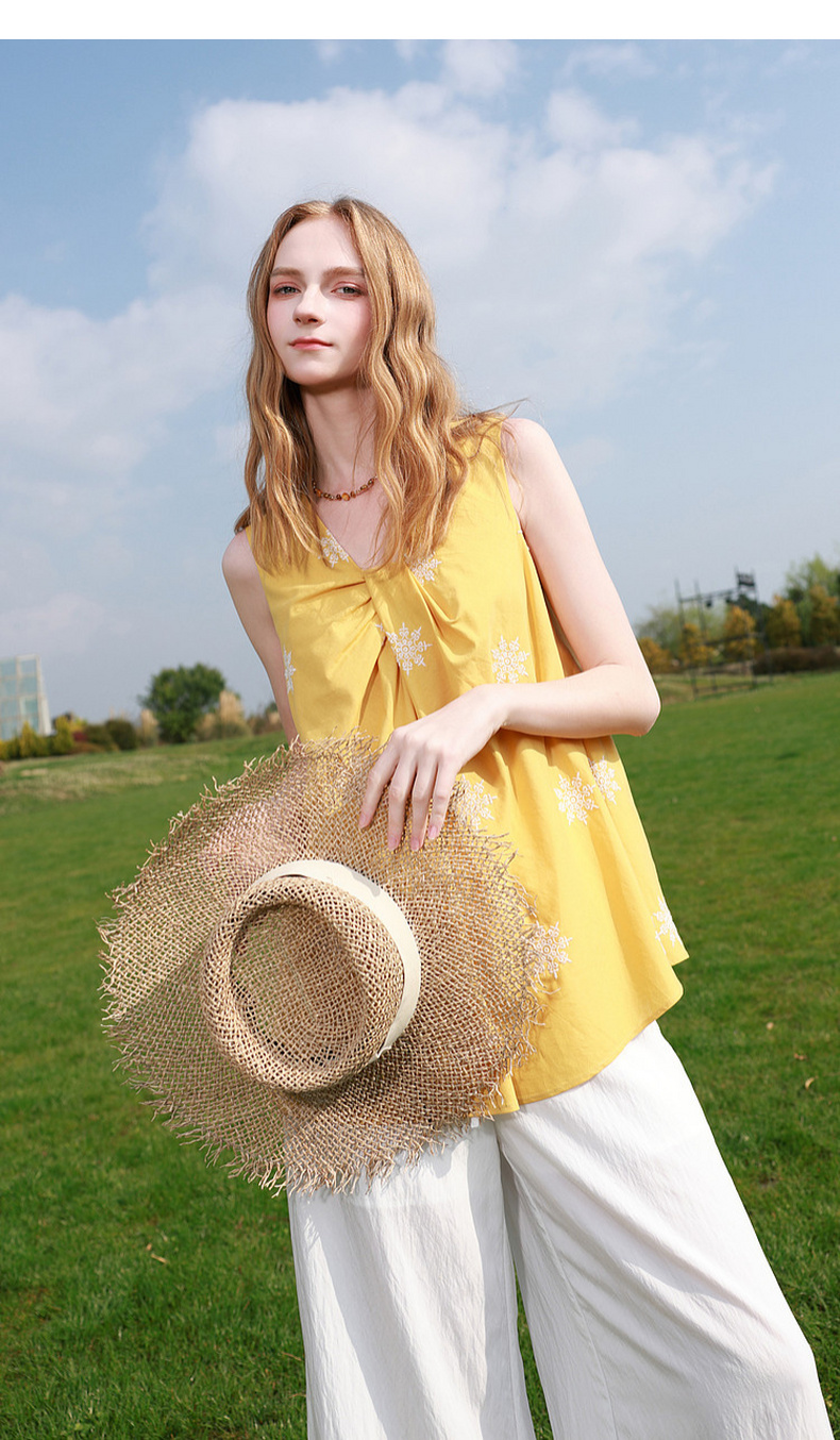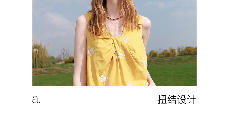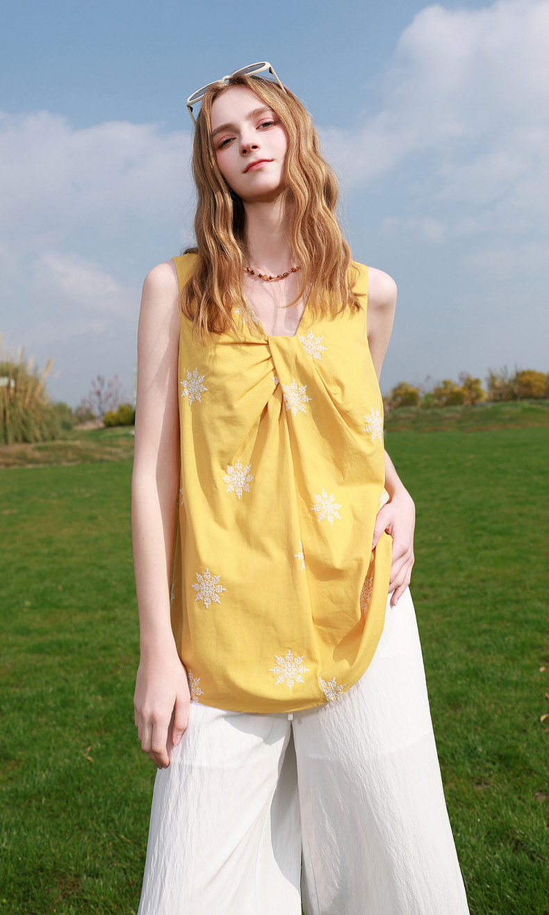 三彩2026夏季新款绣花小衫无袖V领扭结上衣套头M
