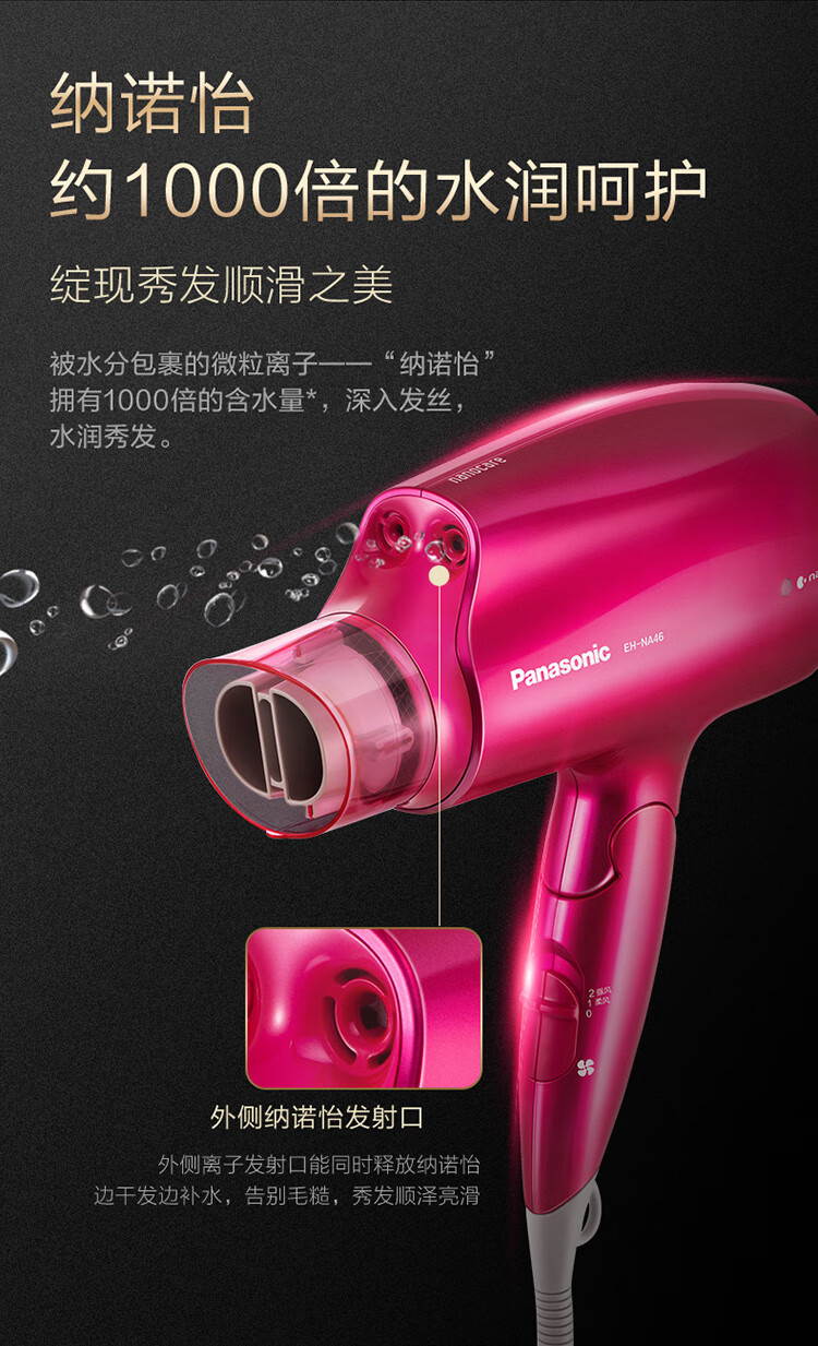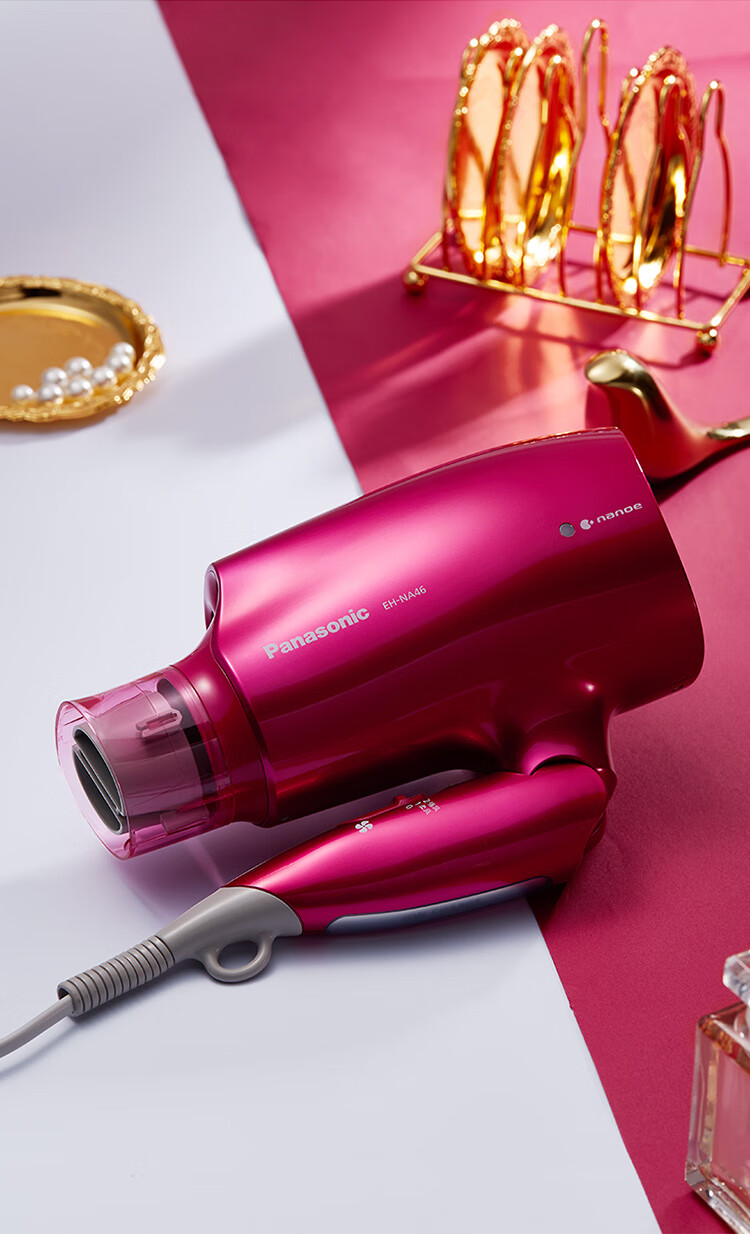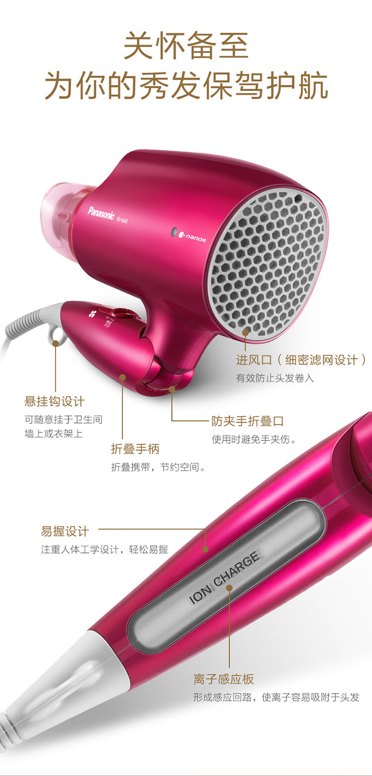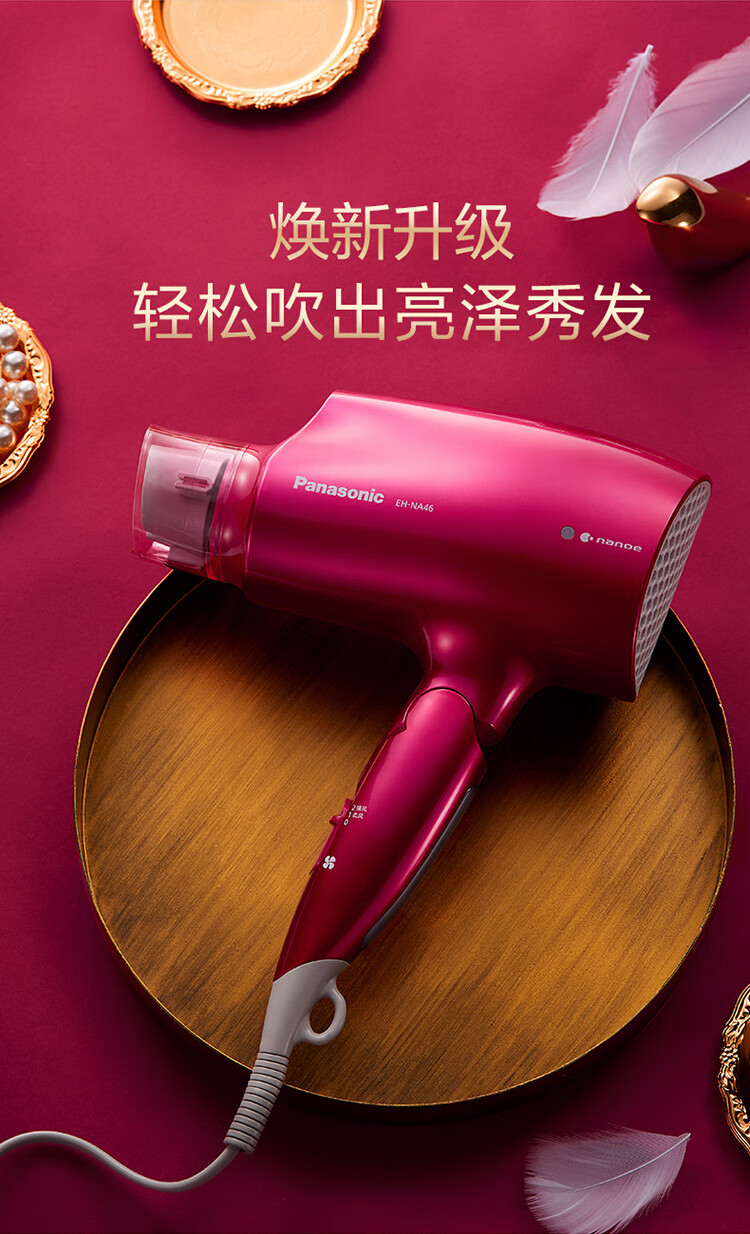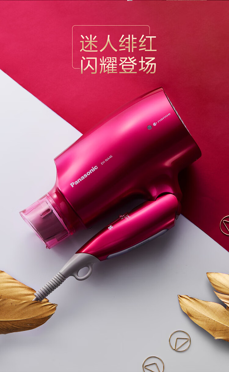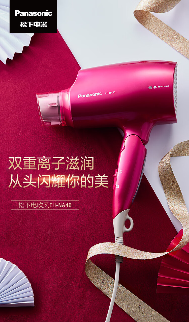 松下(Panasonic)电吹风机大功率高速大风力家用送老婆女友折叠便携纳诺怡负离子水润护发电吹风筒EH-NA46红色