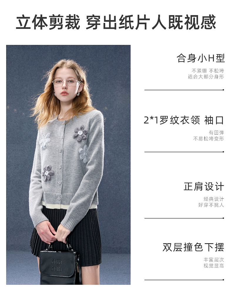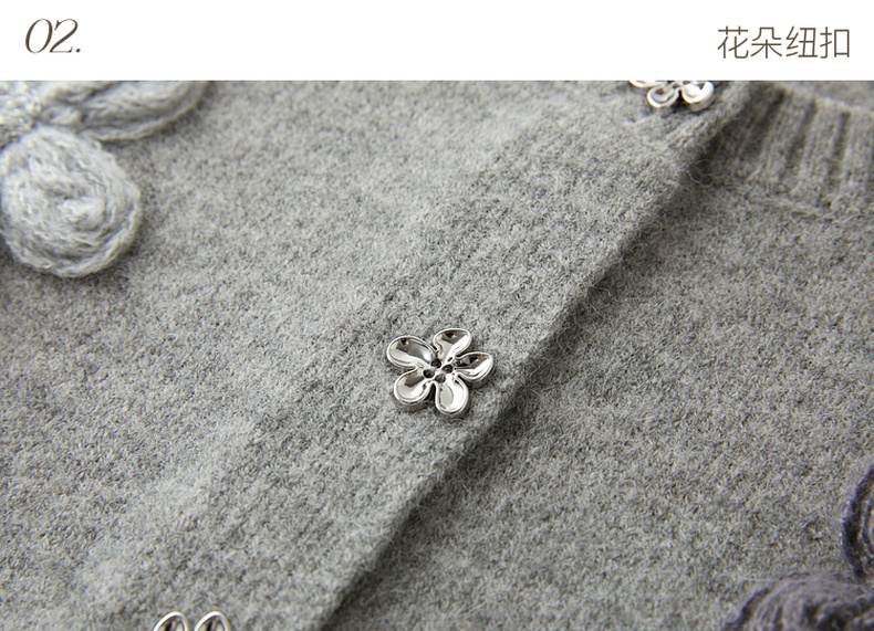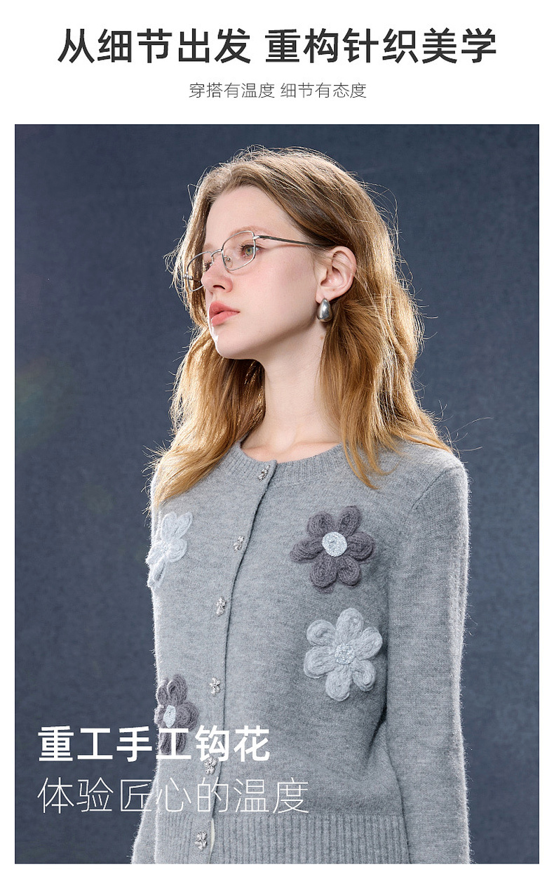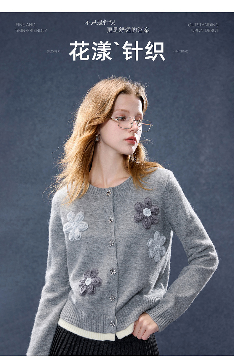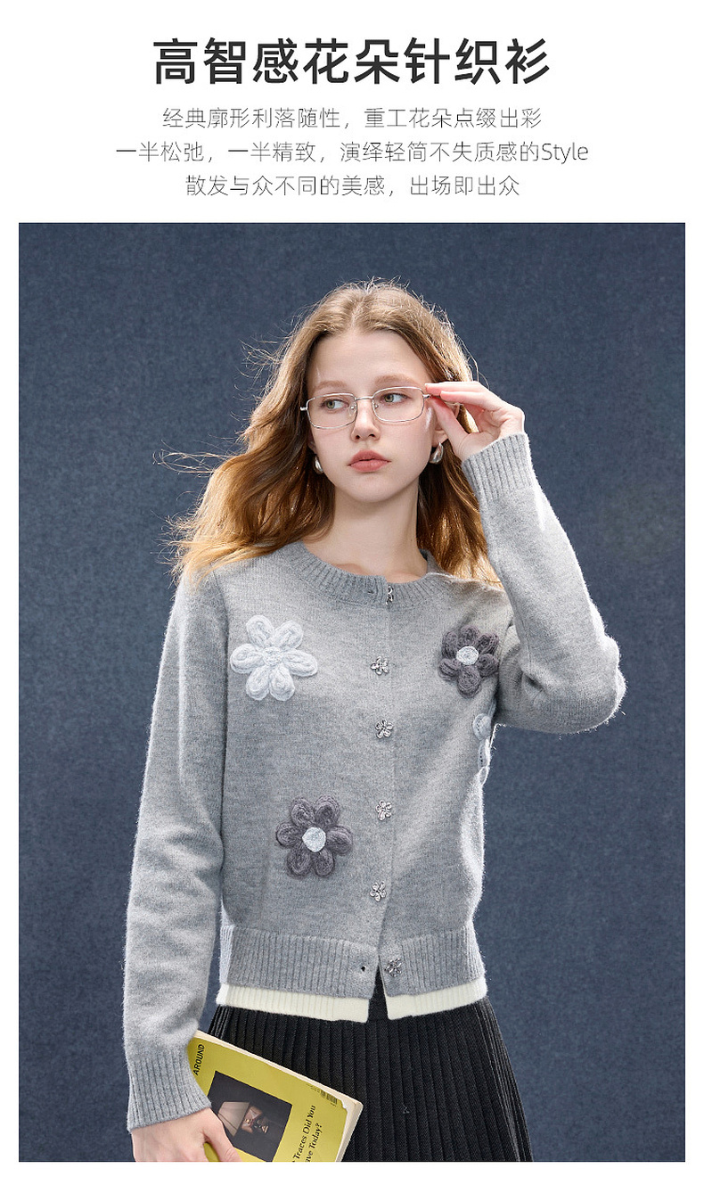 三彩2026春季新款手工花朵开衫针织衫圆领毛衫休闲上衣简约M