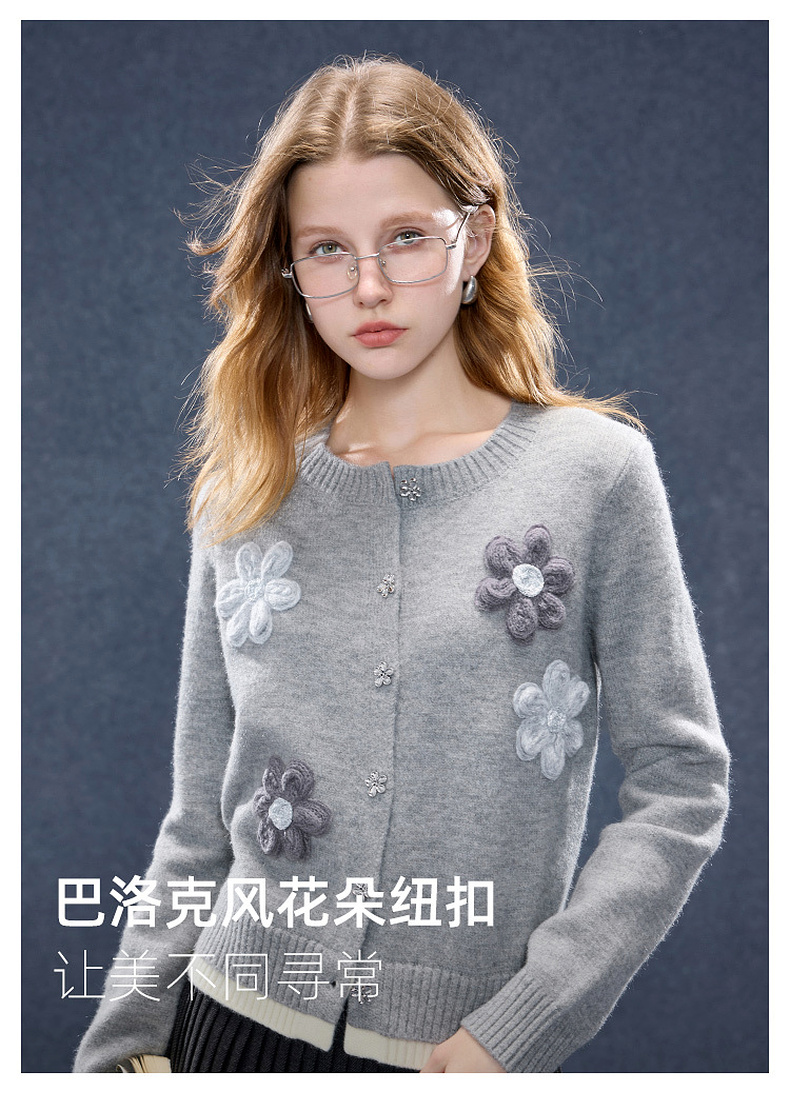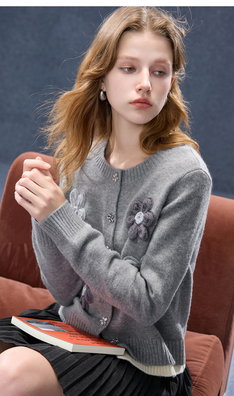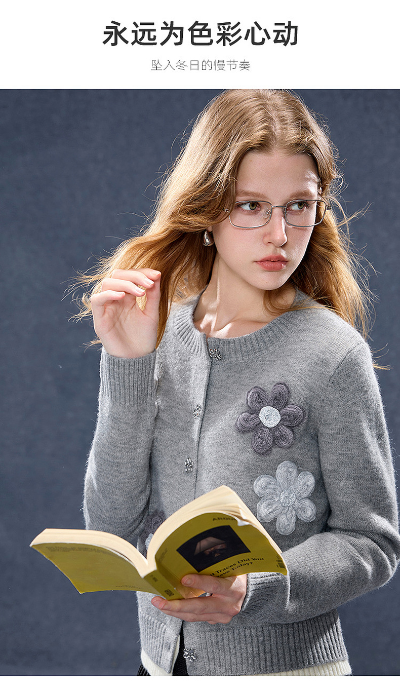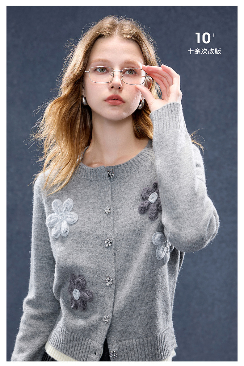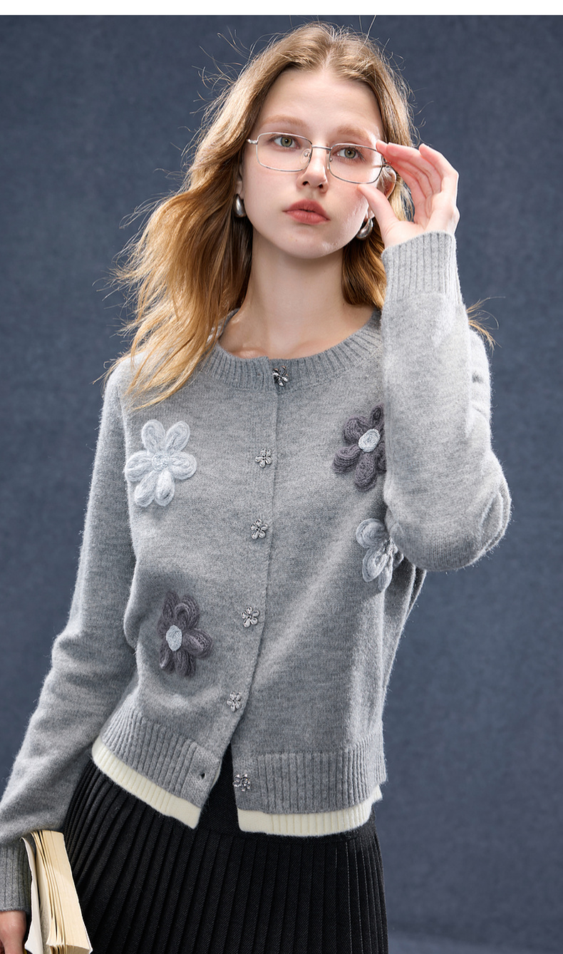 三彩2026春季新款手工花朵开衫针织衫圆领毛衫休闲上衣简约M