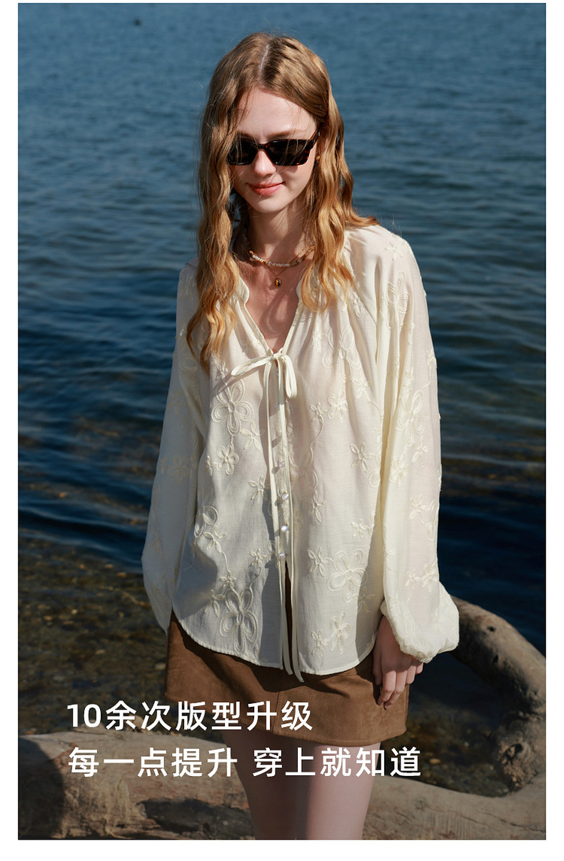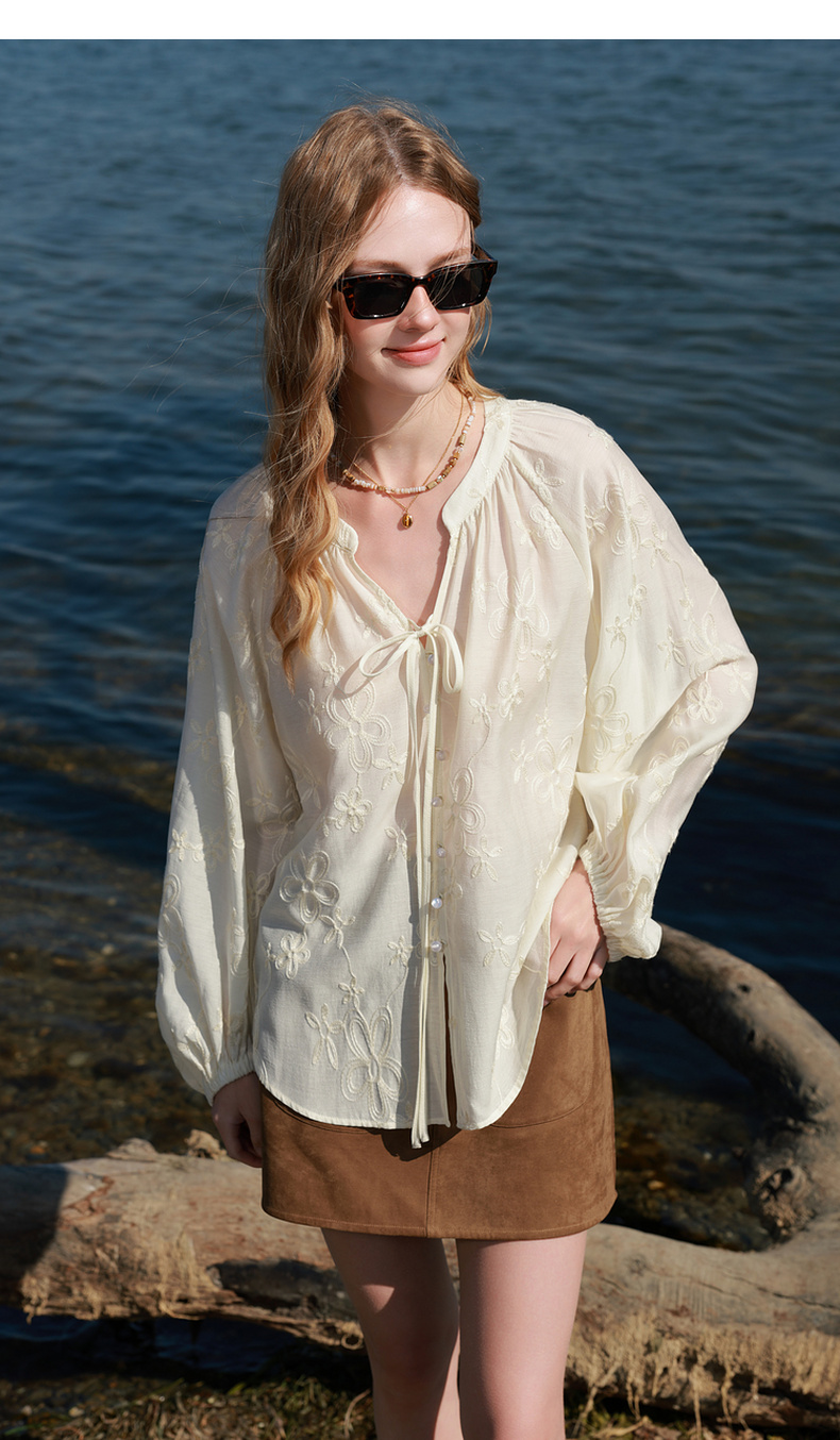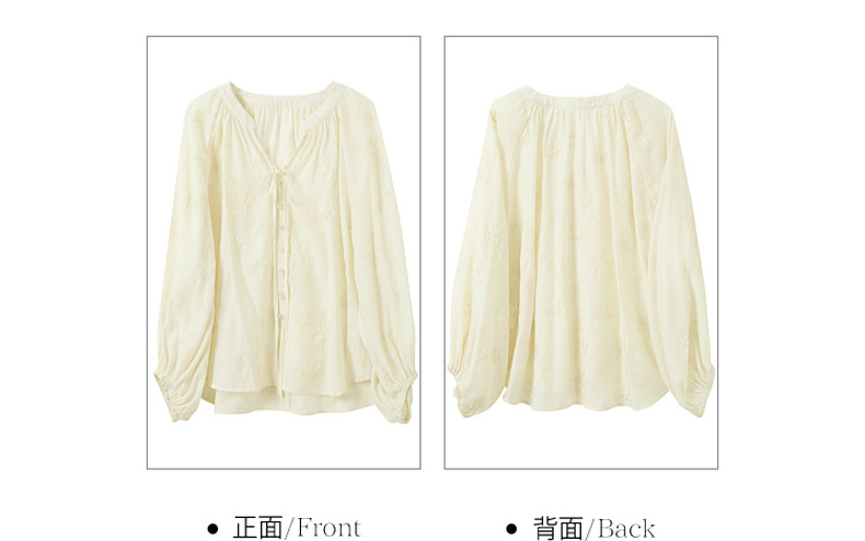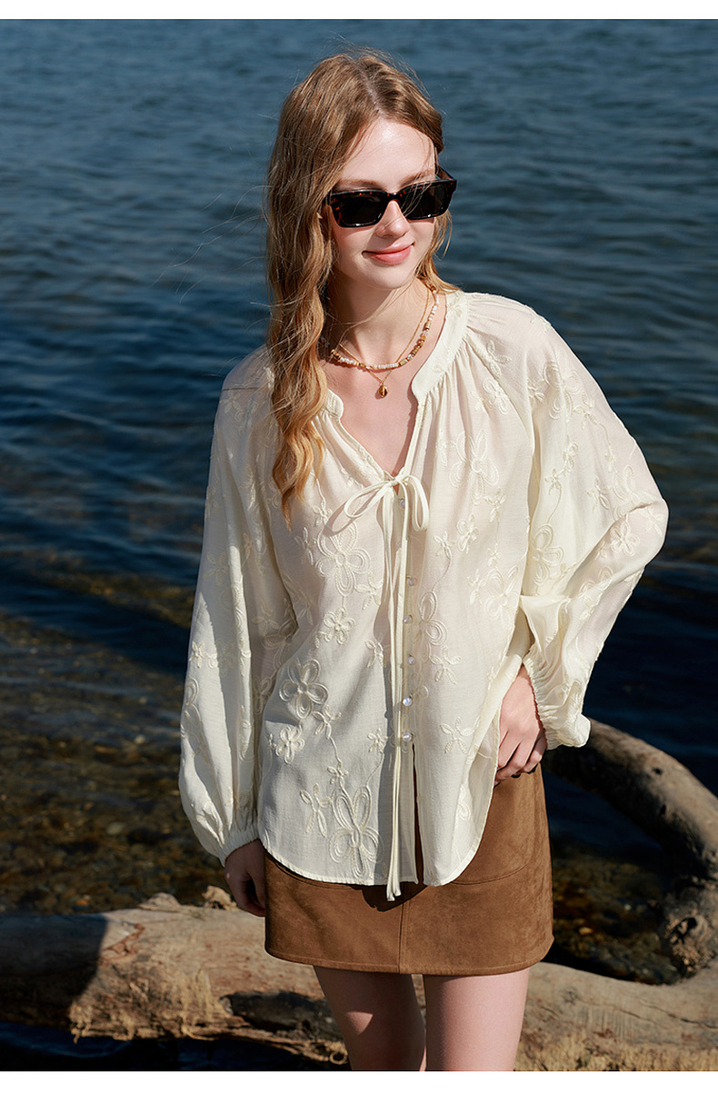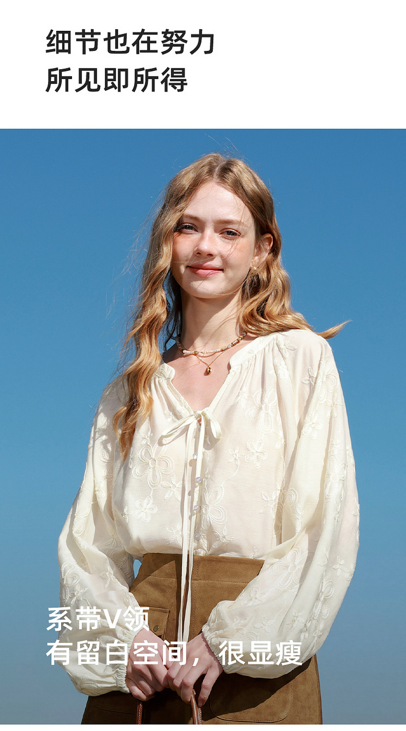 【醋酸】三彩2026春季新款V领绣花灯笼袖小衫复古衬衣宽松上衣M