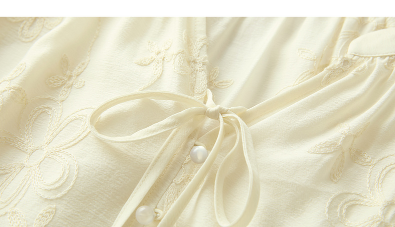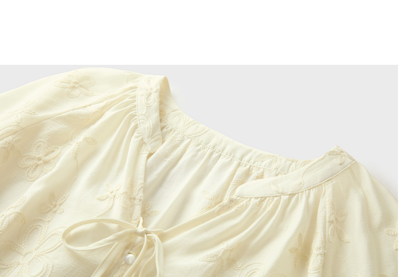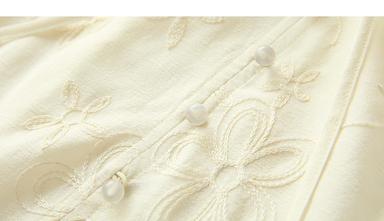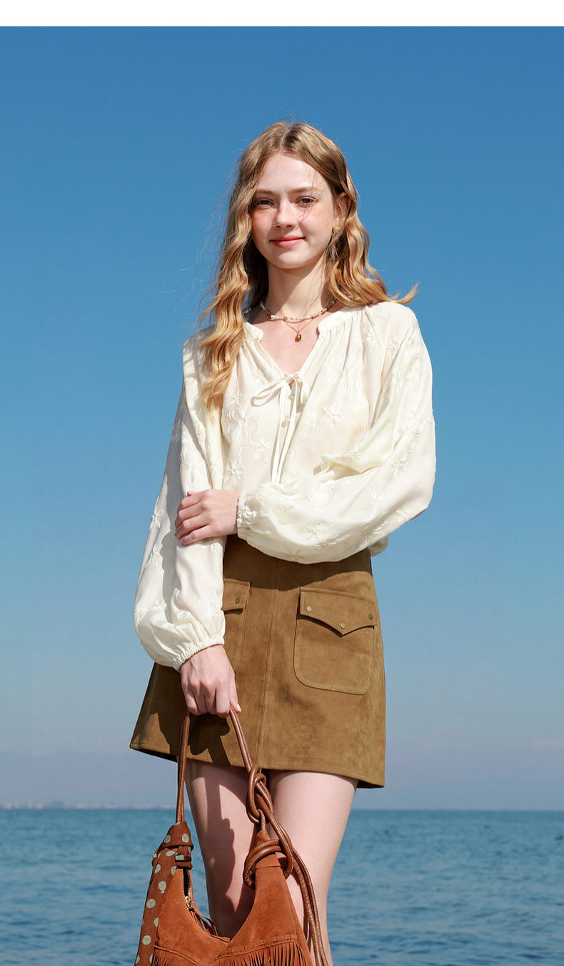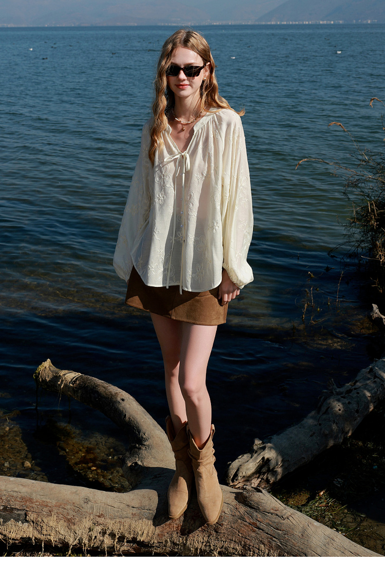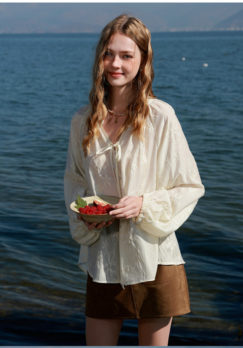 【醋酸】三彩2026春季新款V领绣花灯笼袖小衫复古衬衣宽松上衣M