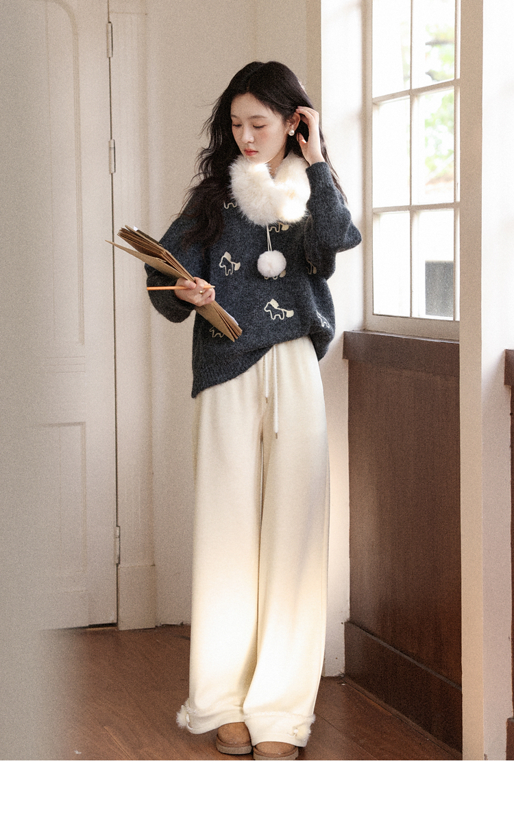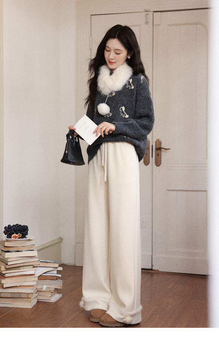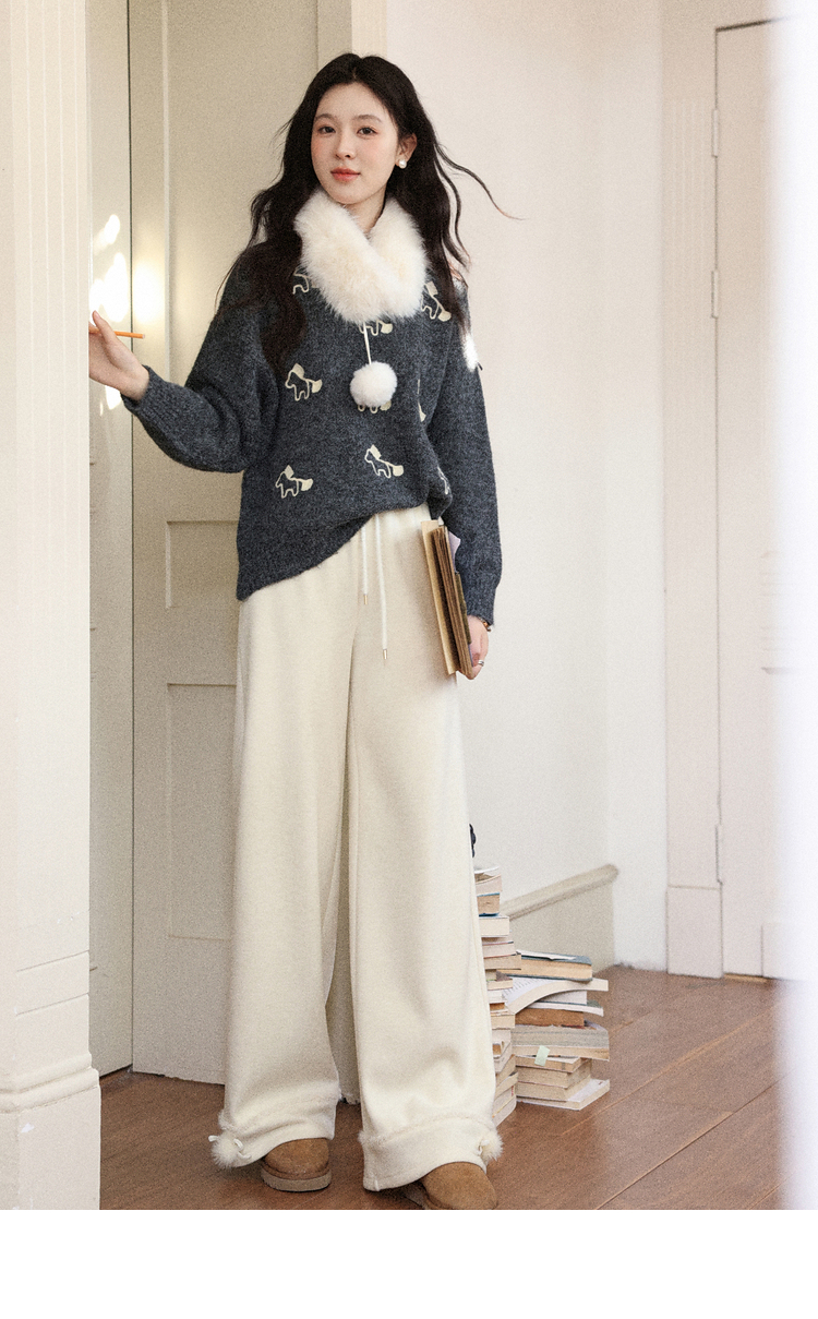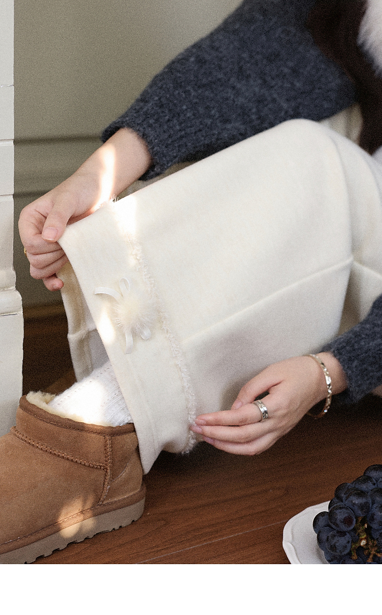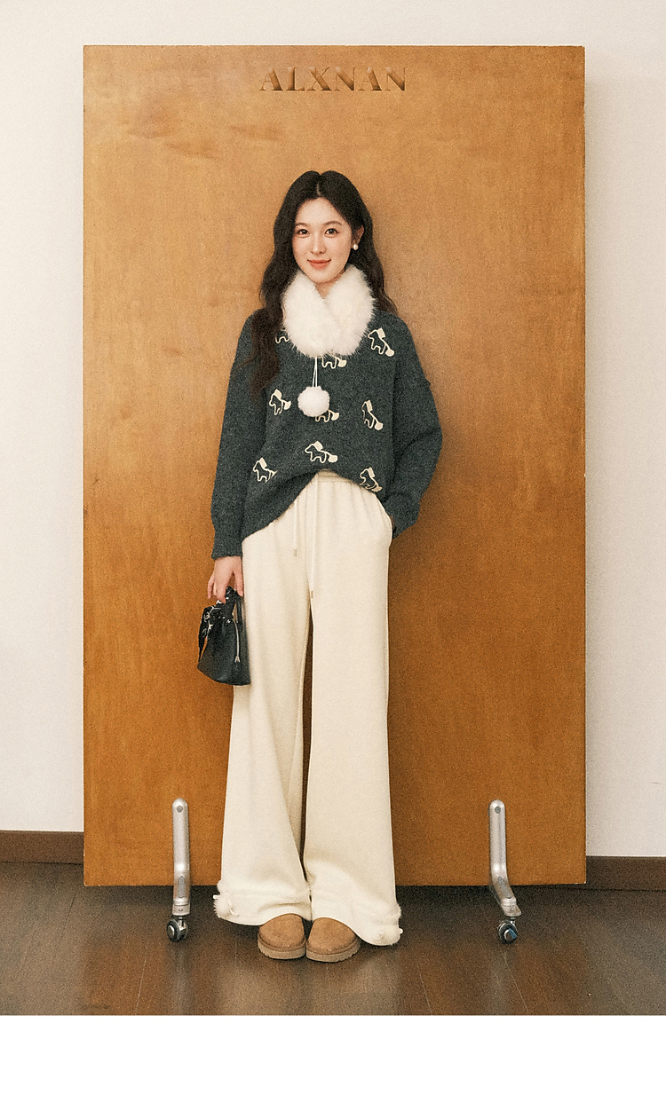 鹿向南「休闲软妹」杏色加绒休闲裤女秋冬宽松显瘦加厚阔腿长裤子