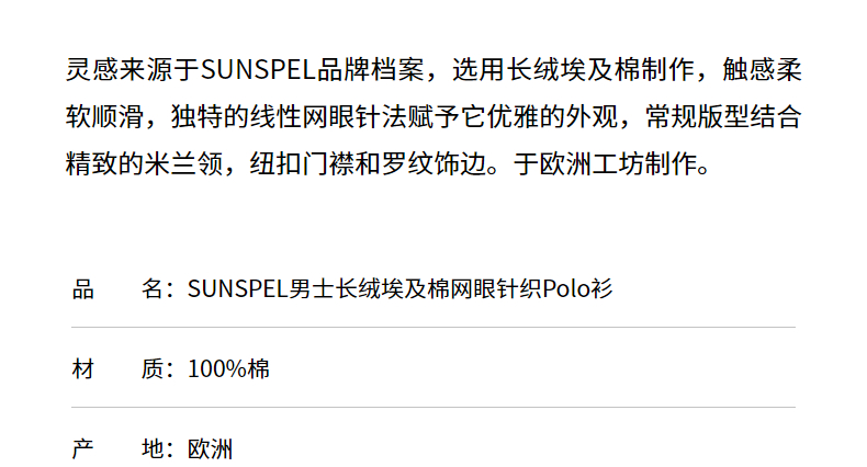 SUNSPEL男士春夏长绒埃及棉针织Polo衫透气舒适休闲