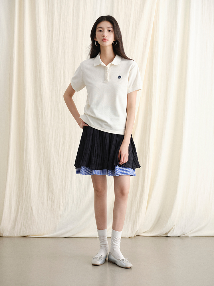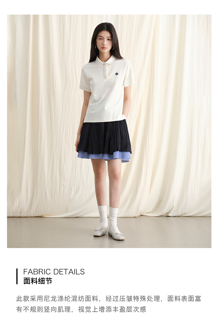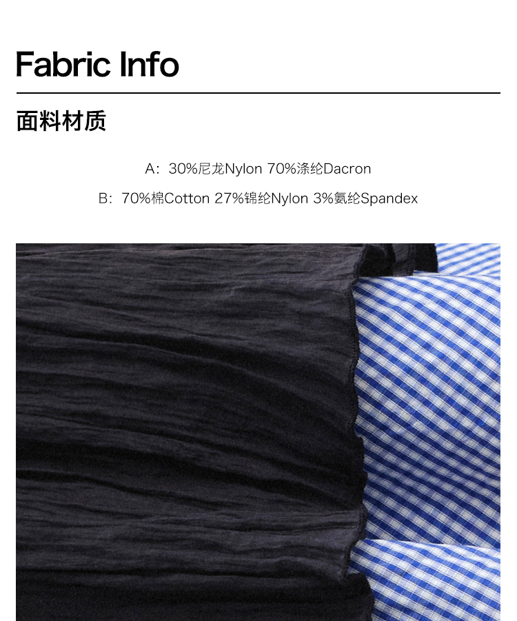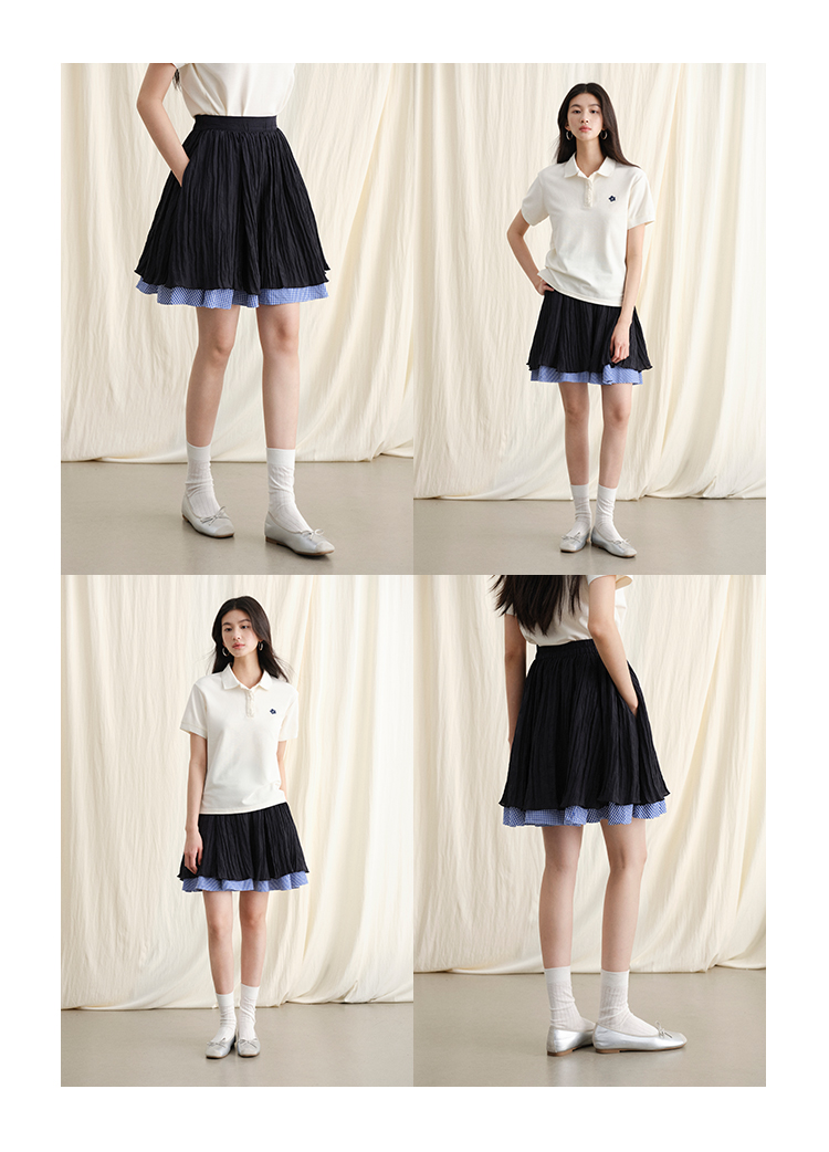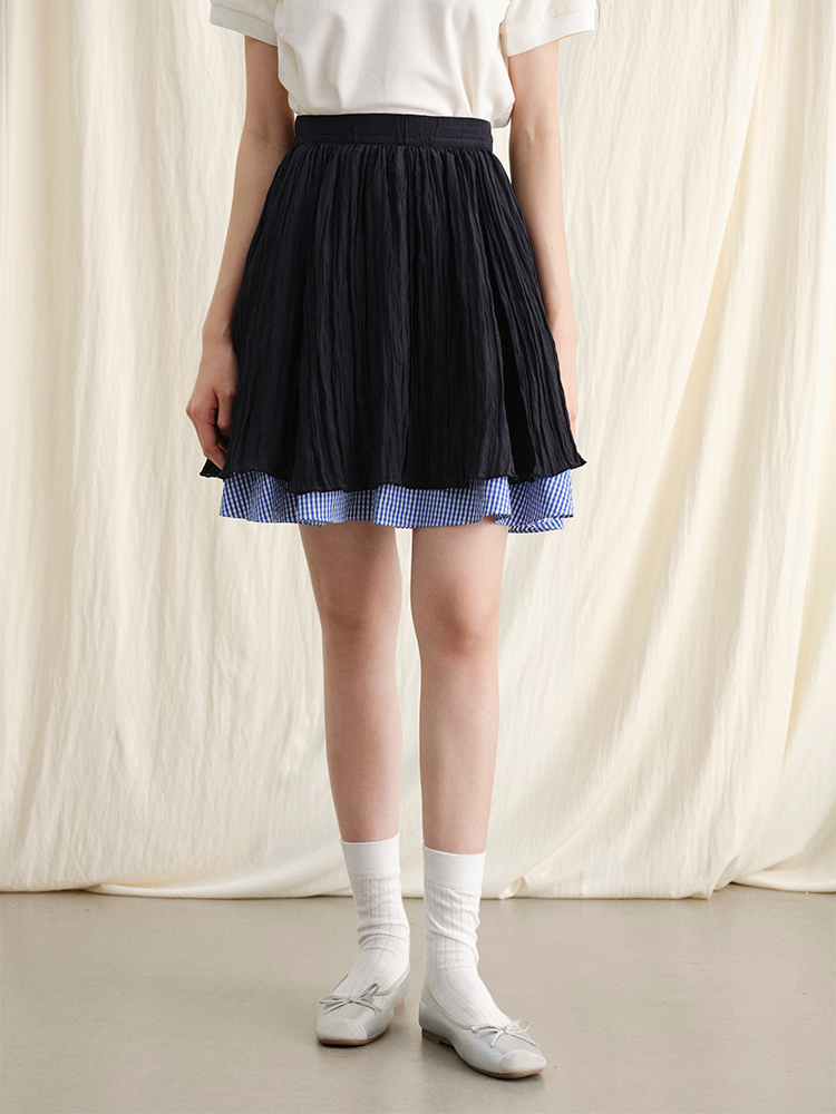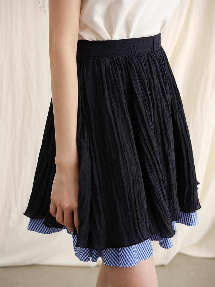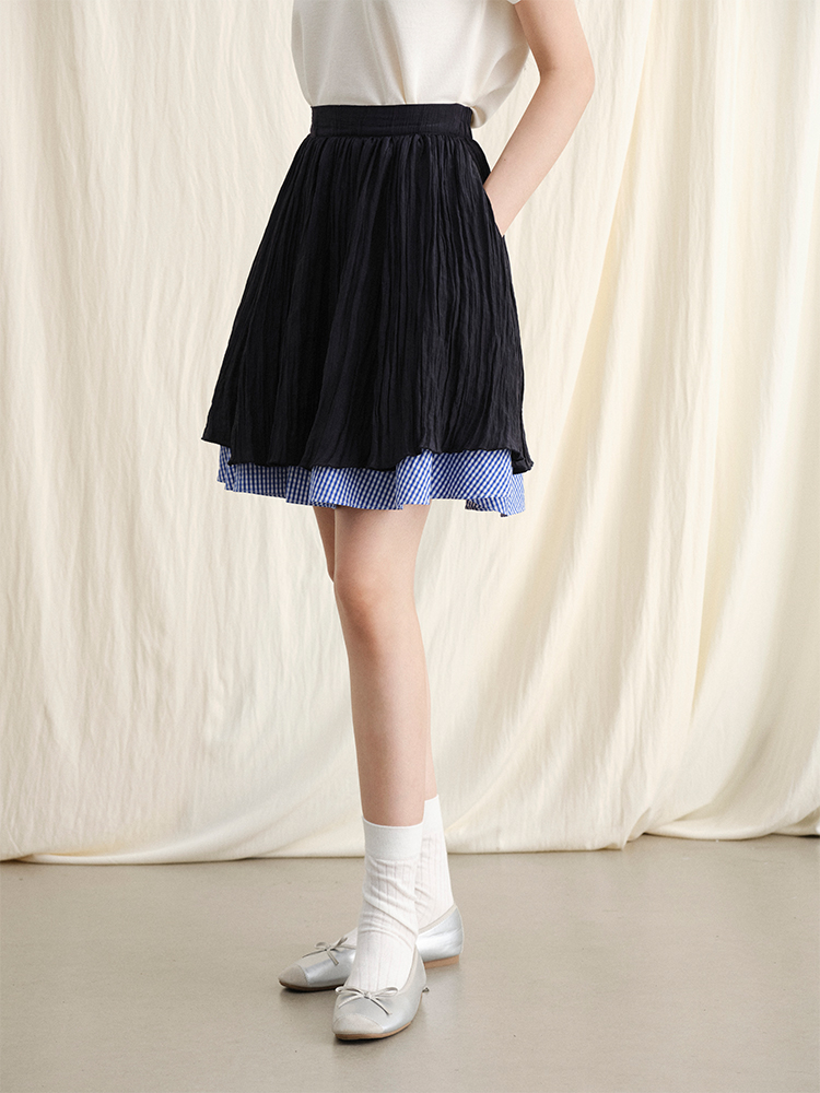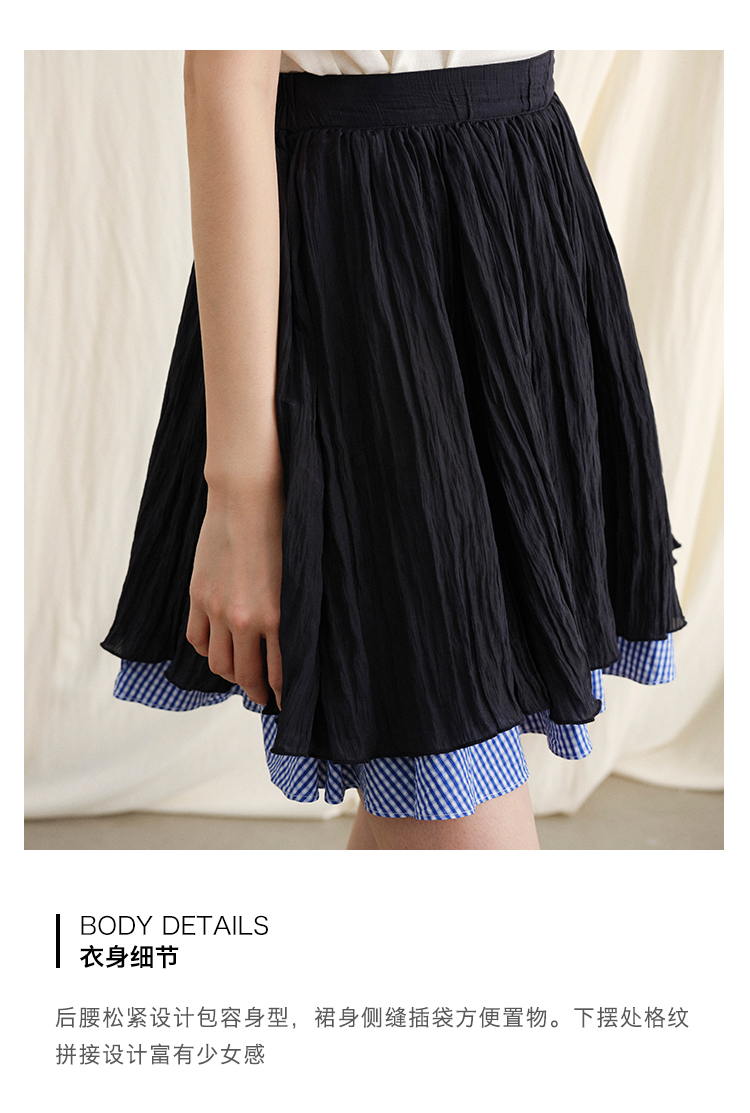 ForPoem 现货 24/SS原创设计夏季褶皱肌理感拼接格子下摆蓬蓬半身裙