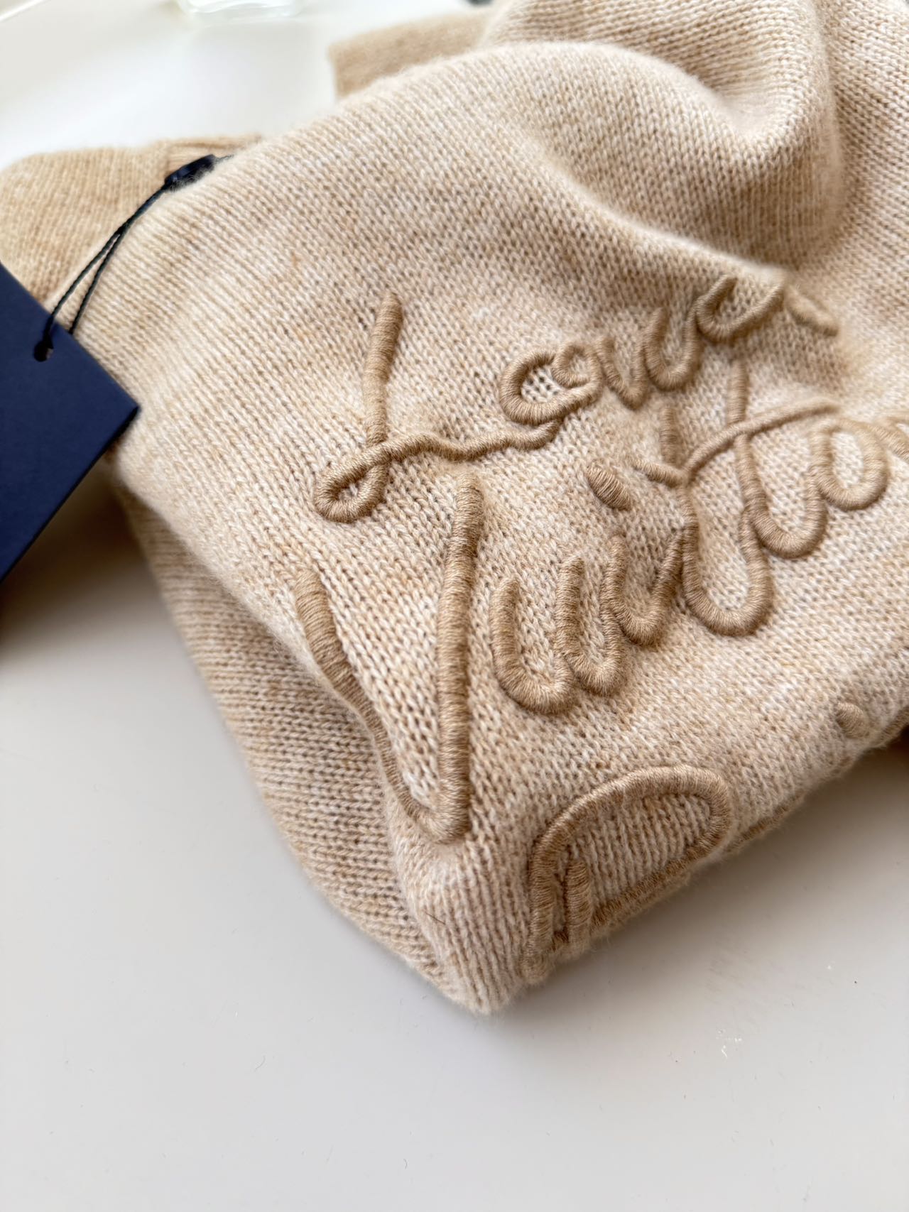 细节:同色系浮雕工艺让Logo与针织面料融为一体,背部饰有LV皮革标识贴片,罗纹收口采用双针车线加固。