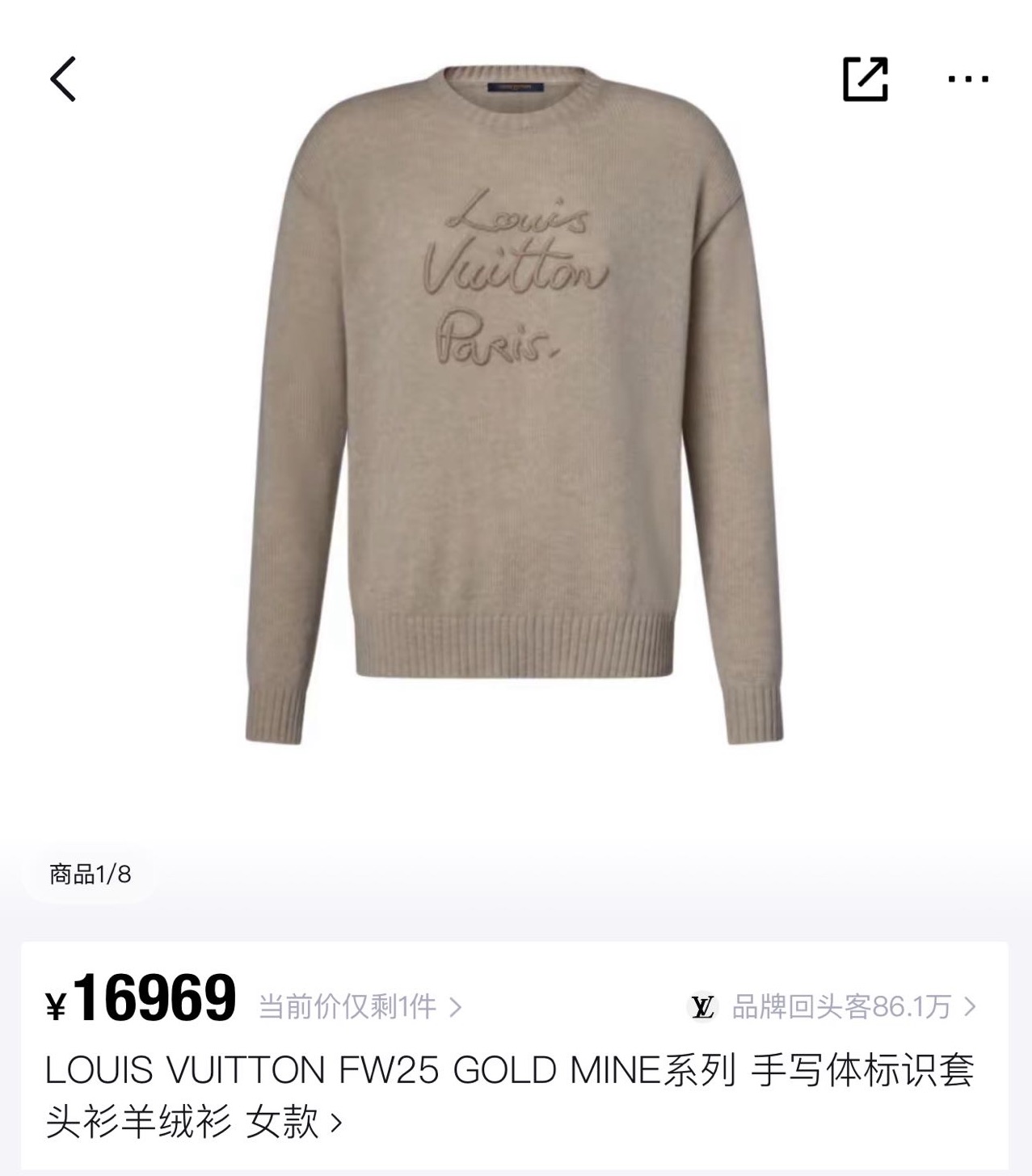 定价:中国二级市场售价约¥8000-12000💰,LV欧洲官网同类型浮雕针织衫定价1350欧元(1AHZCW款),北美官网压纹套头衫定价**$2380**(1AIWG5款)。
