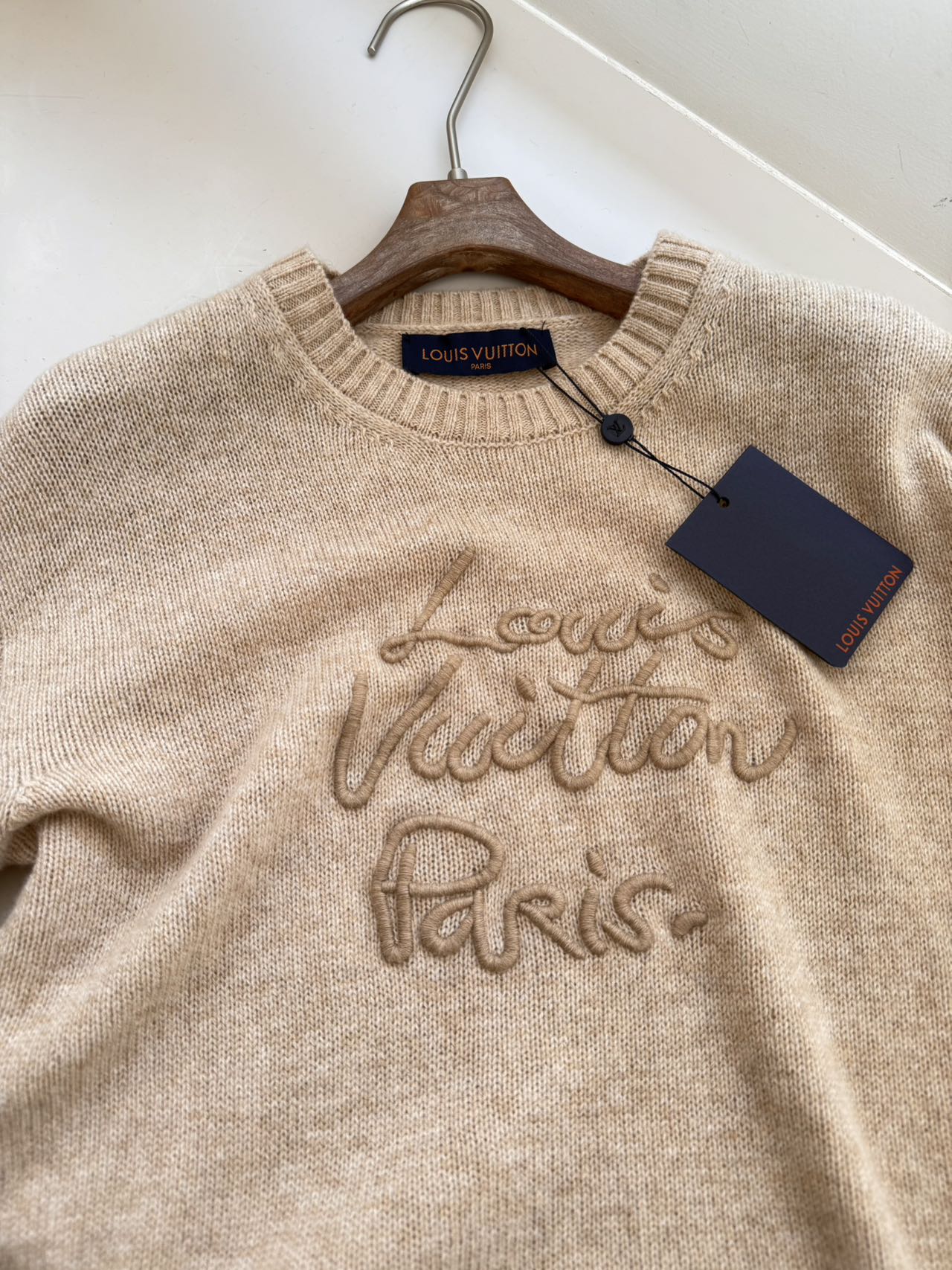 ◦ 衣身有手写体“Louis Vuitton Paris”浮雕提花,背部下摆处饰有LV老花皮革贴片(头层牛皮材质),领口/袖口/下摆为双针车线罗纹收口。