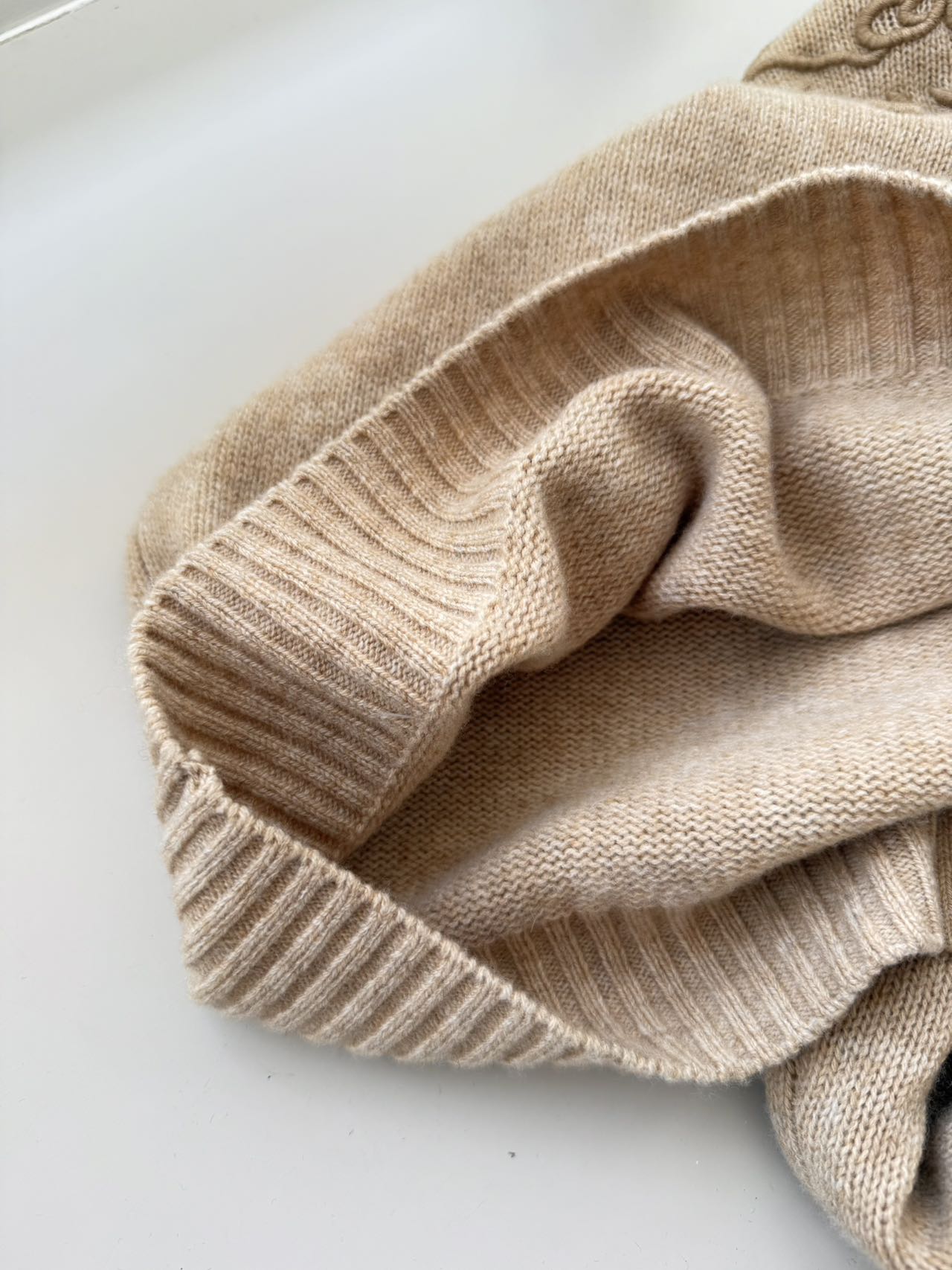 材质:采用100%有机棉(基础款)/73%羊毛+18%羊绒混纺(高端款),意大利织造,触感柔软且有肌理感,罗纹领口/袖口/下摆弹性持久。
