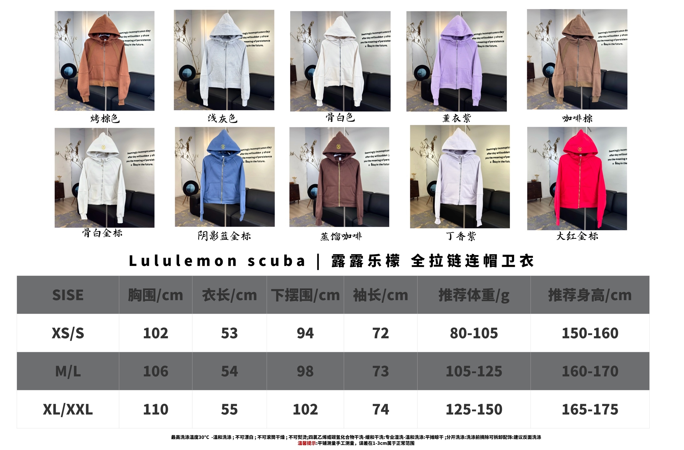 𝗟𝘂𝗹𝘂𝗲𝗺𝗼𝗻 𝘀𝗰𝘂𝗯𝗮 | 露露乐檬 全拉链连帽卫衣 𝗦𝗶𝘇𝗲: 𝗫𝗦/𝗦 𝗠/𝗟 𝗫𝗟/𝗫𝗫𝗟 产品颜色:薰衣紫、骨白色、咖啡棕、浅灰色、烤棕色、蒸馏咖啡金标、骨白金标、红色金标、白蛋白金标、 丁香紫、阴影蓝金标