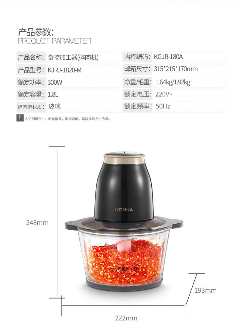 康佳(KONKA) 绞肉机家用多功能蒜泥婴儿辅食碎肉机KJRJ-1820-M