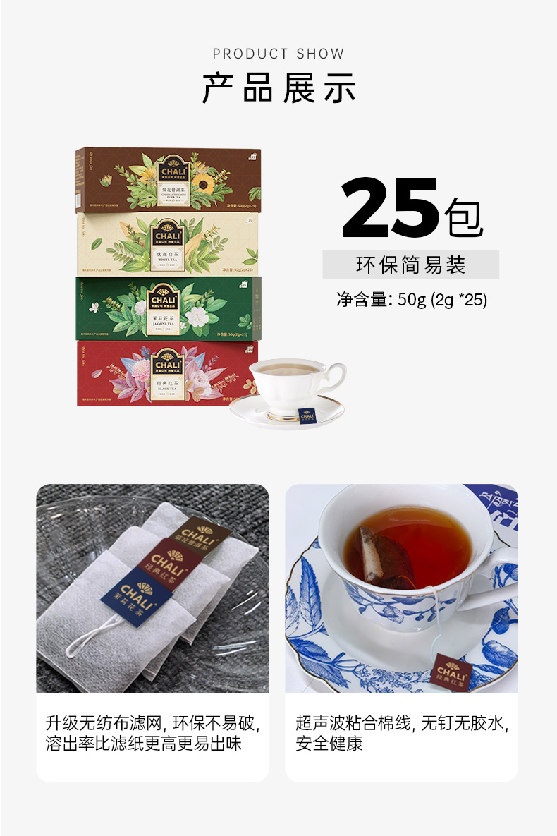 规格一:经典红茶50g (2g*25包)*1盒+茉莉花茶50g (2g*25包)*1盒