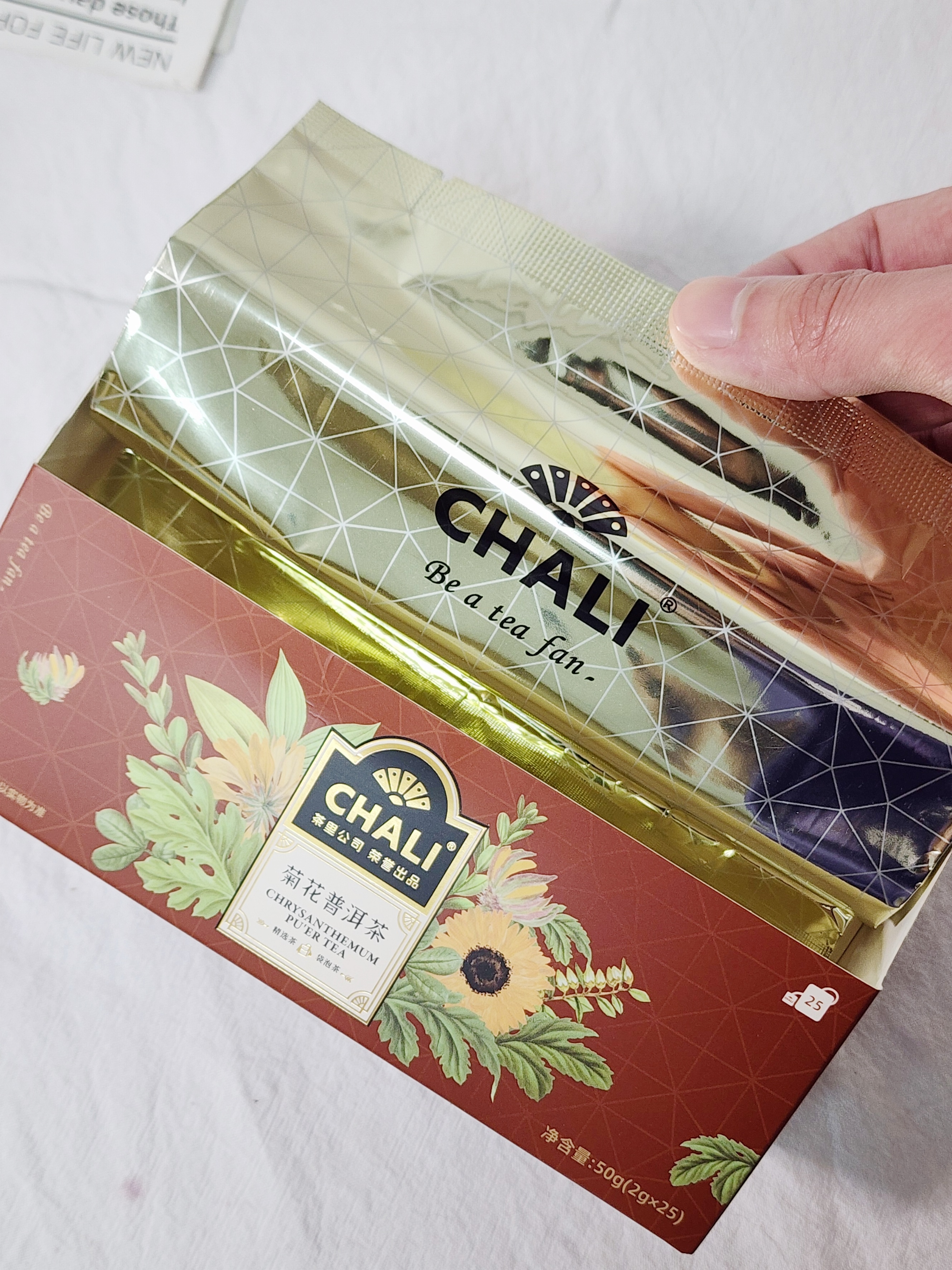 规格四:茉莉花茶50g (2g*25包)*1盒+菊花普洱50g (2g*25包)*1盒