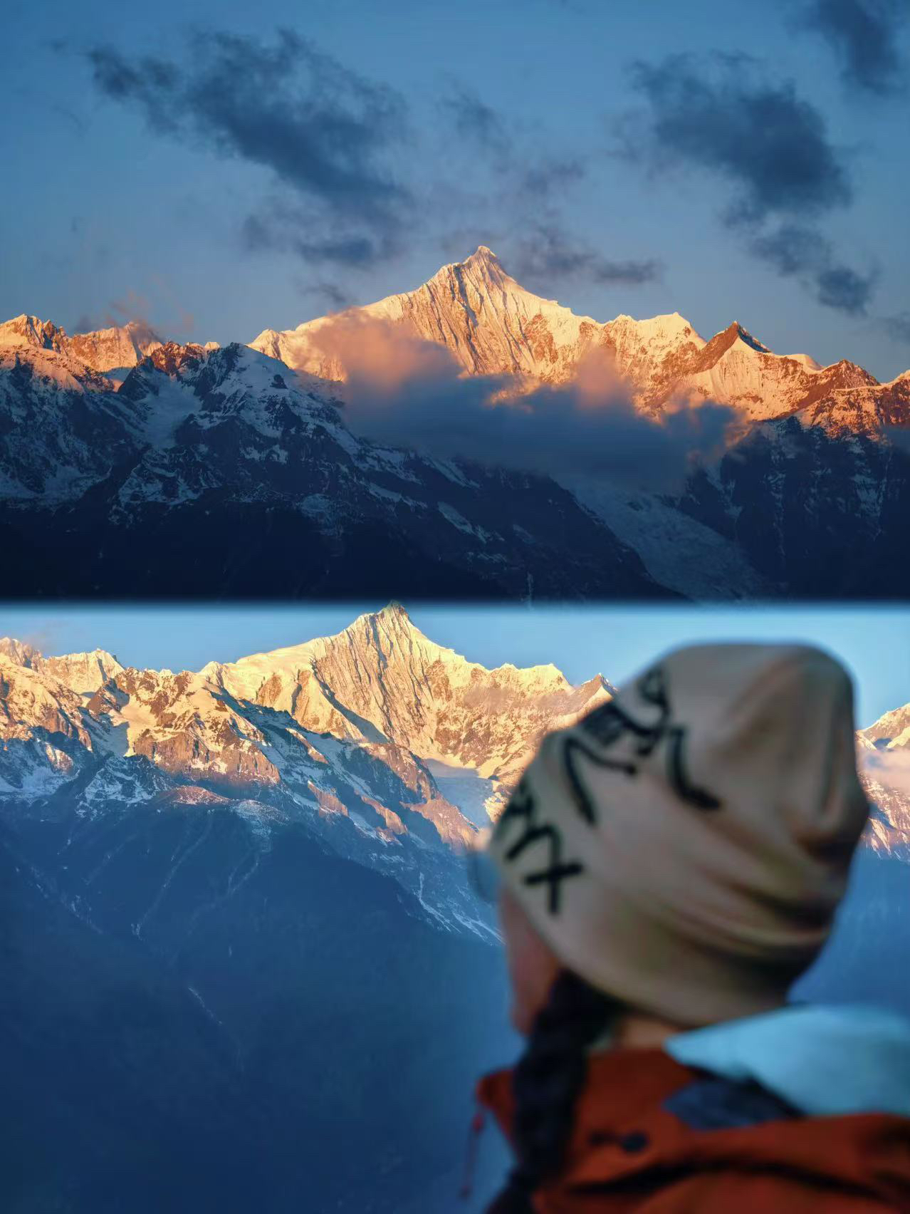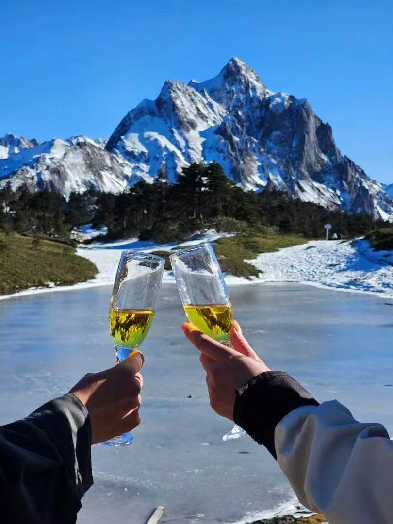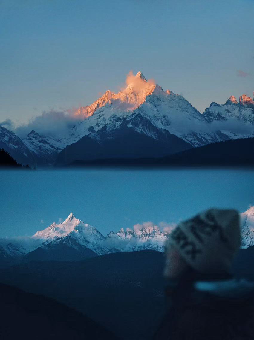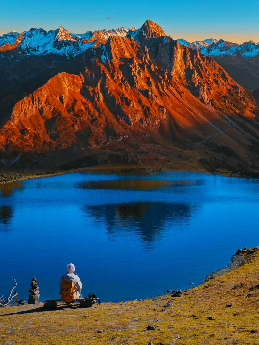 孔雀山徒步全程4-5公里,海拔爬升100米左右,新手友好。在这里徒步有点南极洛同款风景的感觉,可以看到"天心十二湖"高山湖泊群,晴天湖水如蓝宝石,在垭口还可能看到梅里雪山群峰的日照金山景象。